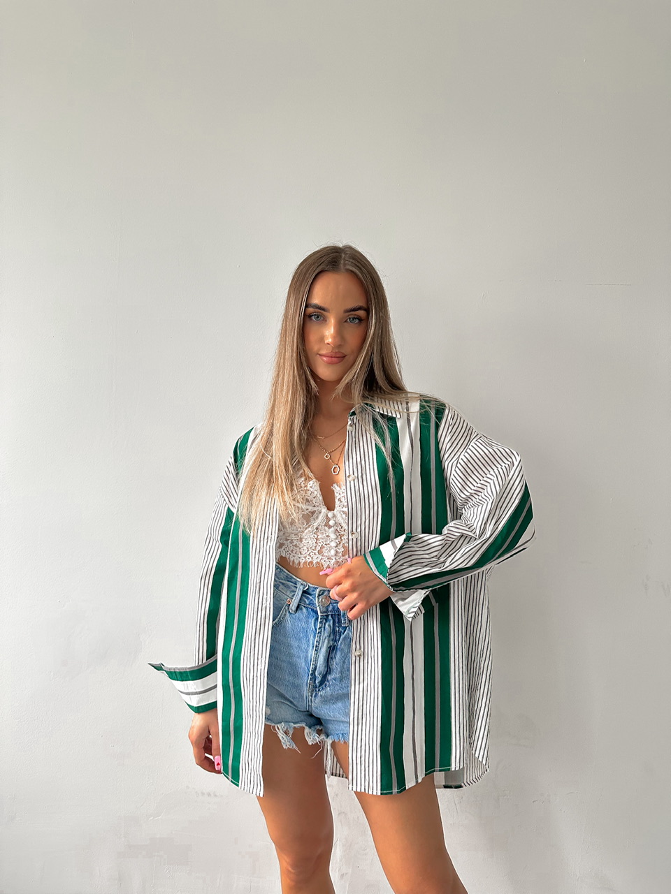 Prúžkovaná košeľa, ktorá má dlhý rukáv a zapínanie na gombíky.