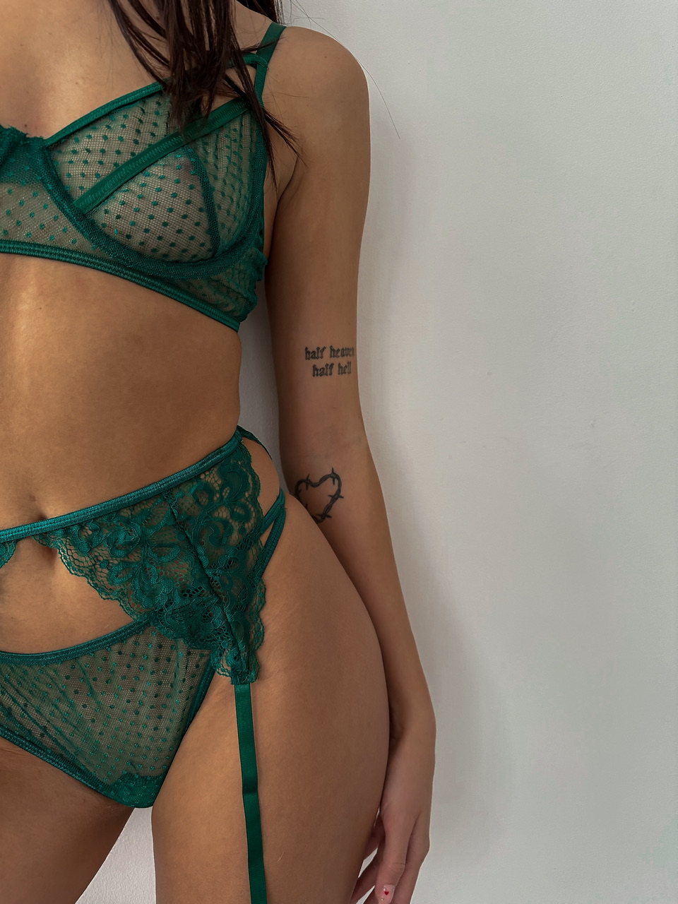 3- dielne čipkované spodné prádlo skladajúce sa z podprsenky, nahavičiek a podväzkov.