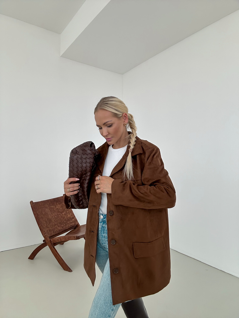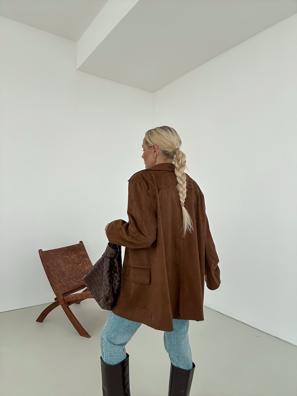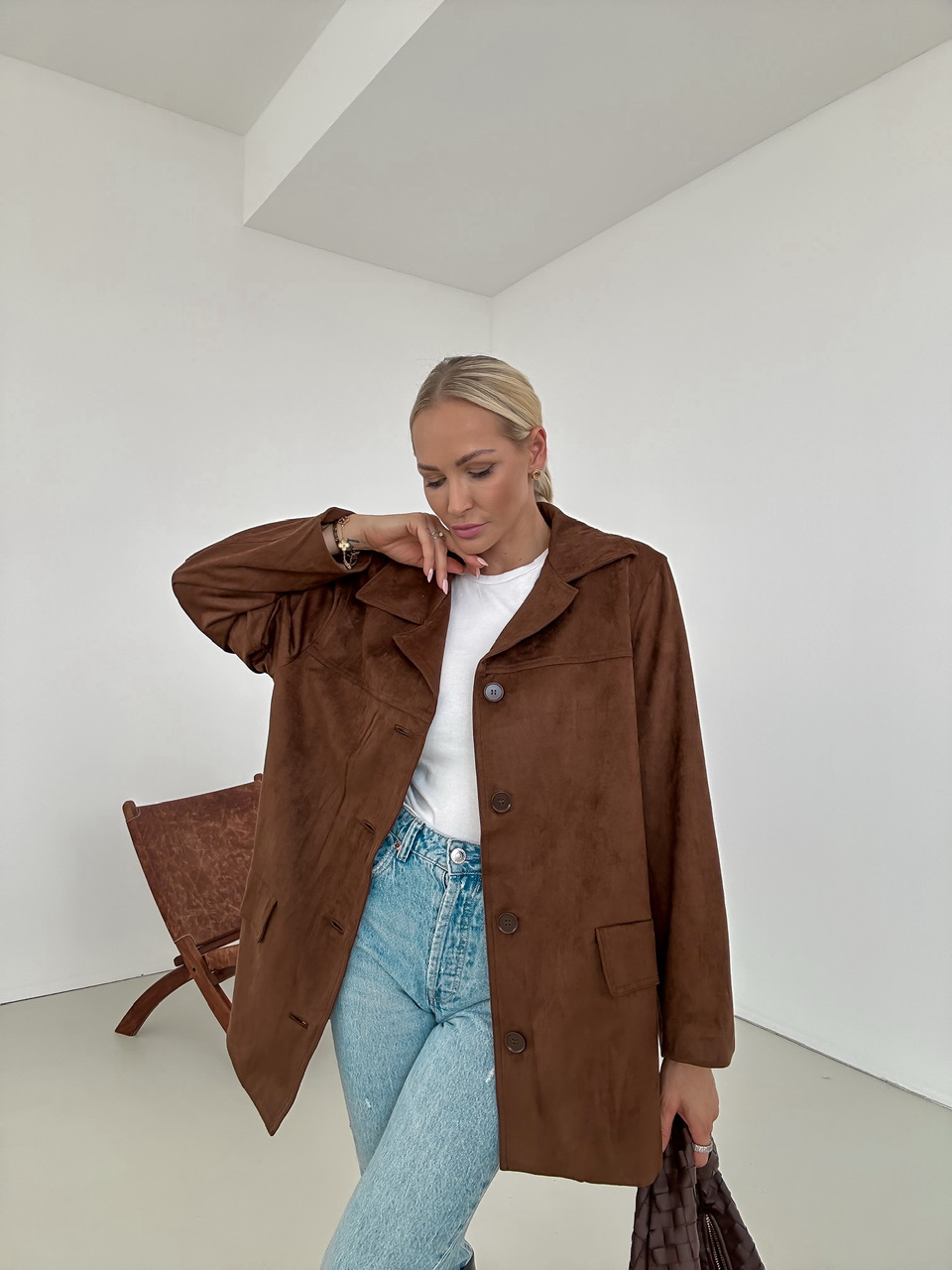 Kabát so vzhĽadom brúsenej koženky, ktorý má jednoradové zapínanie na gombiky. Falošné predné vrecká.