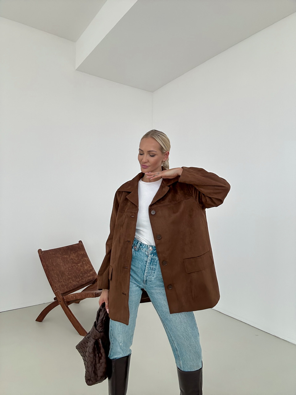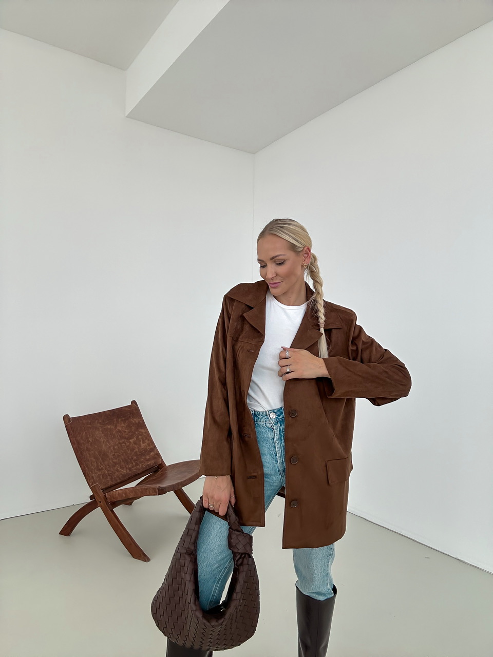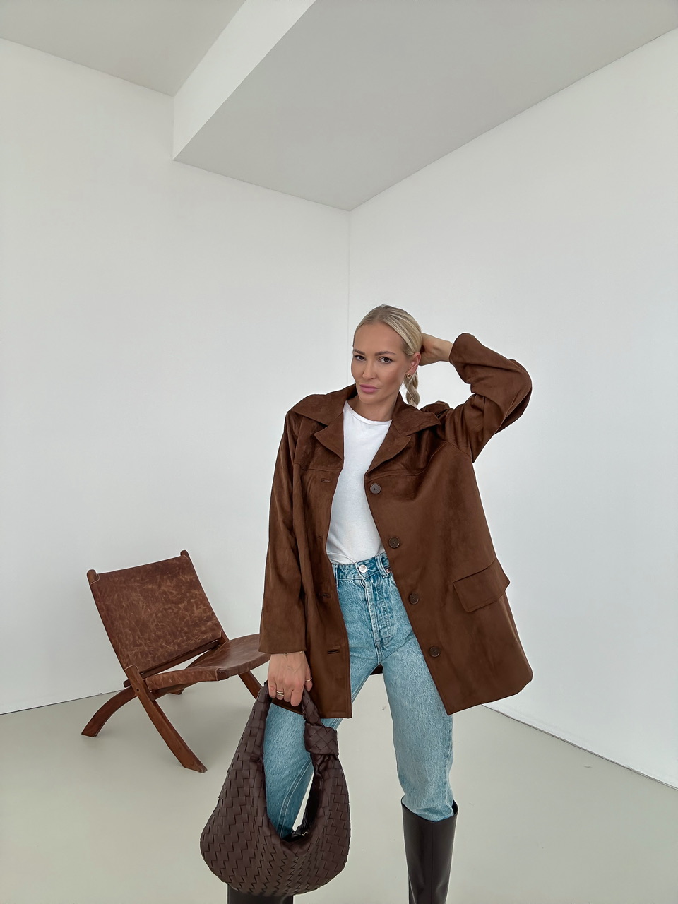 Kabát so vzhĽadom brúsenej koženky, ktorý má jednoradové zapínanie na gombiky. Falošné predné vrecká.