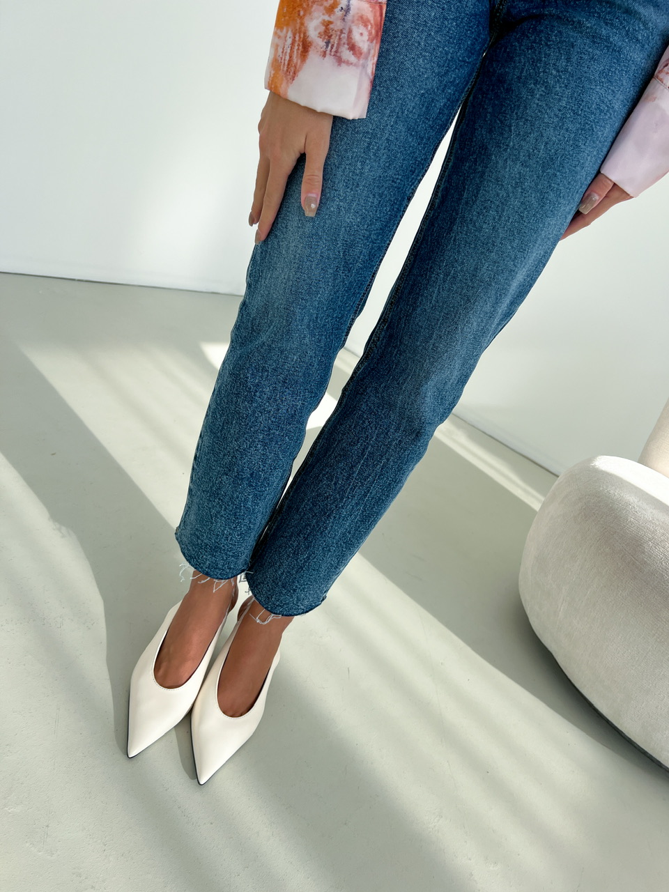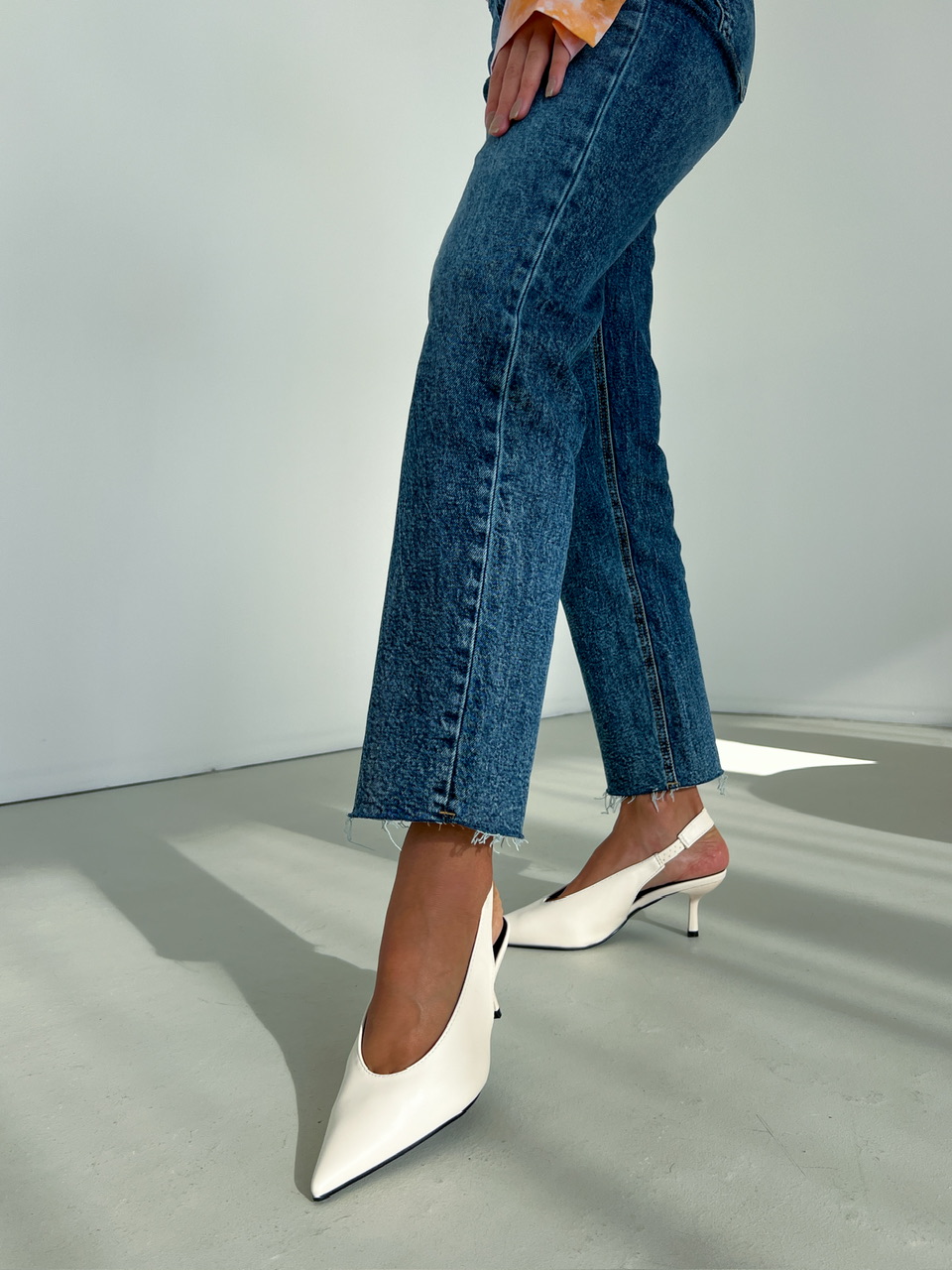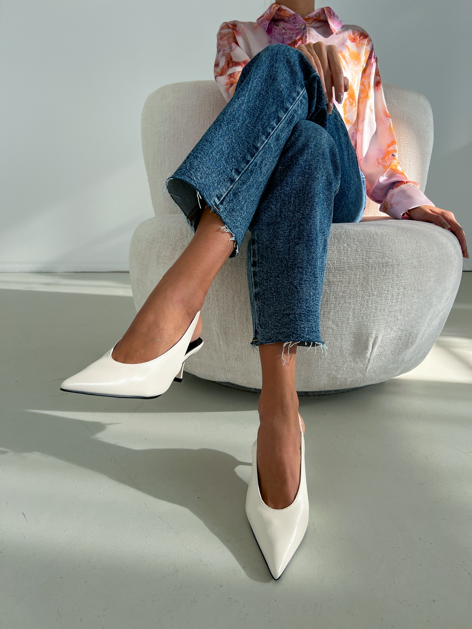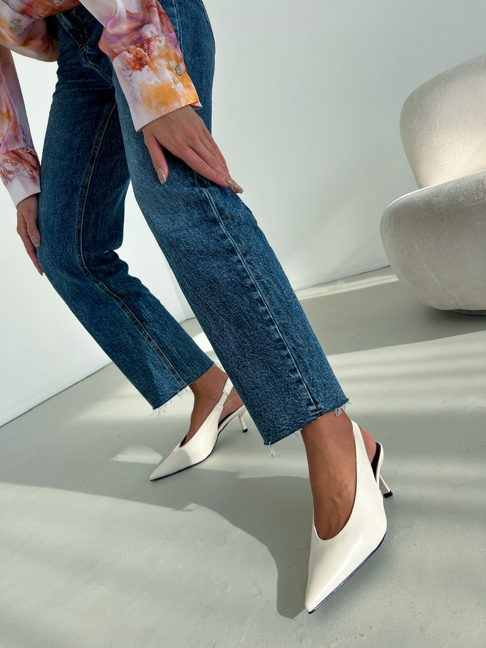 Vysoké topánky na tenkom podpätku (cca 7 cm). Zadná časť päty je otvorená.
