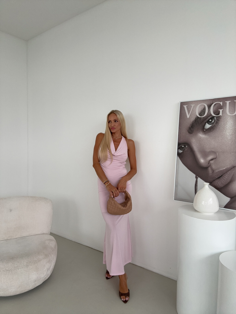 Tieto elegantné maxi šaty sú stelesnením ženskosti a sofistikovaného štýlu. Ich priliehavý strih krásne zvýrazňuje siluetu, zatiaľ čo rafinovaný drapovaný výstrih a odhalený chrbát dodávajú outfitu zmyselný, no zároveň vkusný vzhľad. Šaty sú ideálne na špeciálne príležitosti, letné večierky, svadby či romantické večere. Sú vyrobené z elastického a pohodlného materiálu, ktorý sa prispôsobí telu a poskytne maximálne pohodlie počas nosenia.Doplnené sú o jemné detaily, ako je asymetrické ramienko.