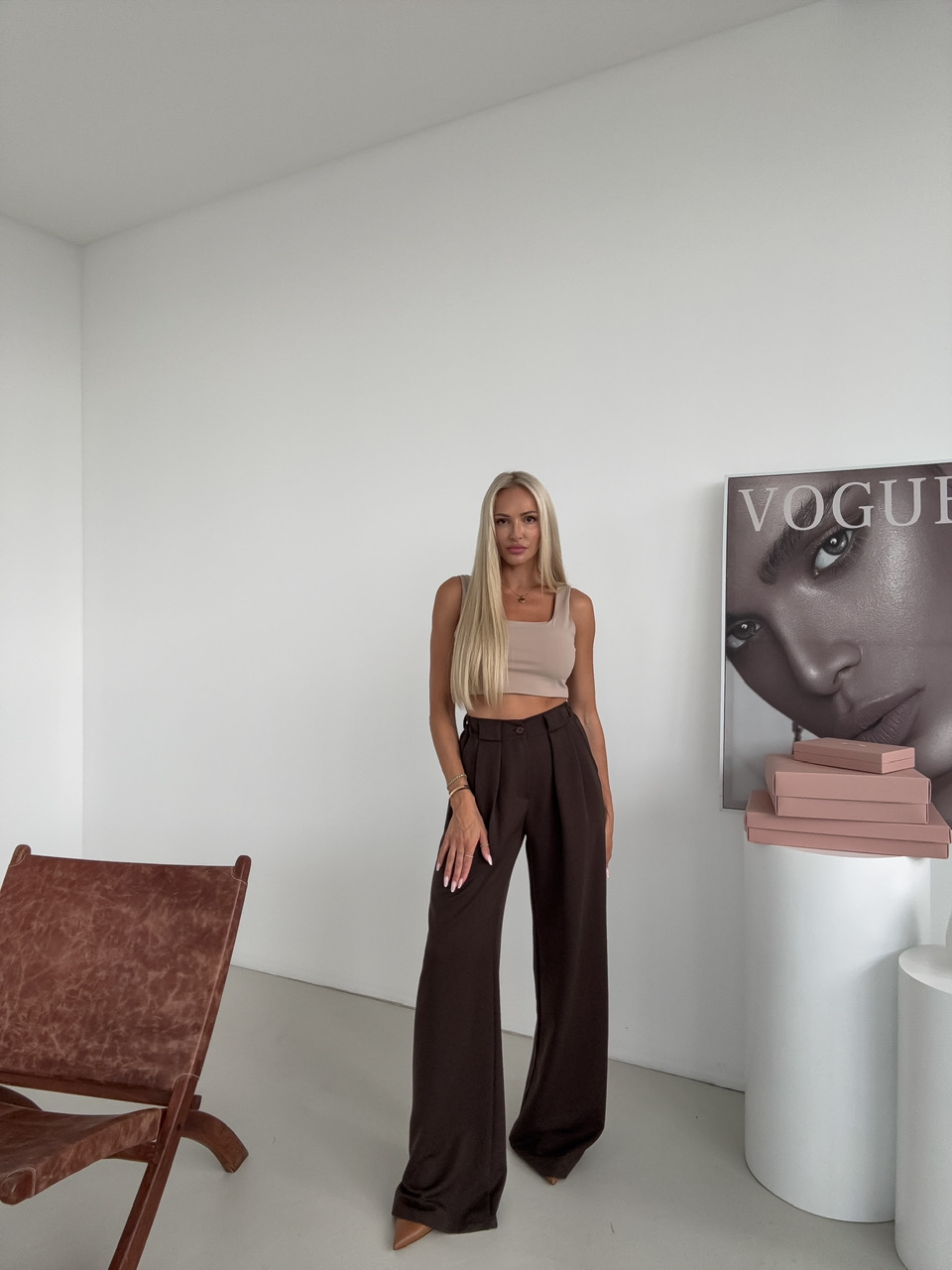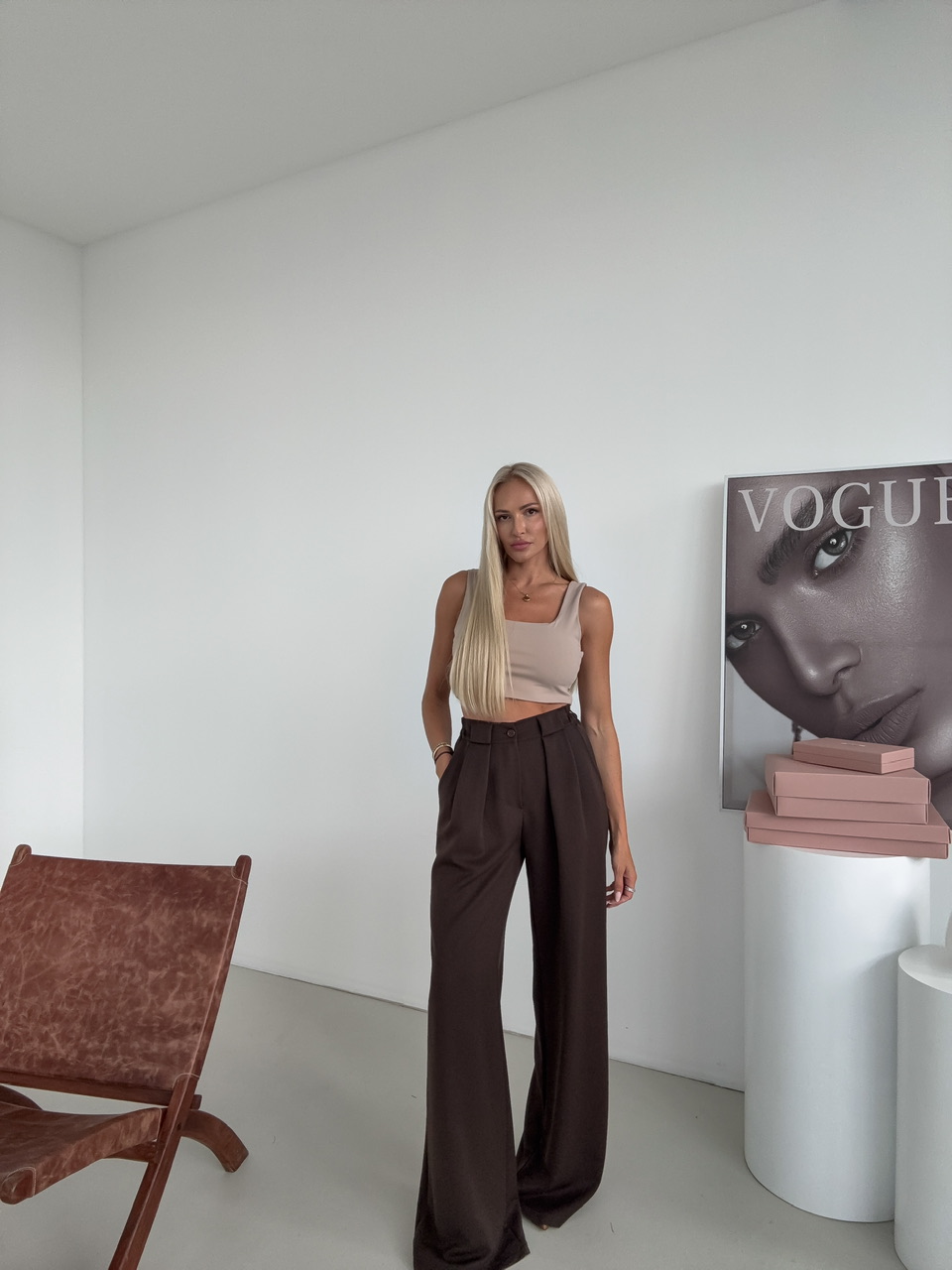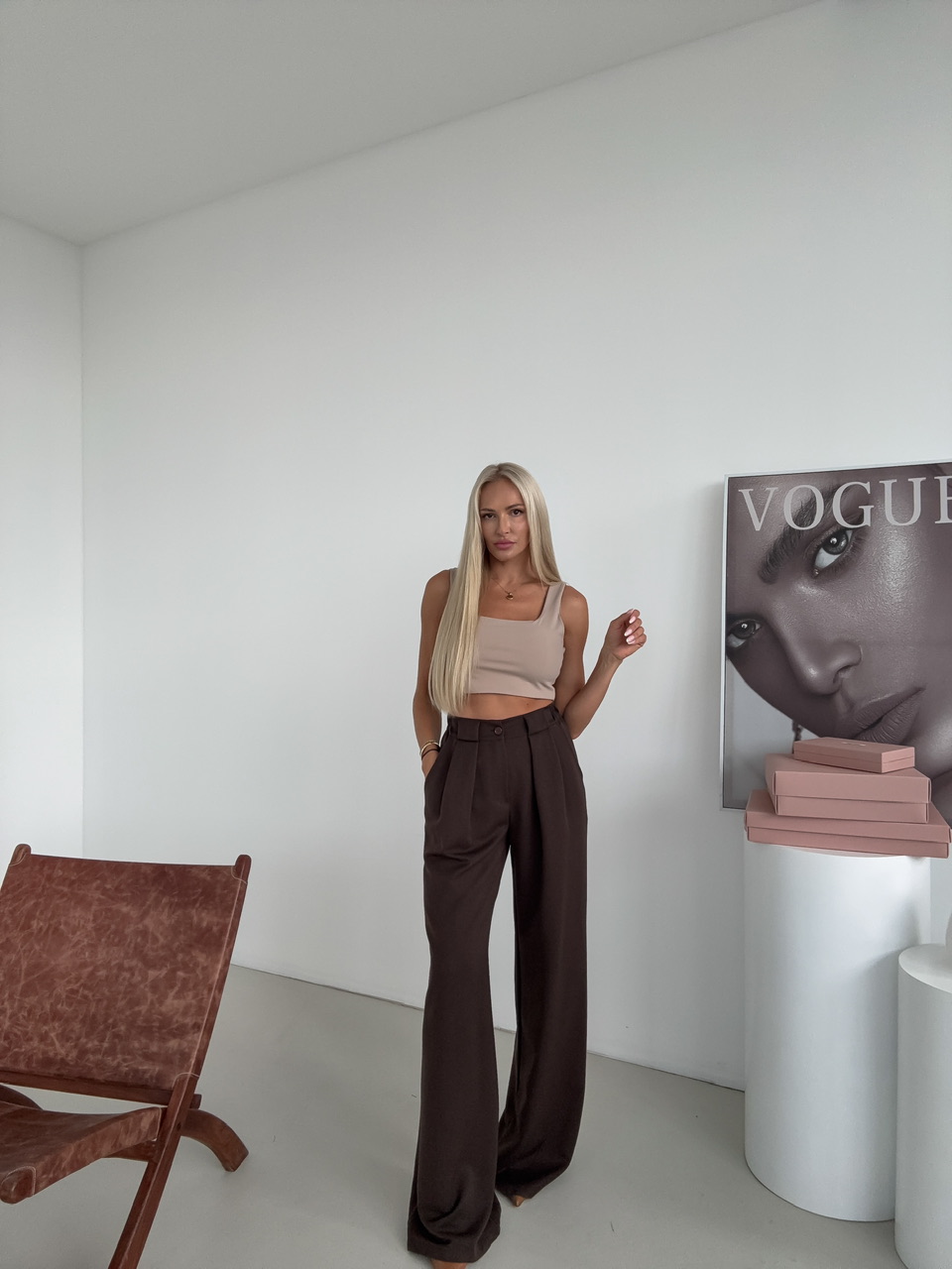 Štýlové dámske nohavice sú skvelou voľbou pre moderný a zároveň pohodlný outfit. Vďaka voľnejšiemu strihu a elastickému pásu so zapínaním na gombík poskytujú maximálne pohodlie počas celého dňa. Jemný materiál pôsobí elegantne a ľahko sa kombinuje s rôznymi kúskami. Tieto nohavice môžete zladiť so sakom v rovnakej farbe pre dokonalý komplet, alebo ich nosiť samostatne so svetrom či blúzkou pre ležérny look.