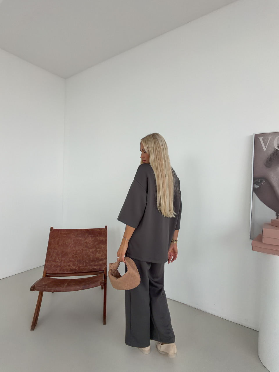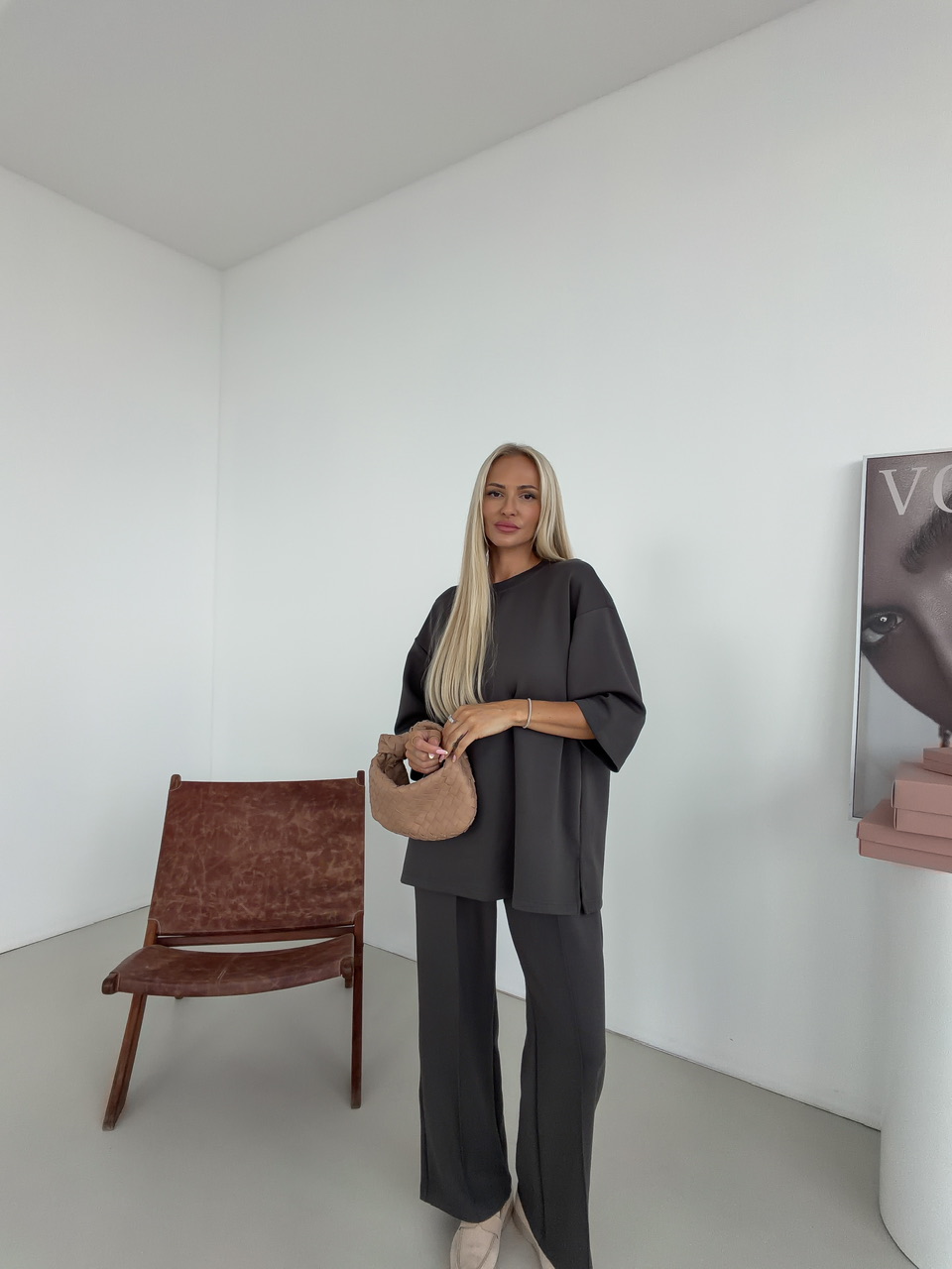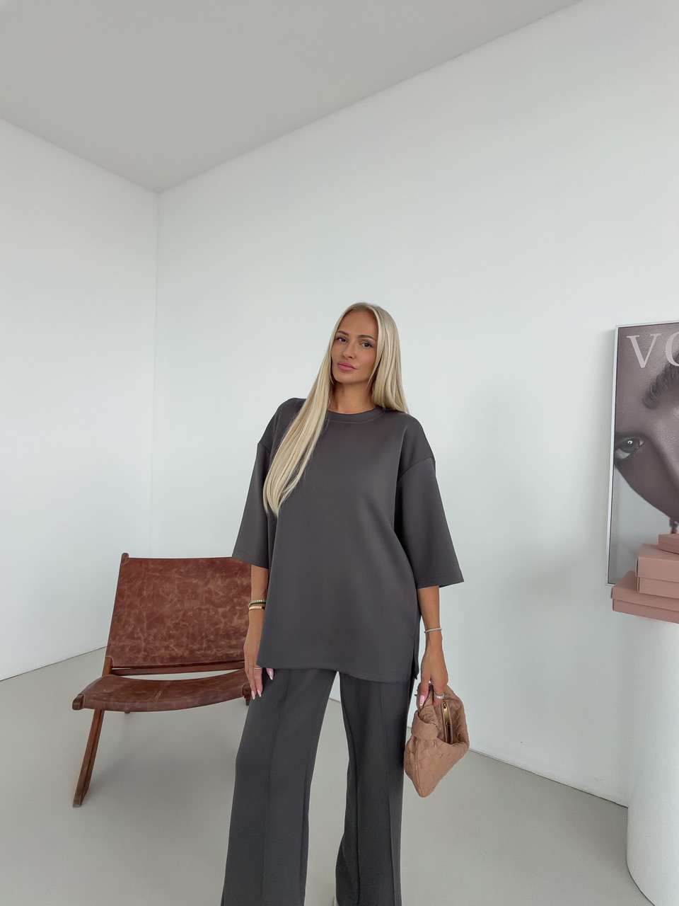 Teplákový komplet, skladajúci sa z oversize mikiny s krátkym rukávom, bez zapínania. Široké hladké nohavice bez vreciek