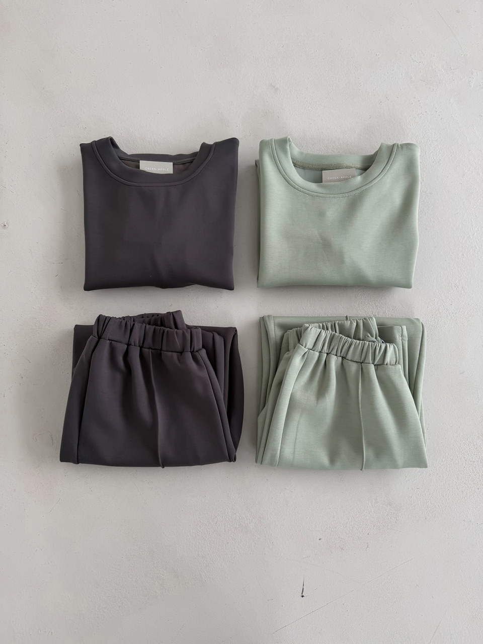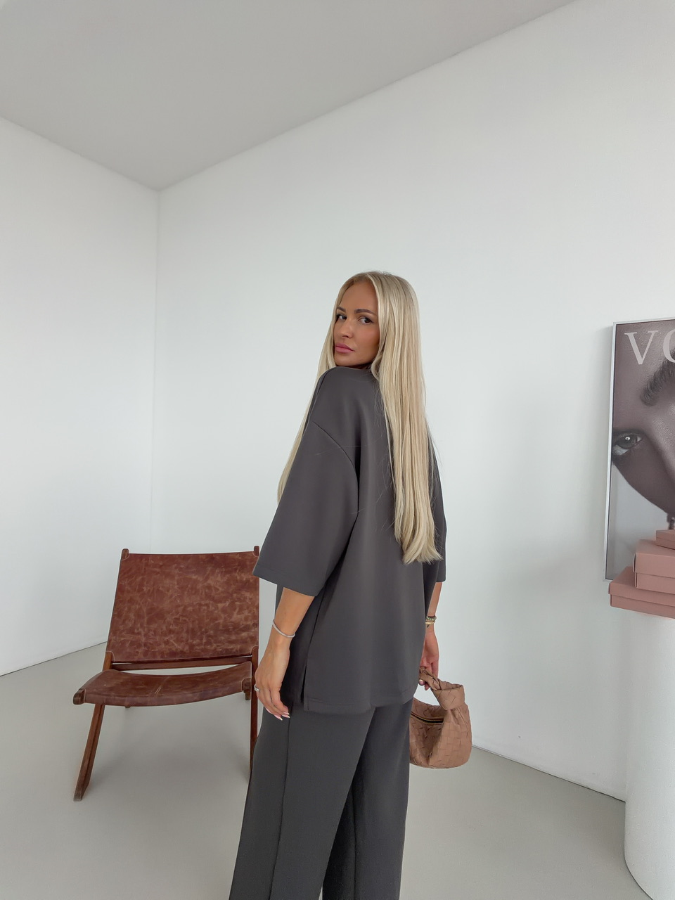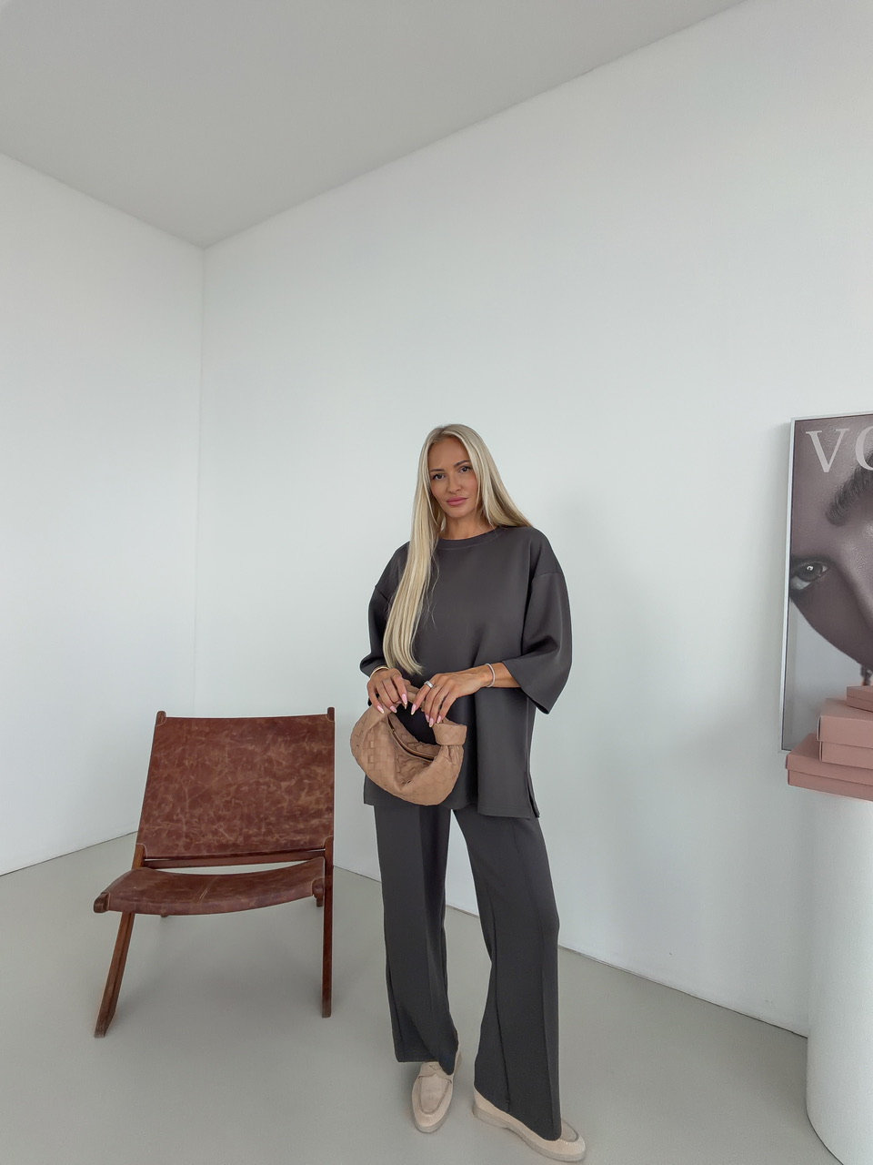 Teplákový komplet, skladajúci sa z oversize mikiny s krátkym rukávom, bez zapínania. Široké hladké nohavice bez vreciek