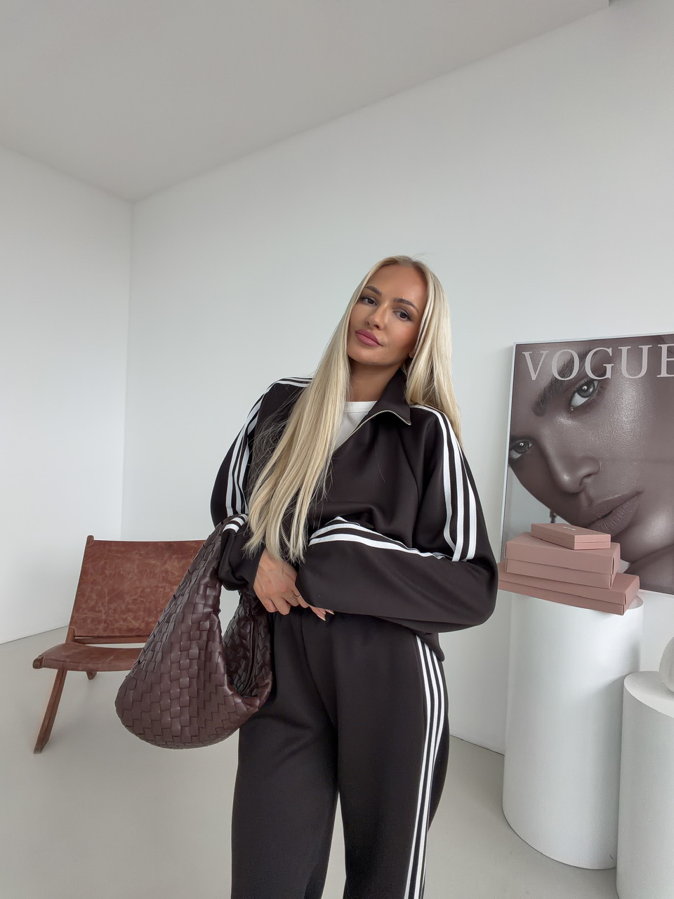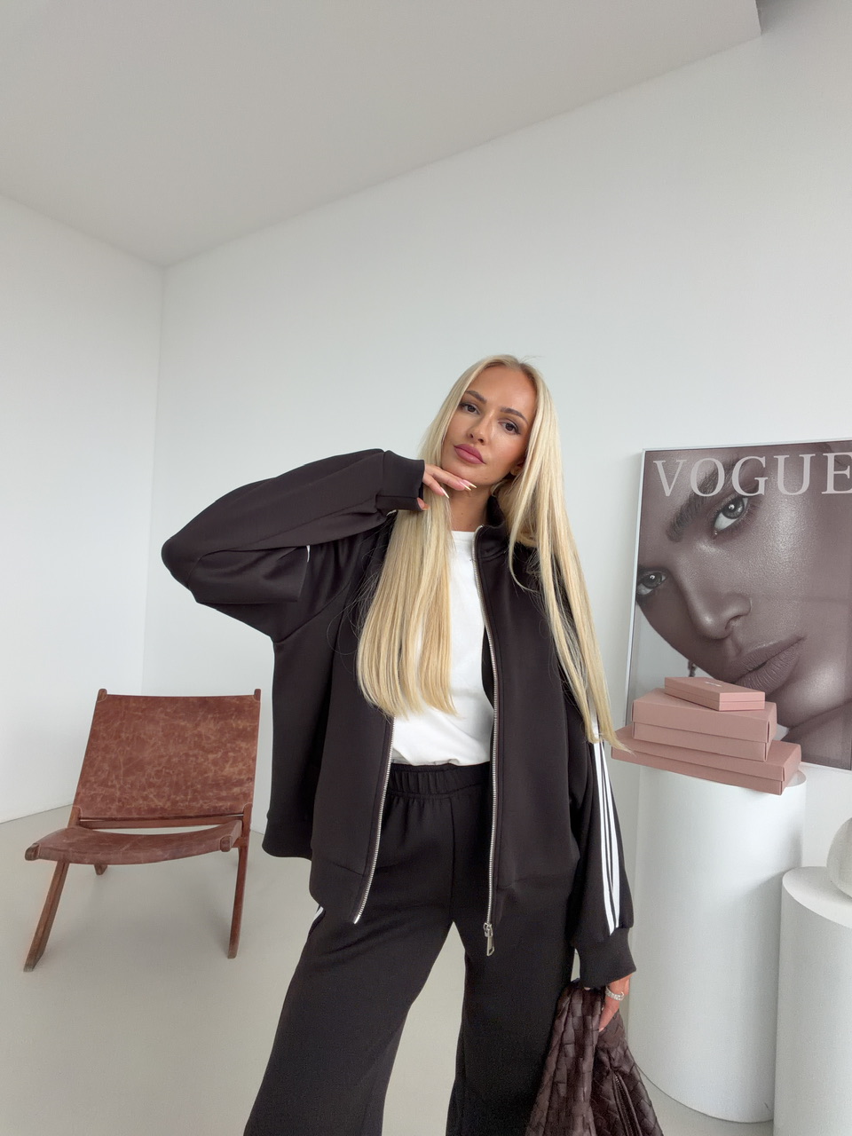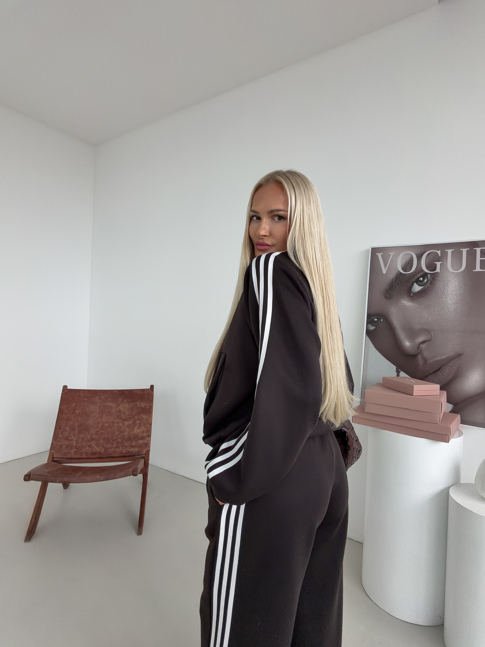 Štýlová a pohodlná súprava, ktorá spája športovú voľnosť s modernou eleganciou. Vyrobená z mäkkého a príjemného materiálu, ideálna na voľný čas aj každodenné nosenie. Mikina: zips, vysoký golier, kontrastné pruhy na rukávoch. Nohavice: rovný strih, bočné kontrastné pruhy, elastický pás pre pohodlie. Perfektná na cesty, tréning aj relax – budeš v nej vyzerať moderne a cítiť sa pohodlne.