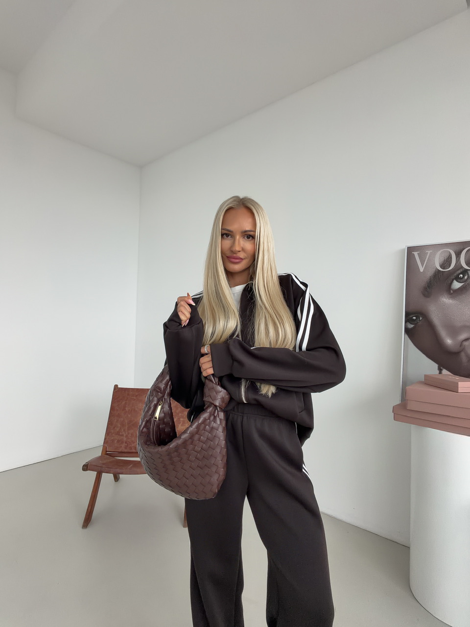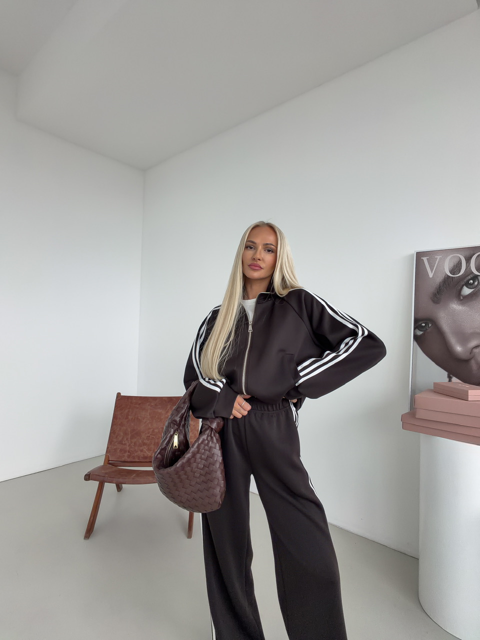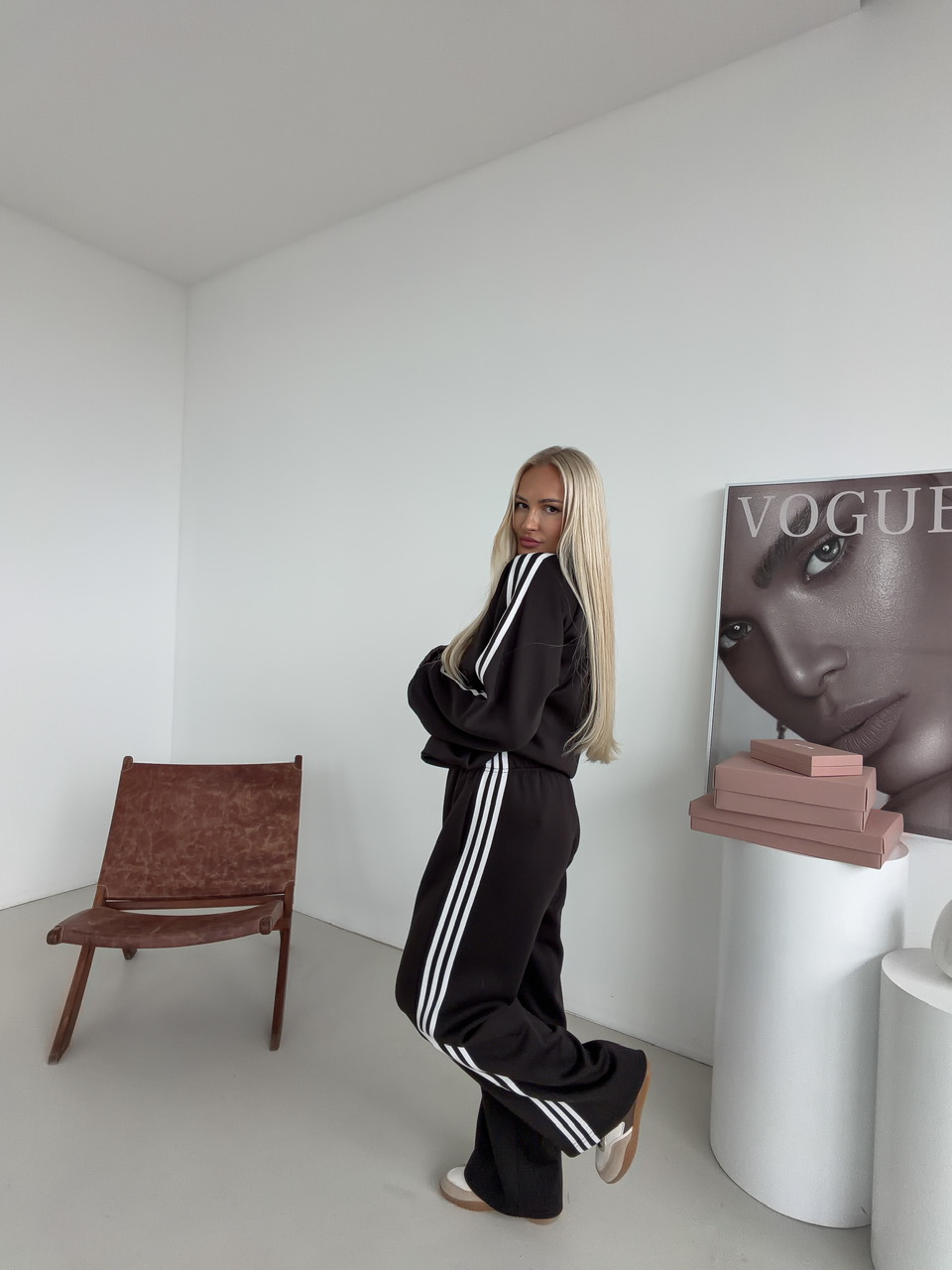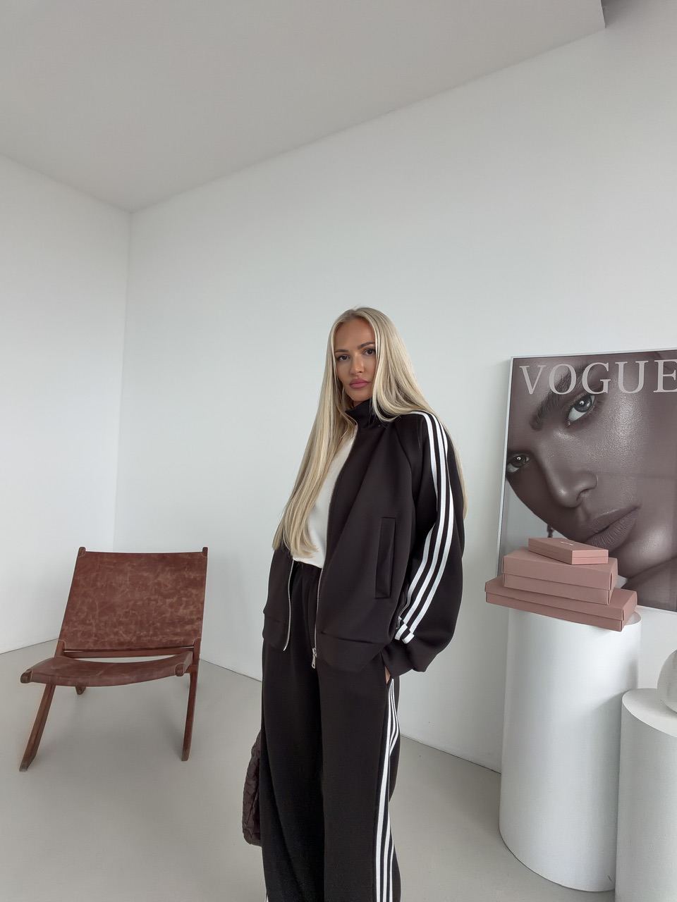 Štýlová a pohodlná súprava, ktorá spája športovú voľnosť s modernou eleganciou. Vyrobená z mäkkého a príjemného materiálu, ideálna na voľný čas aj každodenné nosenie. Mikina: zips, vysoký golier, kontrastné pruhy na rukávoch. Nohavice: rovný strih, bočné kontrastné pruhy, elastický pás pre pohodlie. Perfektná na cesty, tréning aj relax – budeš v nej vyzerať moderne a cítiť sa pohodlne.