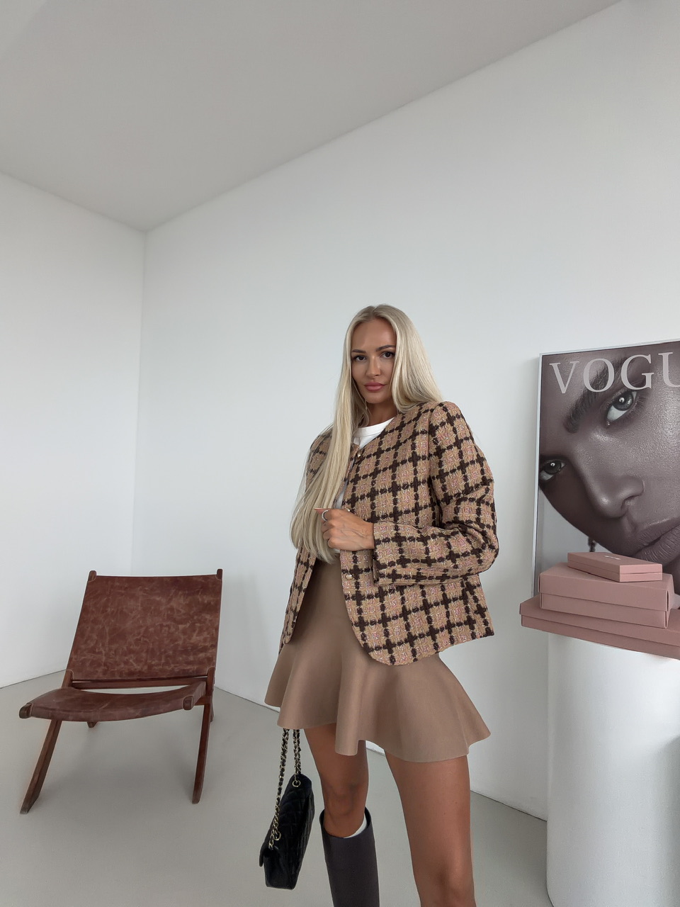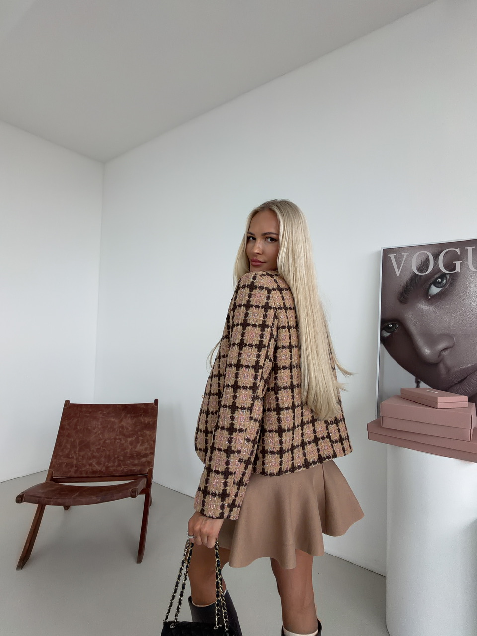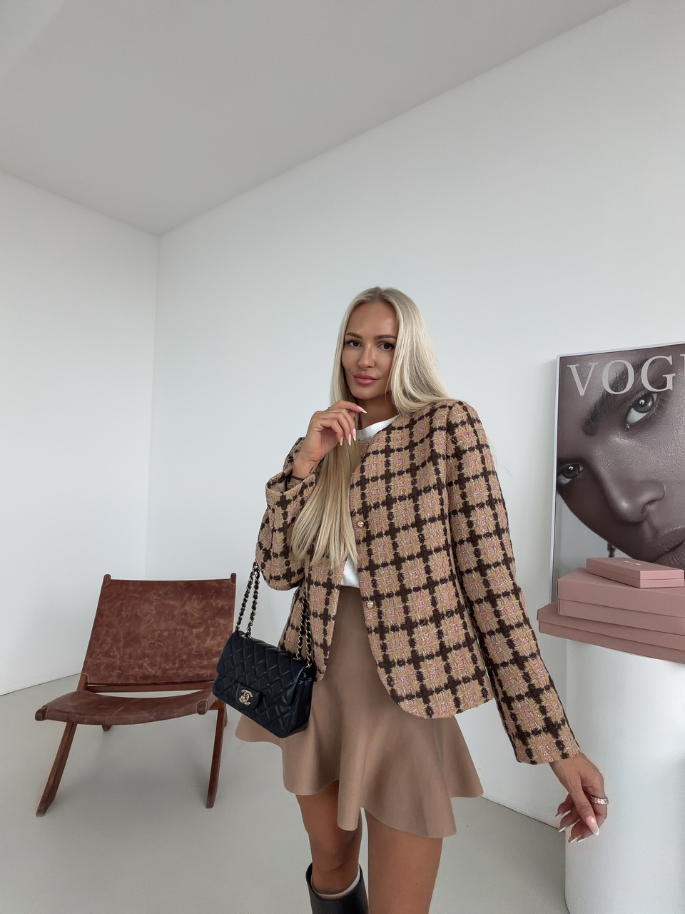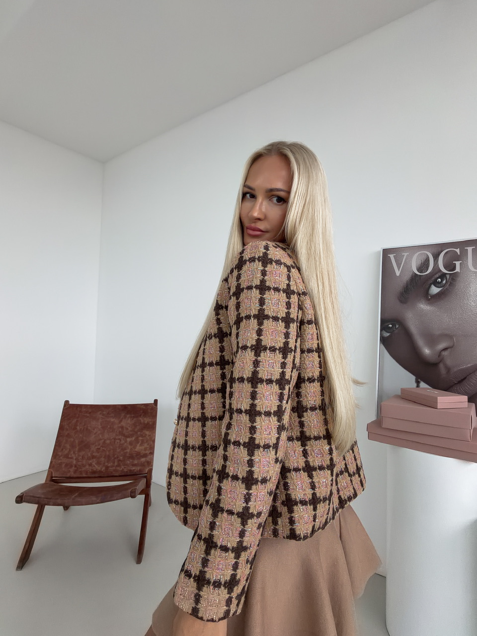 Elegantné dámske sako v nadčasovom károvanom vzore. Kombinácia hnedých a zlatistých odtieňov s jemným leskom pôsobí luxusne a štýlovo. Predná časť je doplnená zlatými gombíkmi, ktoré dodávajú sakám sofistikovaný detail. Tento kúsok je ideálny na formálne príležitosti, pracovné stretnutia či večerné výjazdy, no rovnako dobre vynikne aj v kombinácii s džínsami pre ležérne elegantný look.