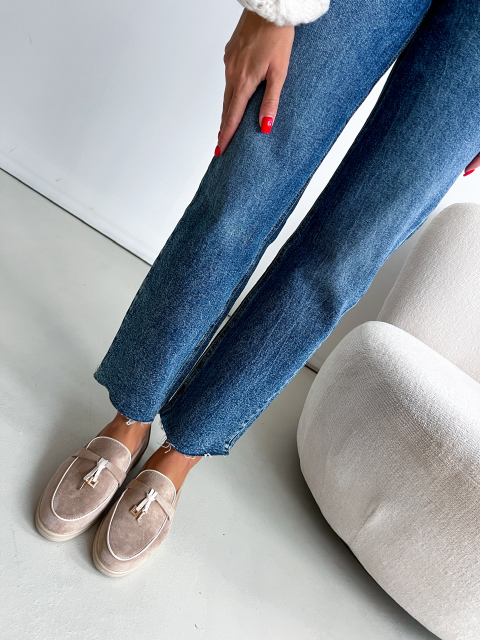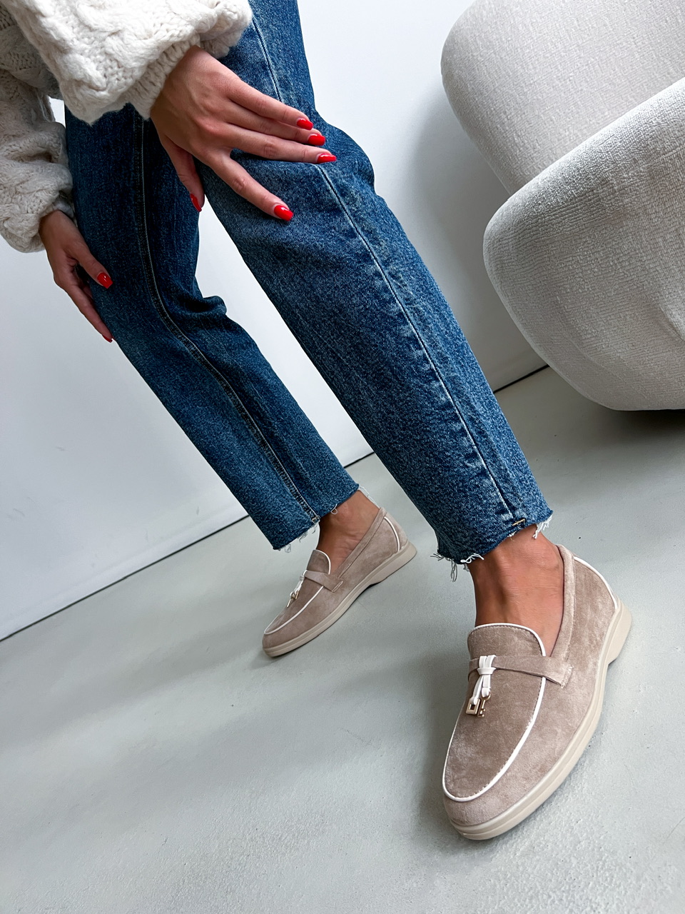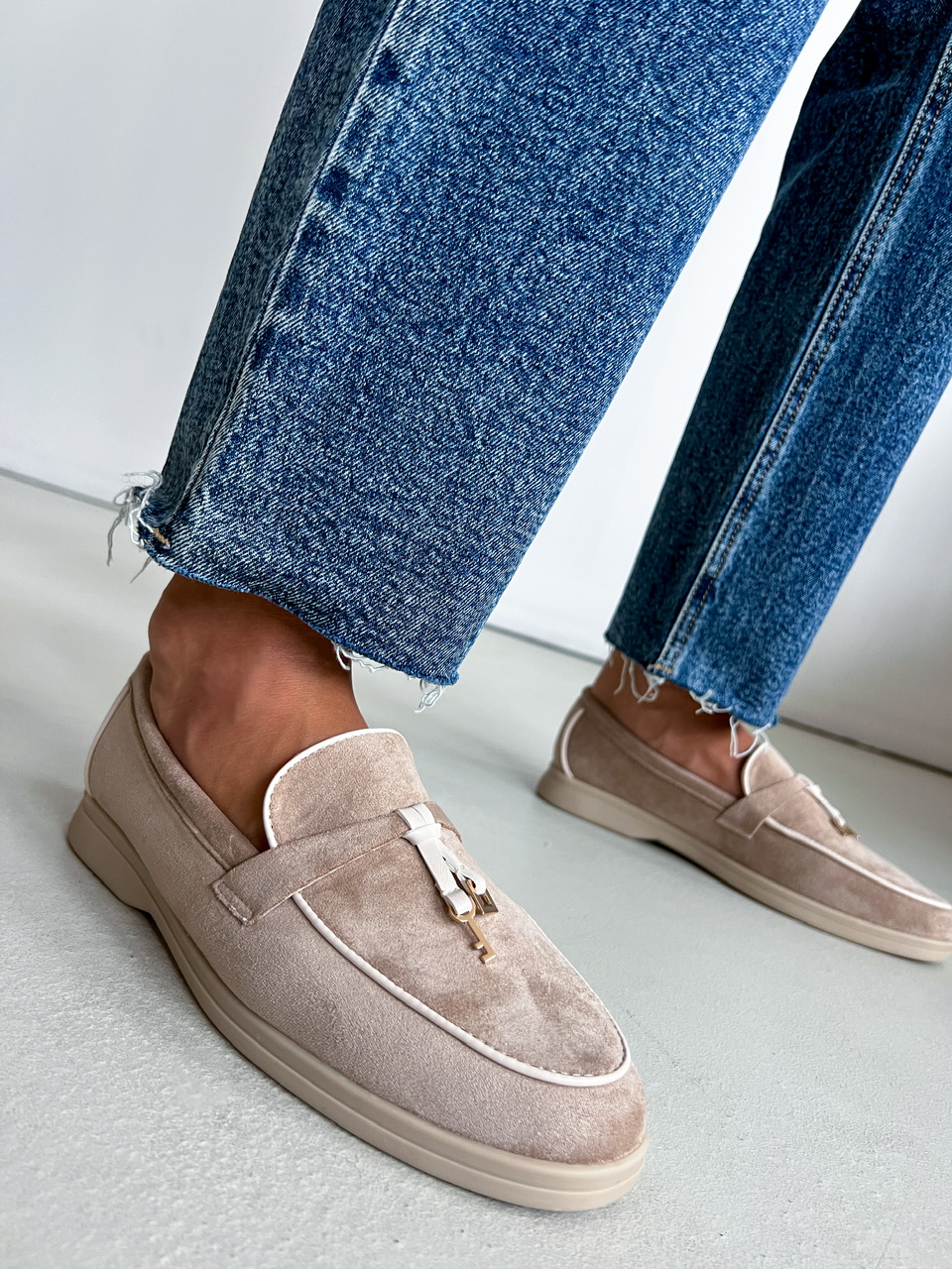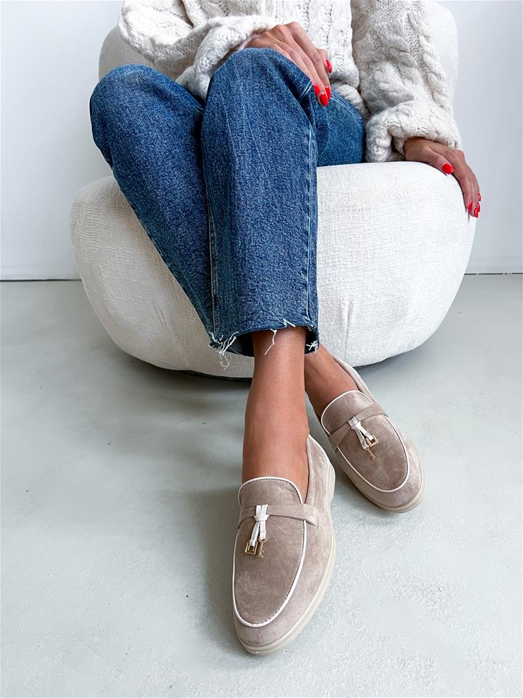 Béžové topánky na nízkej podrážke. Zvršok je semišového materiálu. Vrchná časť je zdobená krémovým lemovaním a zlatými aplikáciami.