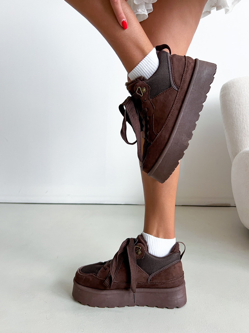 Športová obuv na miernej vysokej podrážke na platforme (cca 3,5 cm). Zvršok sa skladá z viacerých materiálov. Vnútorná časť je zateplená umelou kožušinkou.