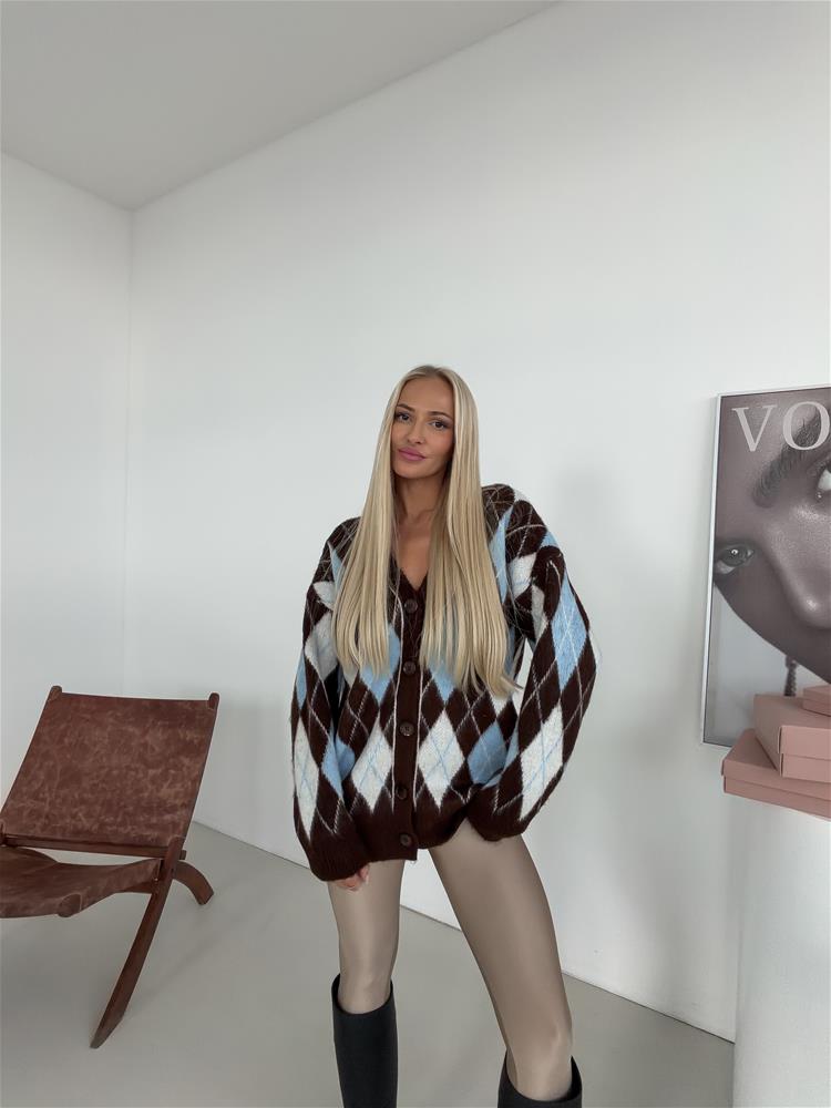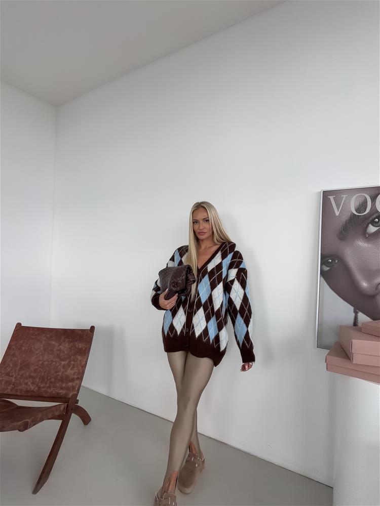 Tento nadčasový sveter je must-have kúskom do šatníka každej ženy. Mäkký pletený materiál s výrazným kosoštvorcovým vzorom pôsobí hrejivo a štýlovo zároveň. Je pohodlný, príjemný na dotyk a vďaka voľnejšiemu strihu sa skvele hodí na každodenné nosenie. Zapínanie má na gombíky. Krásne vynikne s rifľami, sukňou aj cez jednoduché šaty. Skvelý kúsok na vrstvenie do chladnejších dní.