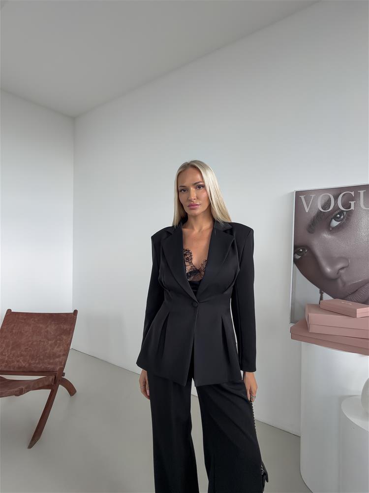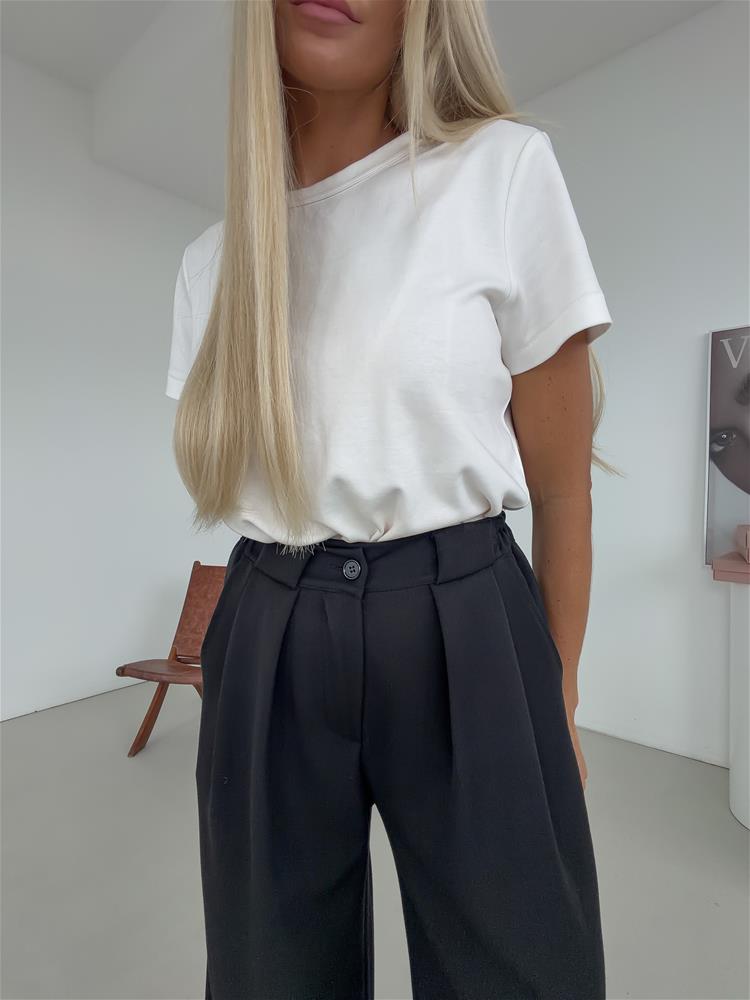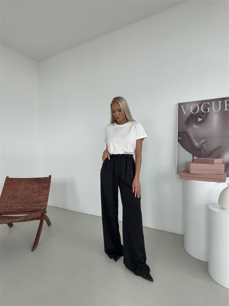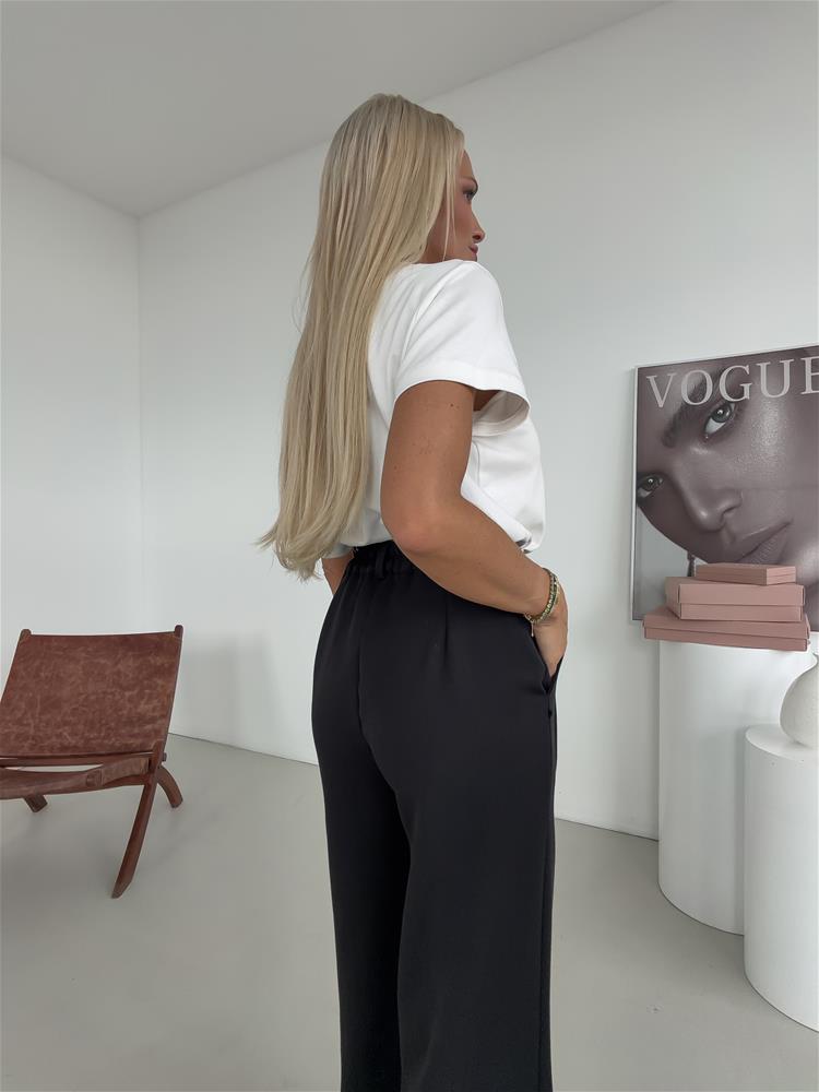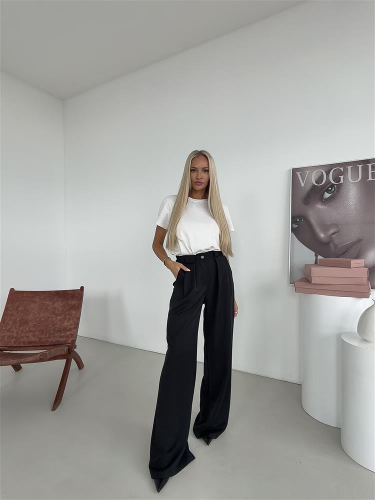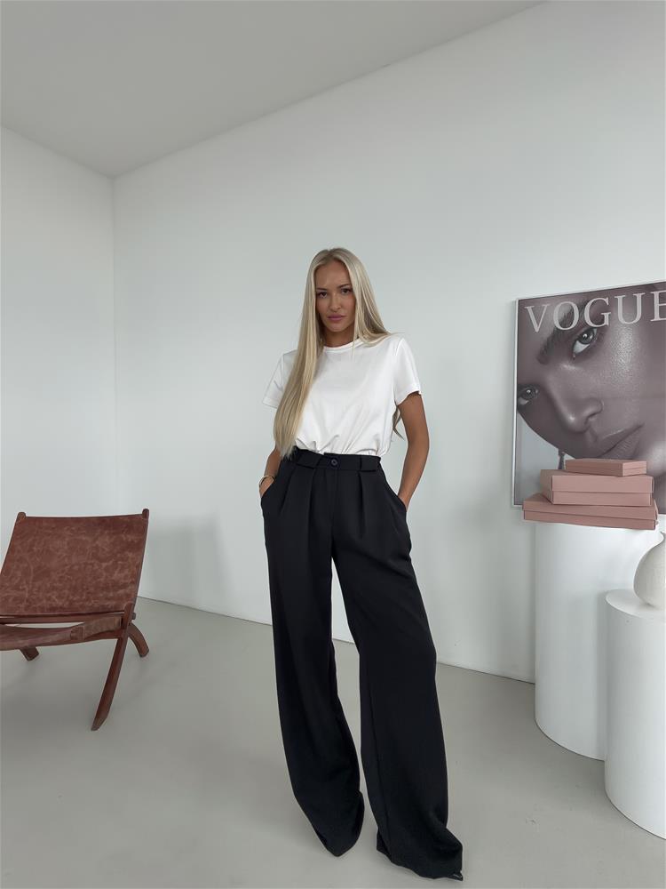 Štýlové dámske nohavice sú skvelou voľbou pre moderný a zároveň pohodlný outfit. Vďaka voľnejšiemu strihu a elastickému pásu so zapínaním na gombík poskytujú maximálne pohodlie počas celého dňa. Jemný materiál pôsobí elegantne a ľahko sa kombinuje s rôznymi kúskami. Tieto nohavice môžete zladiť so sakom v rovnakej farbe pre dokonalý komplet, alebo ich nosiť samostatne so svetrom či blúzkou pre ležérny look.