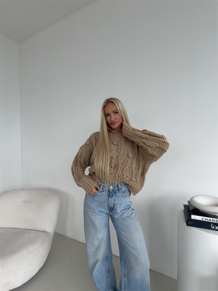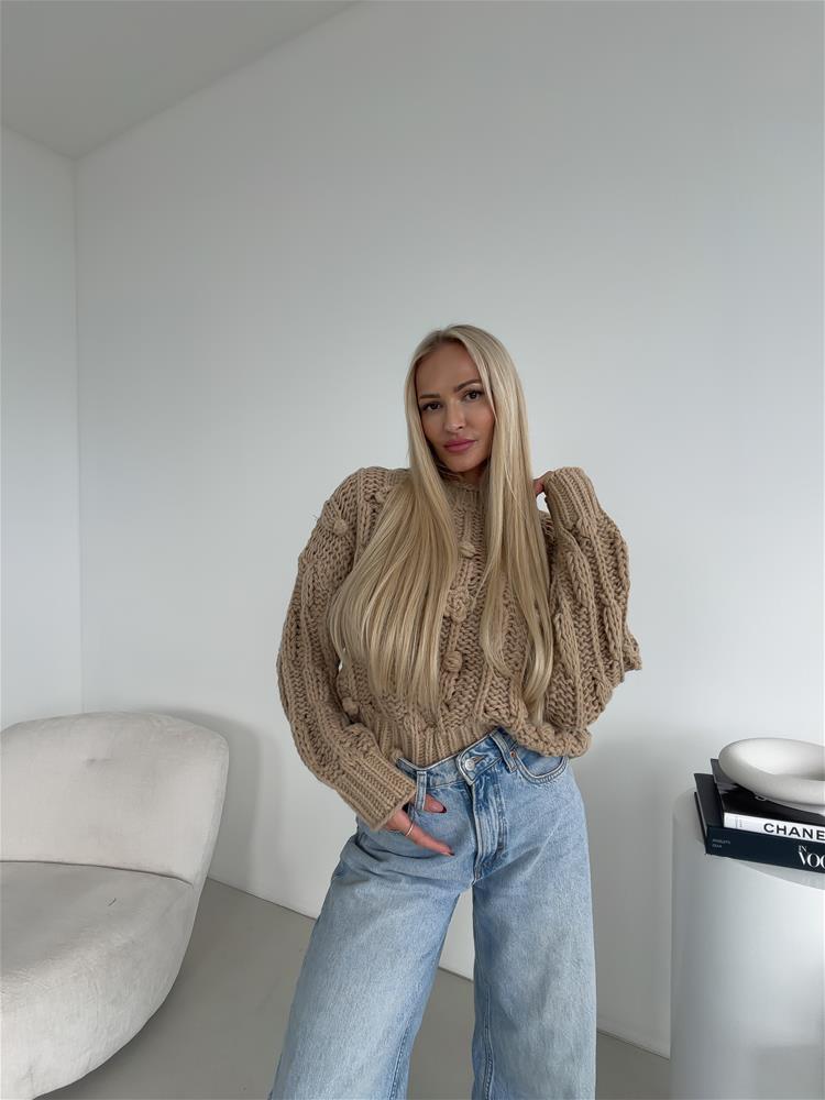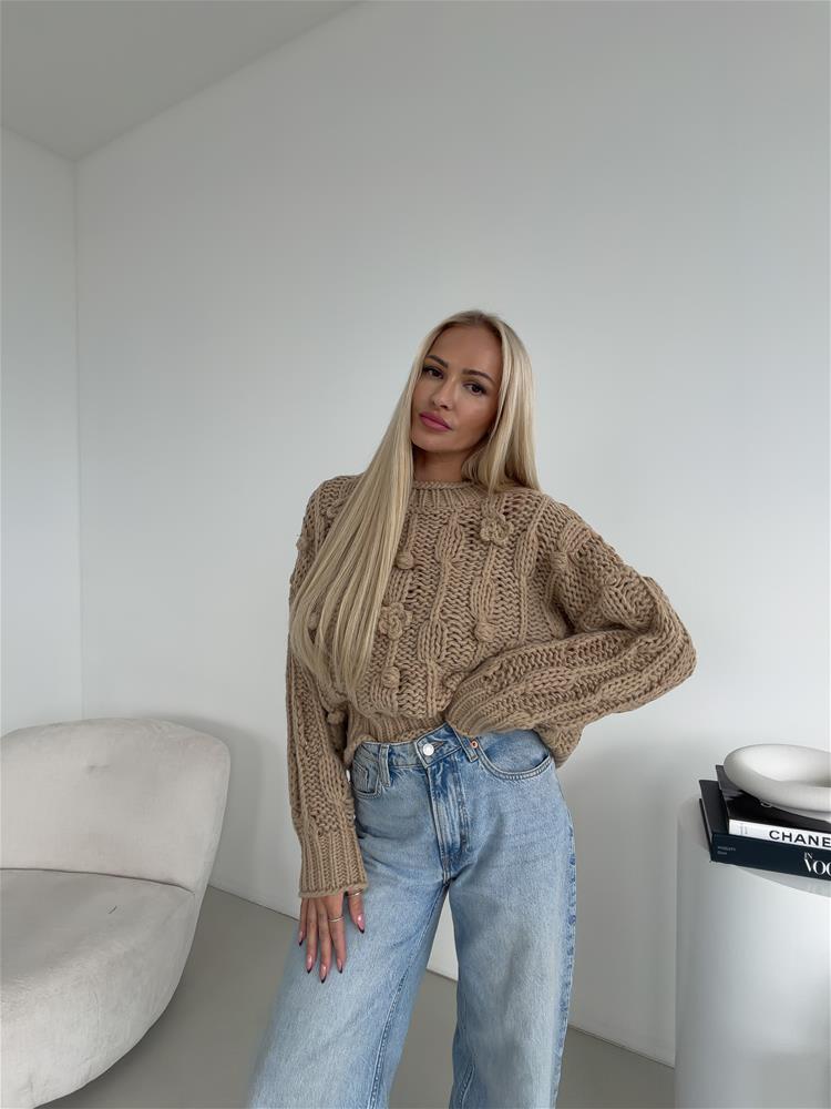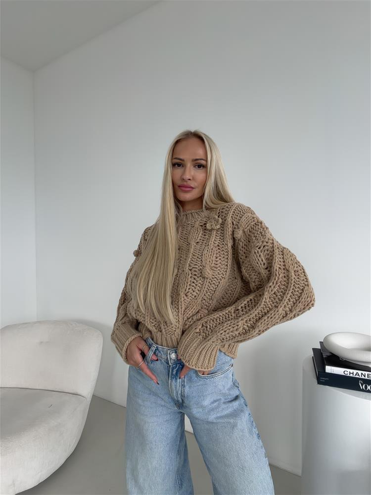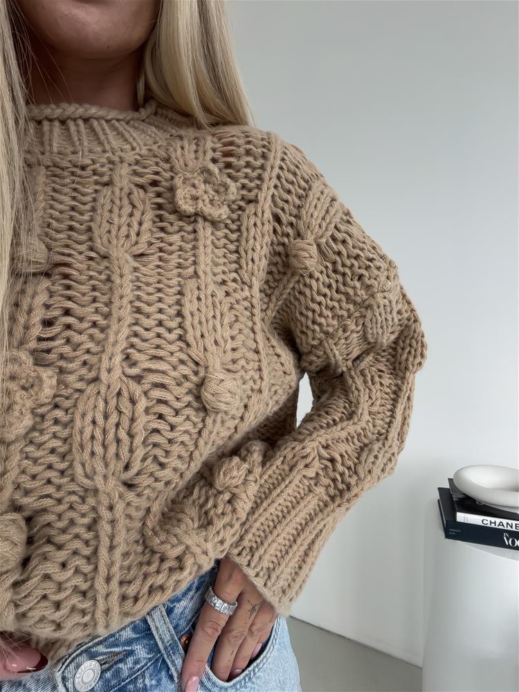 Štýlový pulóver je dokonalou kombináciou pohodlia a nadčasového dizajnu. Je vyrobený z hrubej priadze, ktorá krásne hreje a zároveň pôsobí elegantne. Pletený vzor s kvetinkovými detailmi a jemnými gombíkovými uzlíkmi dodáva svetru originálny, ručne robený vzhľad. Ideálny k džínsom, sukniam aj elegantným nohaviciam – univerzálny kúsok, ktorý dodá tvojmu outfitu teplo a štýl.