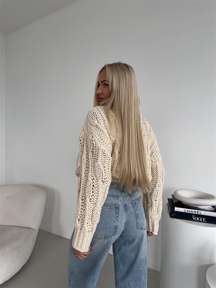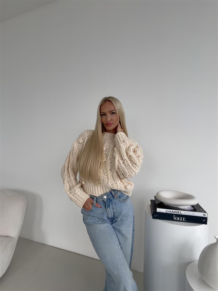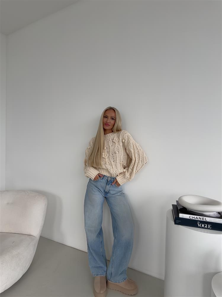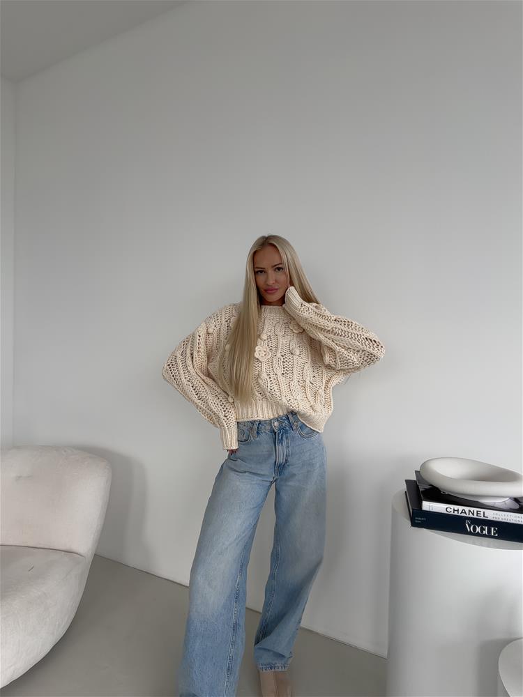 Štýlový pulóver je dokonalou kombináciou pohodlia a nadčasového dizajnu. Je vyrobený z hrubej priadze, ktorá krásne hreje a zároveň pôsobí elegantne. Pletený vzor s kvetinkovými detailmi a jemnými gombíkovými uzlíkmi dodáva svetru originálny, ručne robený vzhľad. Ideálny k džínsom, sukniam aj elegantným nohaviciam – univerzálny kúsok, ktorý dodá tvojmu outfitu teplo a štýl.