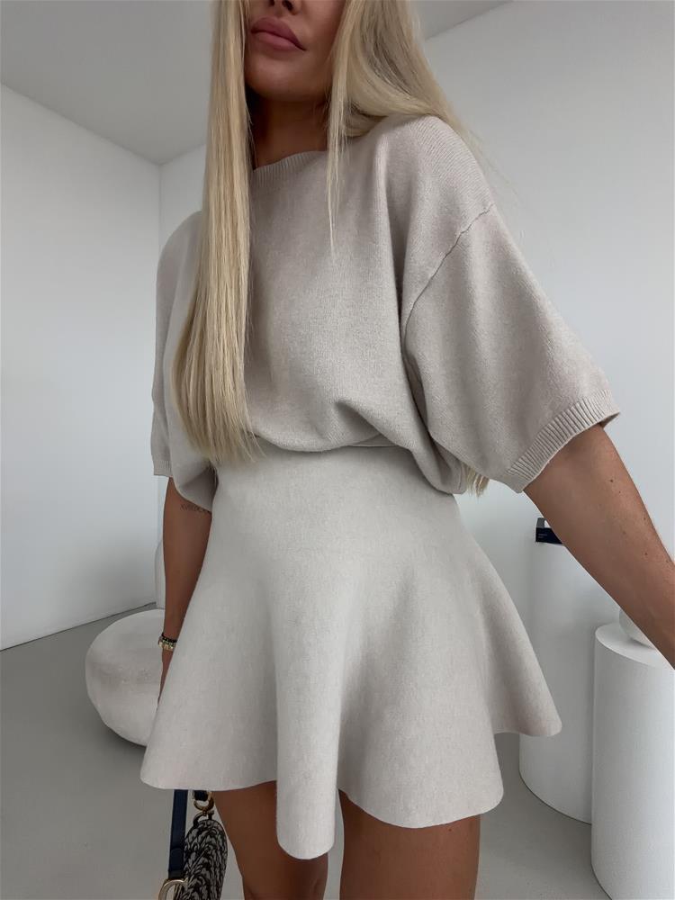 Elegantný a pohodlný pletený komplet, ktorý spája štýl a komfort v jednom. Set pozostáva z jemne elastickej mini sukne a voľného pulóvra, ktoré spolu vytvárajú nadčasový a minimalistický outfit ideálny na každodenné nosenie. Sukňa: elastický pás pre maximálne pohodlie. Pulóver: s krátkymi rukávmi, s jemným rebrovaným lemom. Jednoduchý, no výrazne ženský komplet, ktorý ľahko doplníš čižmami, teniskami alebo elegantnými doplnkami podľa príležitosti.