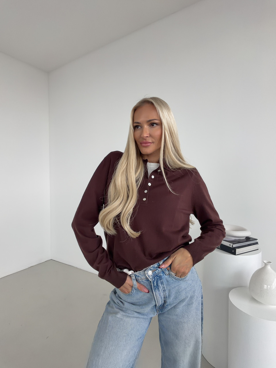 Sveter s golierom pôsobí sofistikovane a nadčasovo, zatiaľ čo rad perleťových gombíkov dodáva jemný ženský nádych. Vyrobený z mäkkého a pohodlného materiálu, ktorý sa príjemne nosí počas celého dňa. Vďaka svojmu univerzálnemu strihu sa hodí k nohaviciam, sukni aj pod sako – ideálny na bežné nosenie aj do práce.