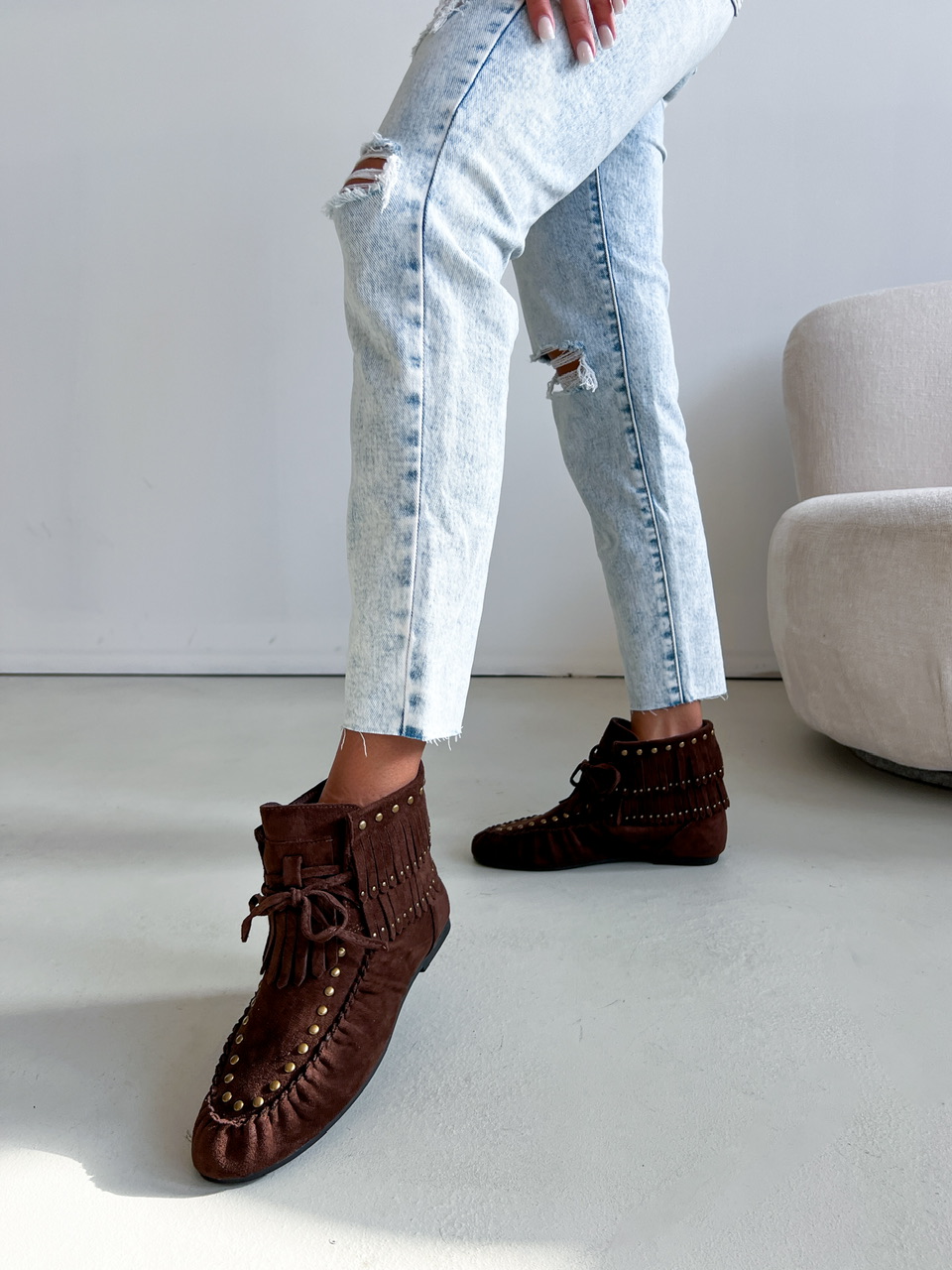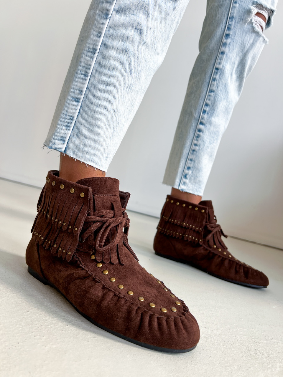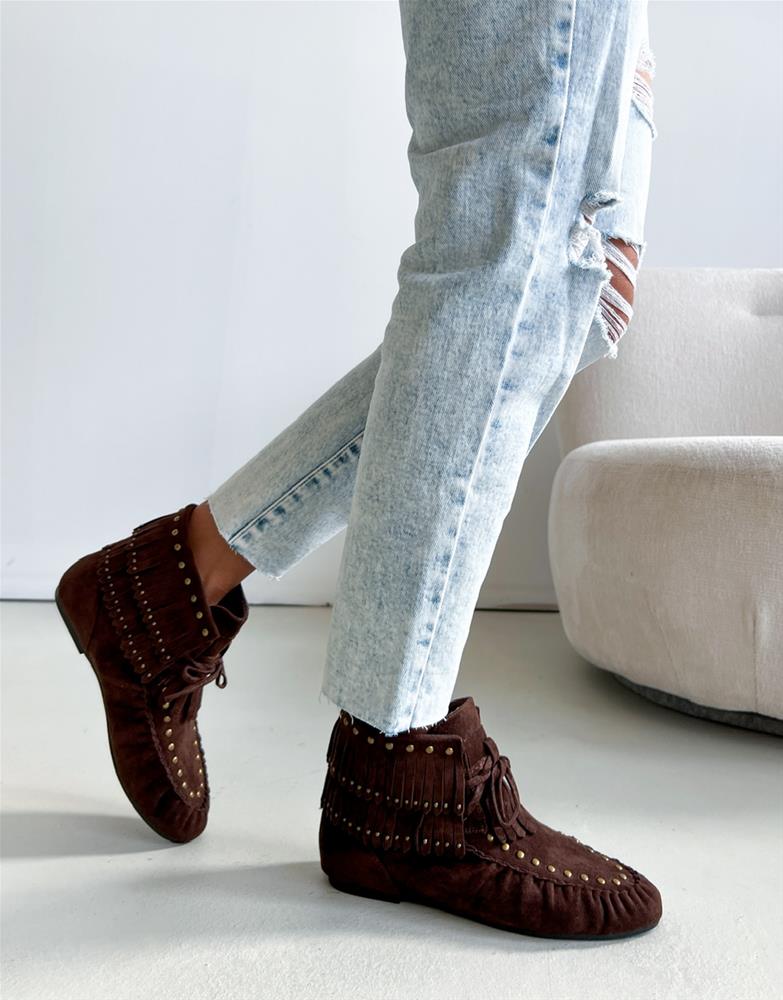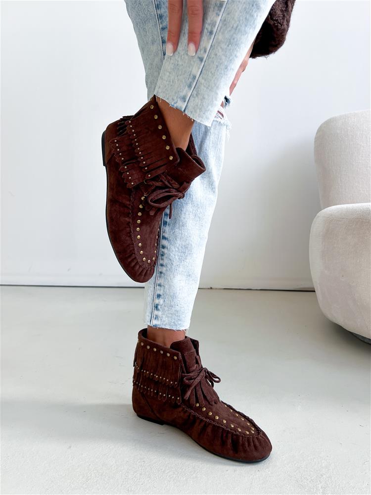 Kotníkové čižmy na nízkej rovnej podrážke. Zvršok je semišového materiálu, zdobený vybijanými prvkami a prešívaním. Predná časť je na šnutovanie.