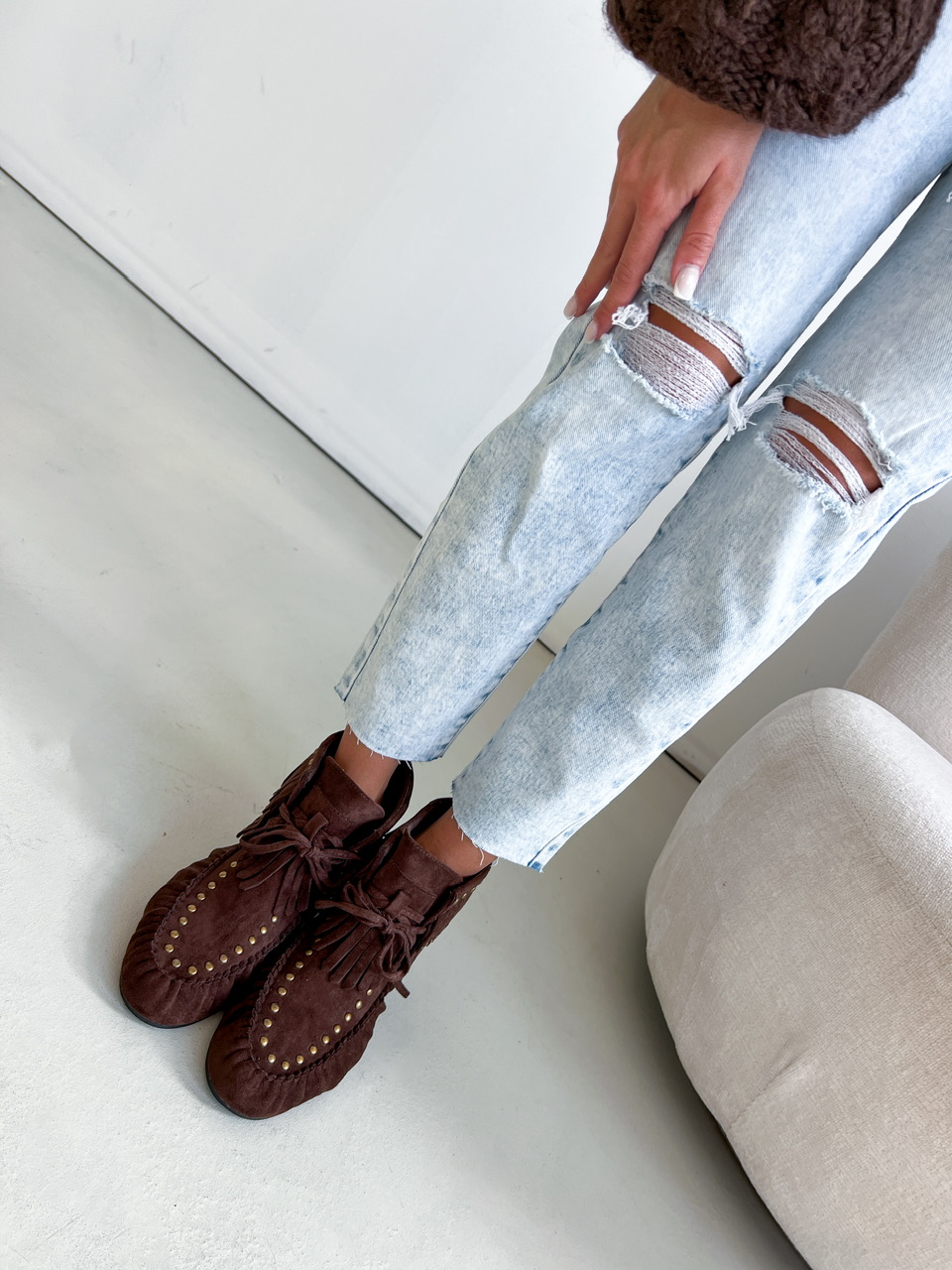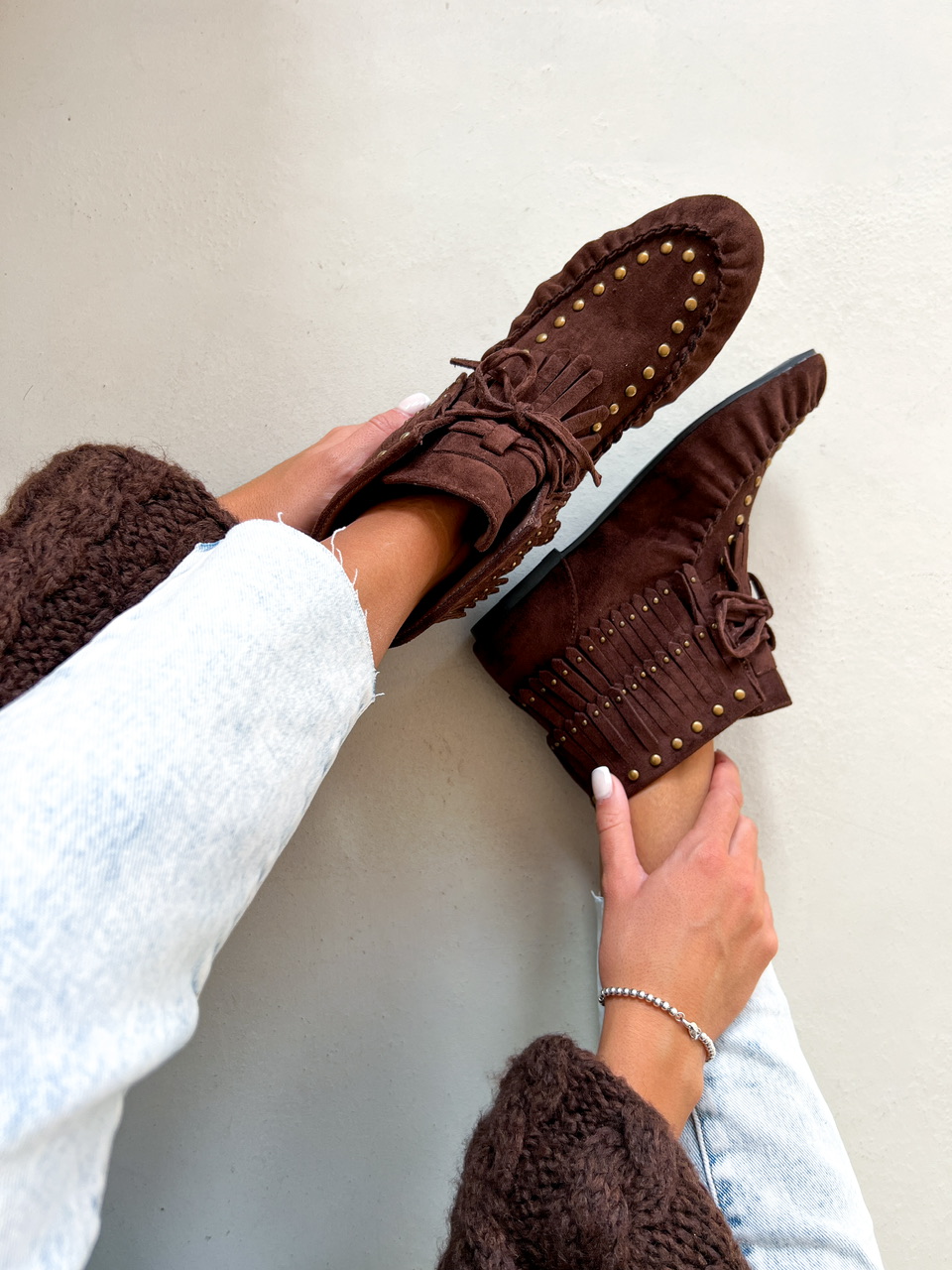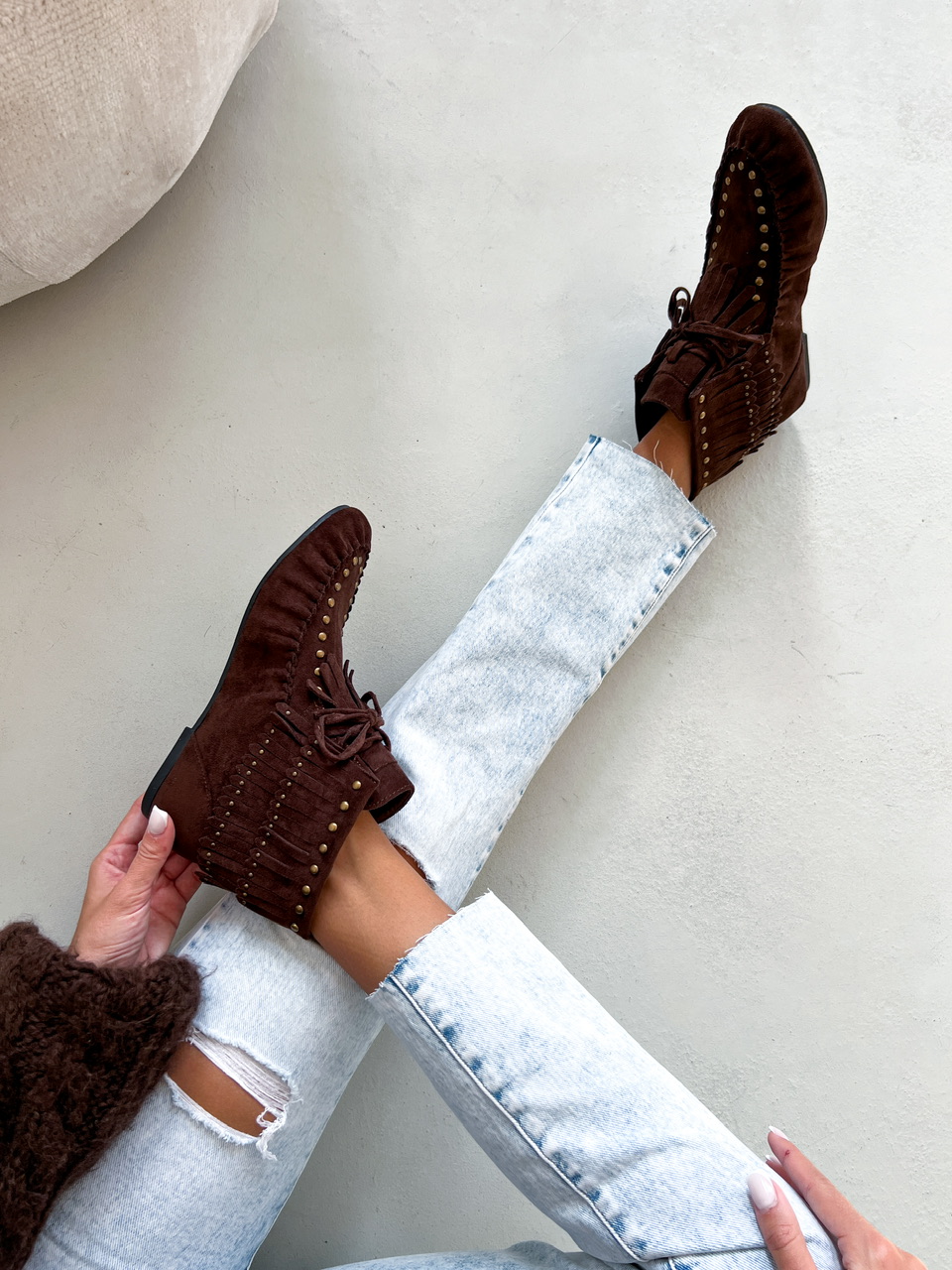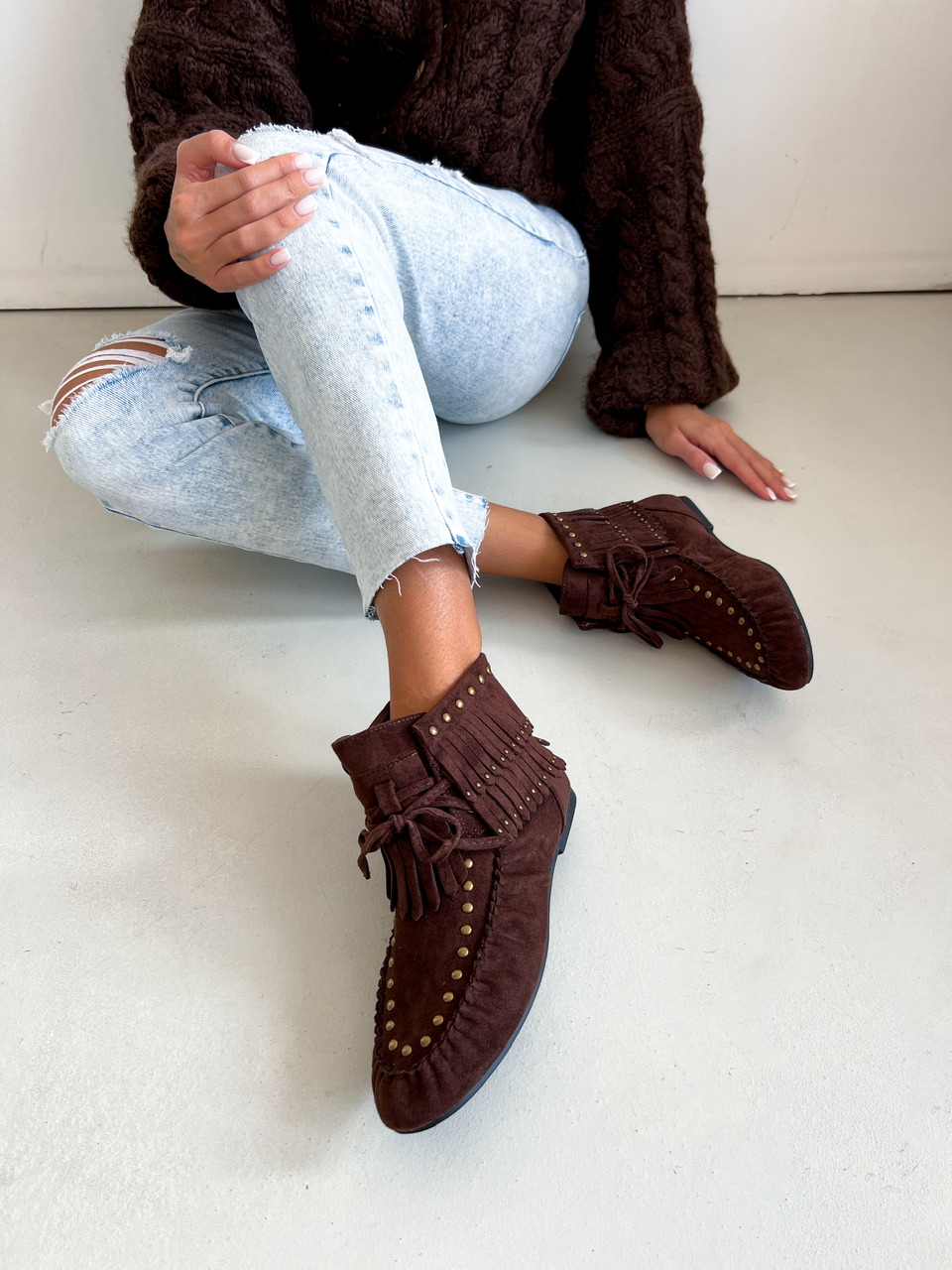 Kotníkové čižmy na nízkej rovnej podrážke. Zvršok je semišového materiálu, zdobený vybijanými prvkami a prešívaním. Predná časť je na šnutovanie.