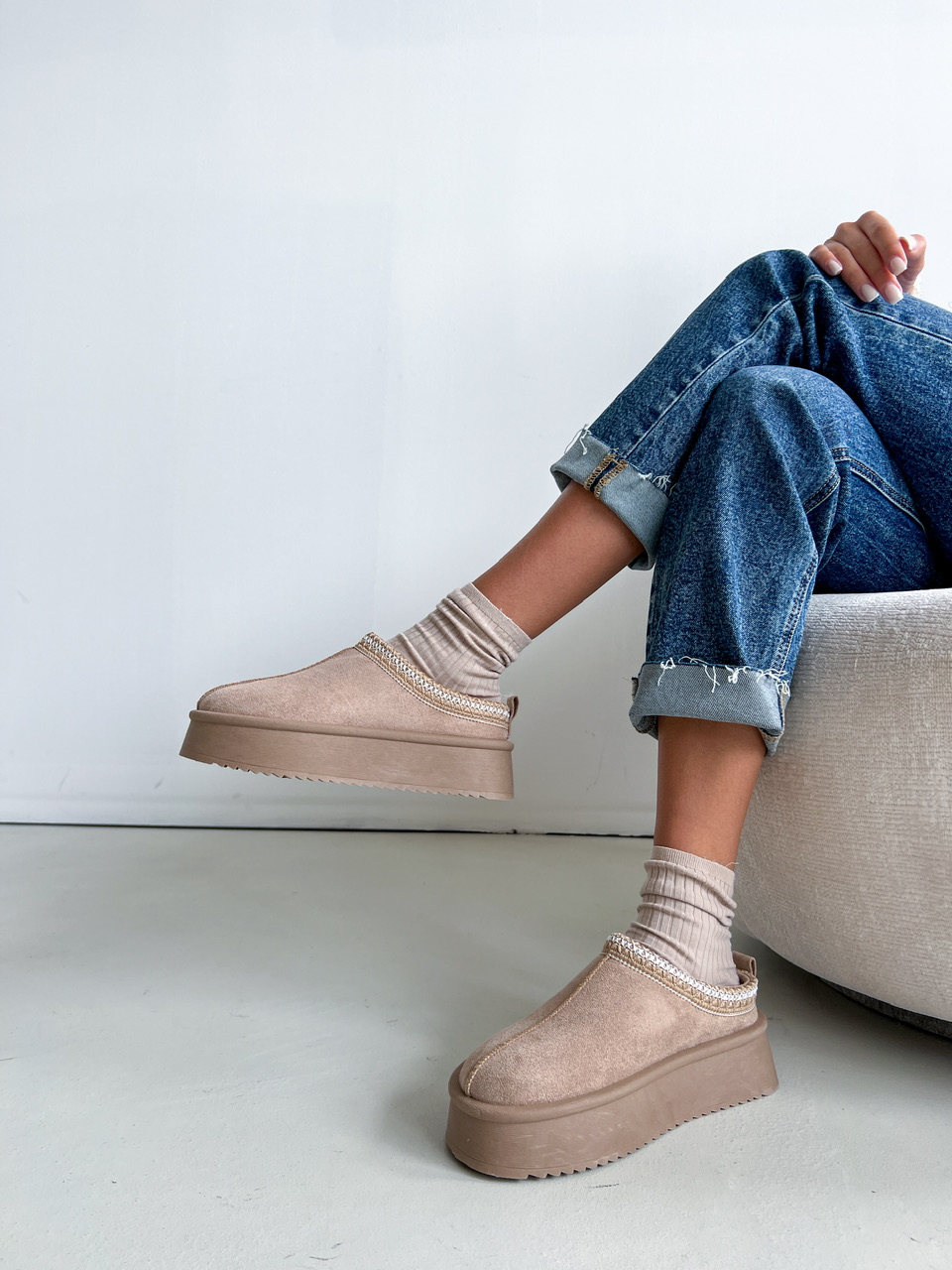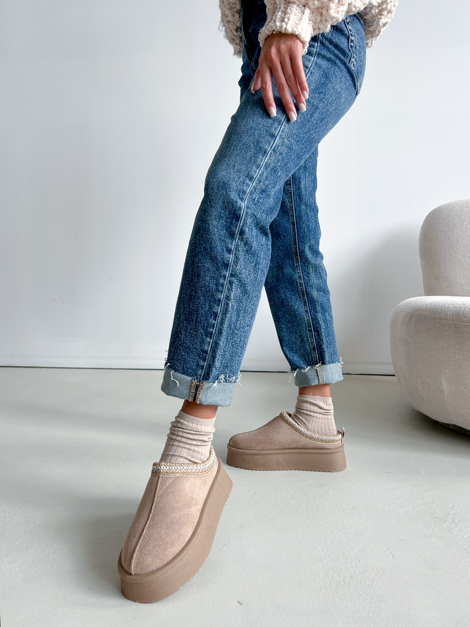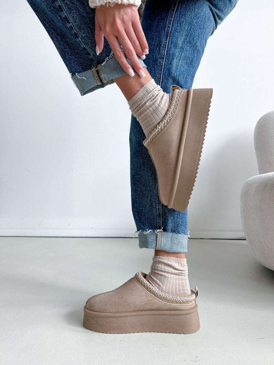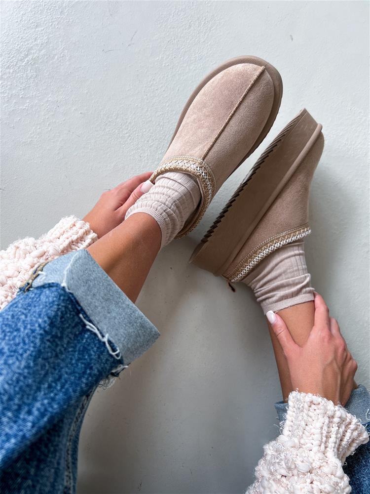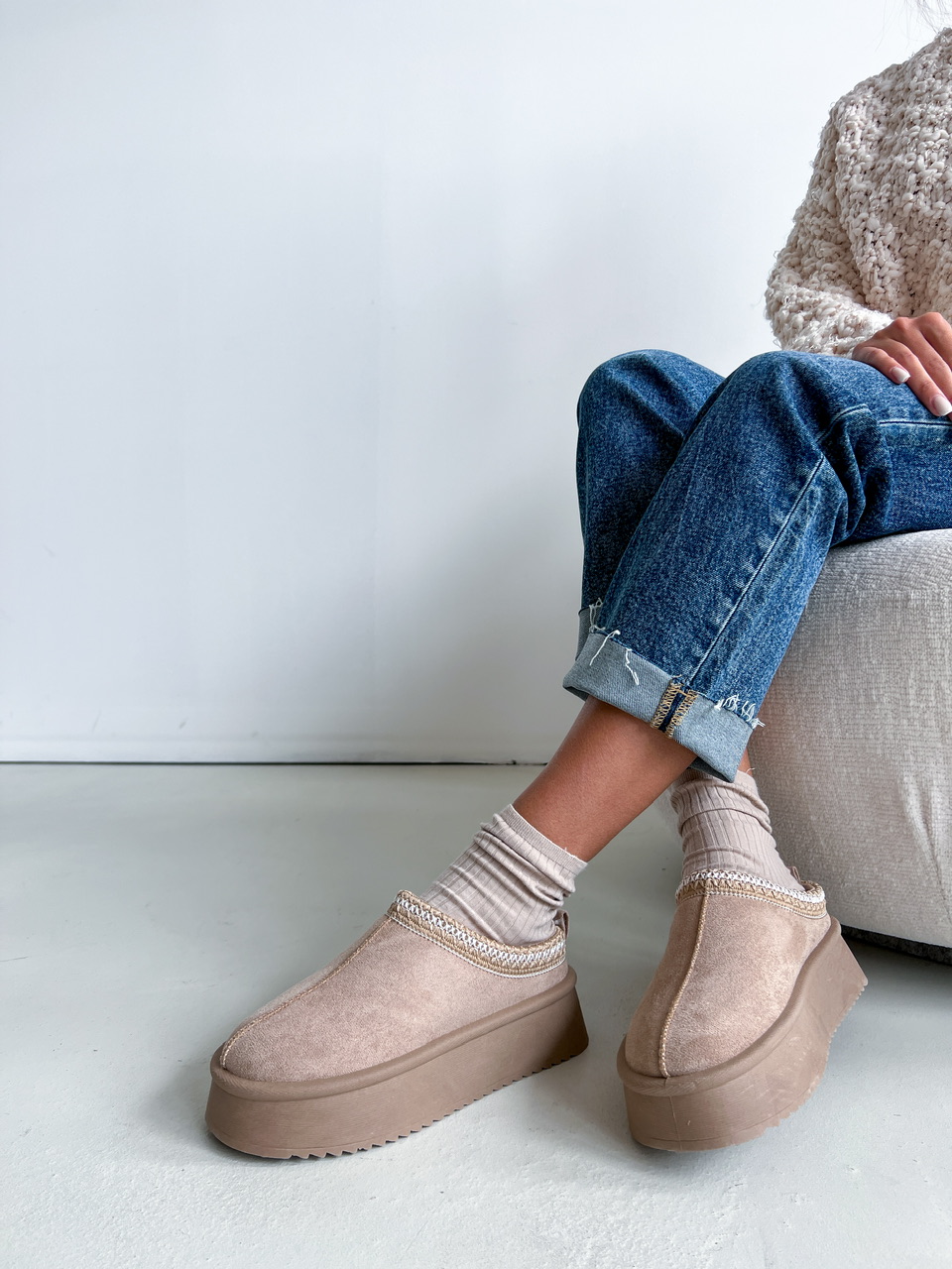 Nízka zimná obuv na rovnej mierne vyvýšenej podrážke (cca 4 cm). Zvršok je semišového materiálu a zdobený bledým prešitím. Vnútorná časť je zateplená umelou kožušinkou.