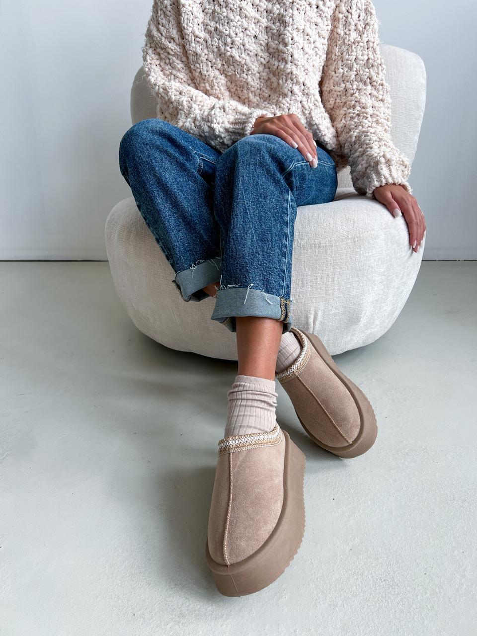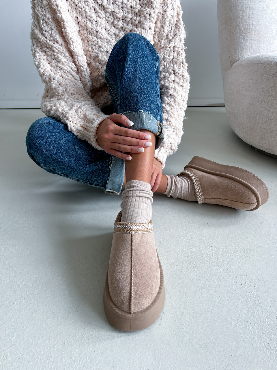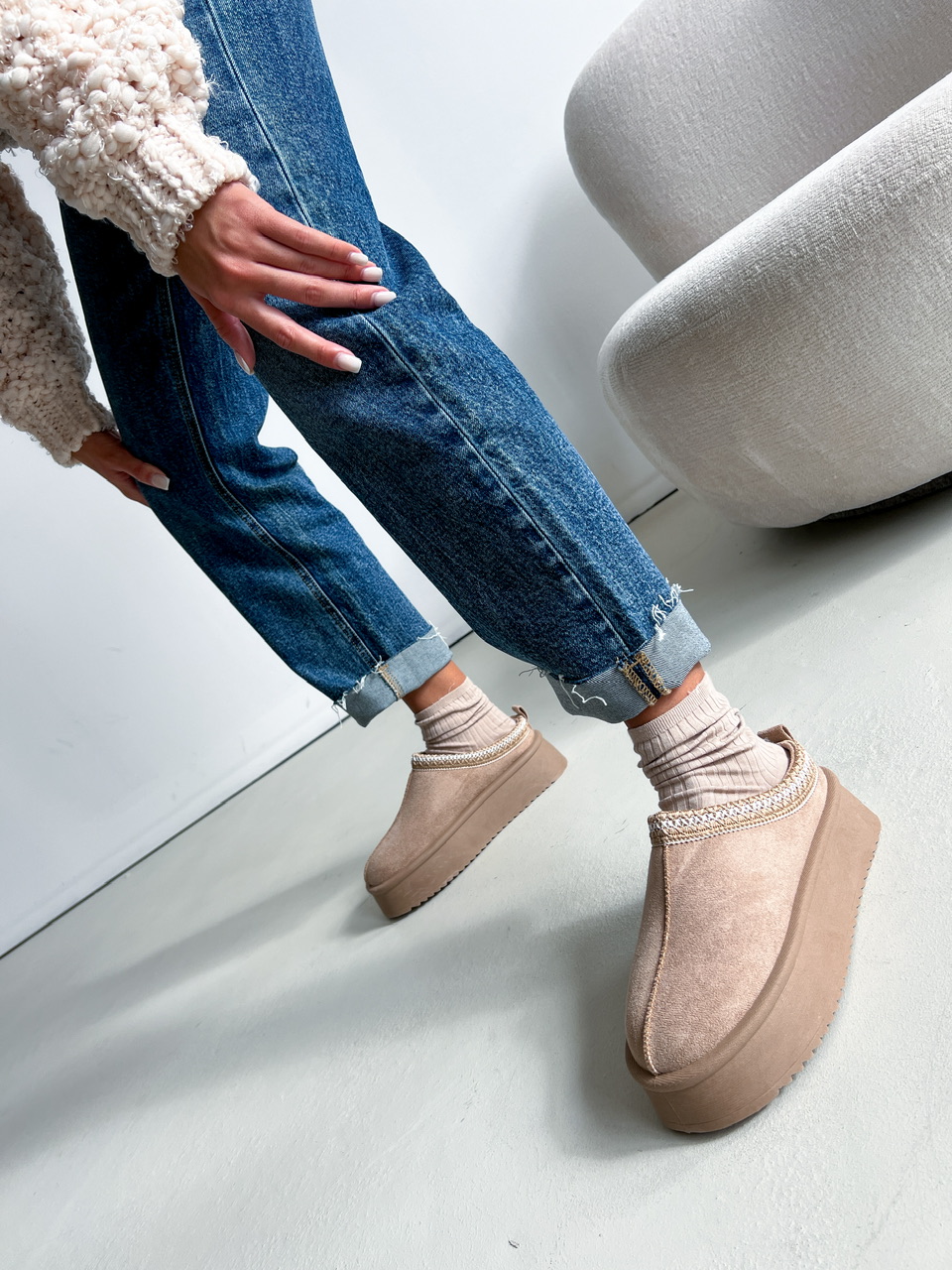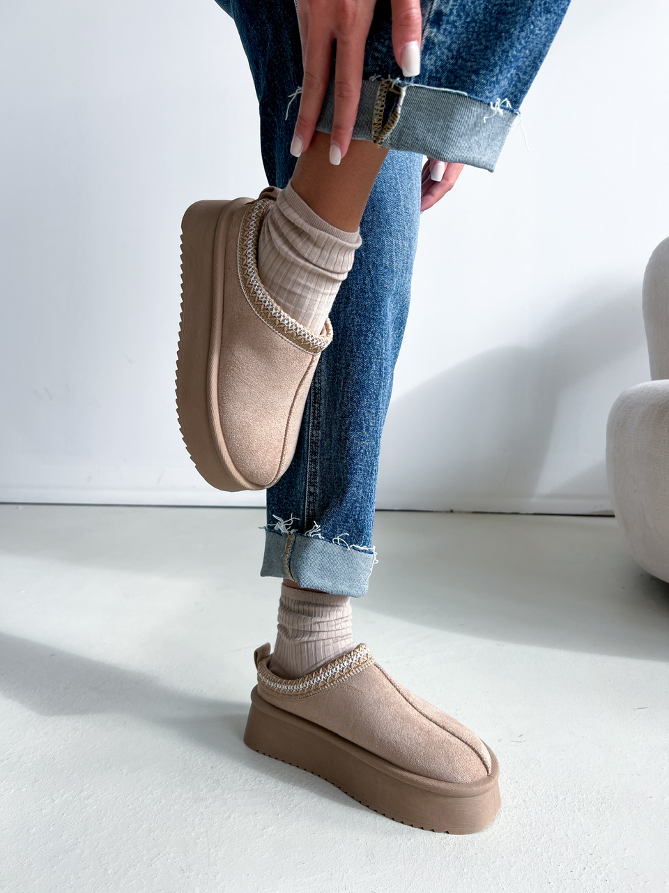 Nízka zimná obuv na rovnej mierne vyvýšenej podrážke (cca 4 cm). Zvršok je semišového materiálu a zdobený bledým prešitím. Vnútorná časť je zateplená umelou kožušinkou.