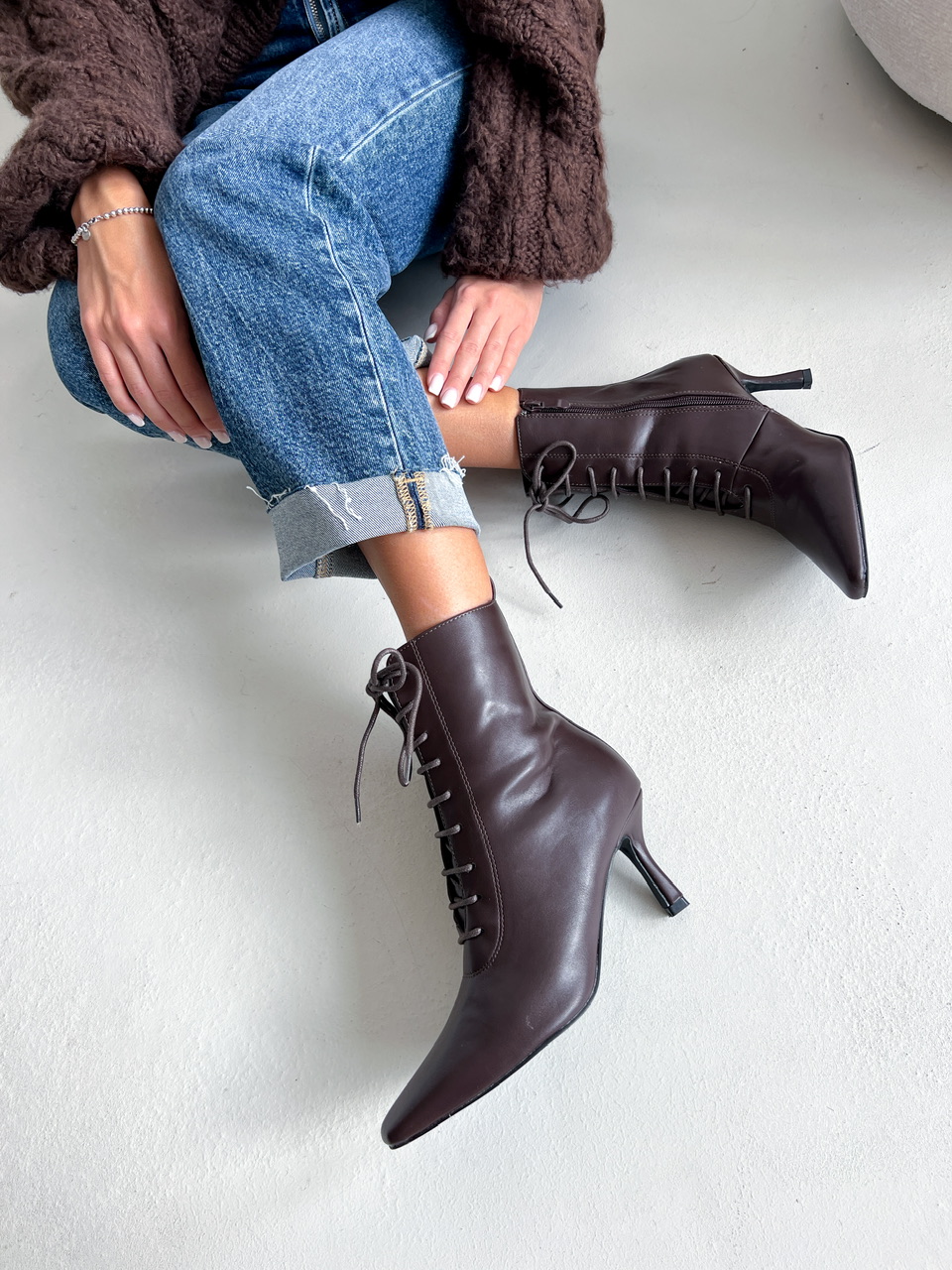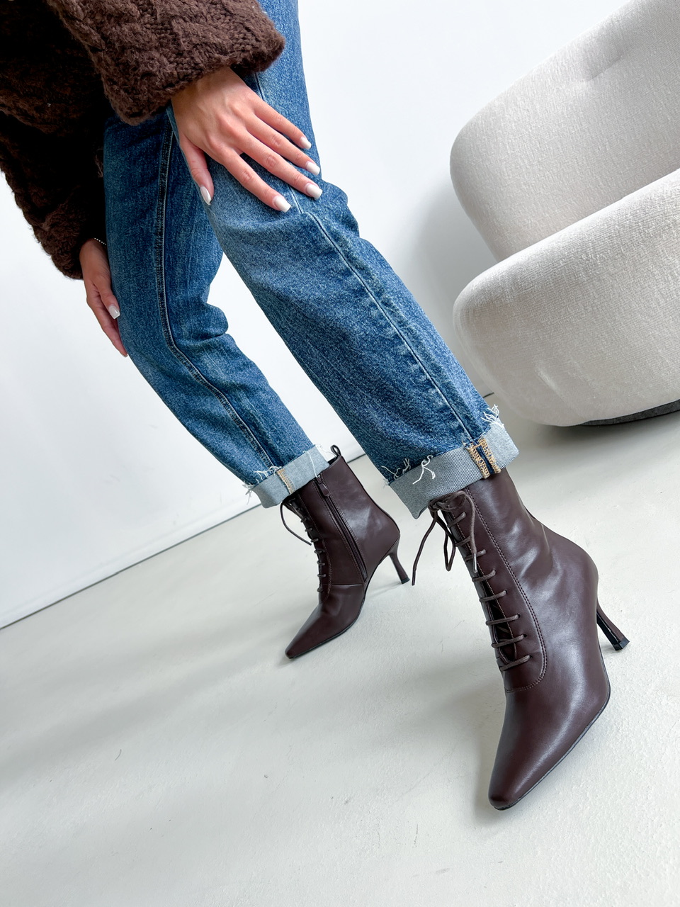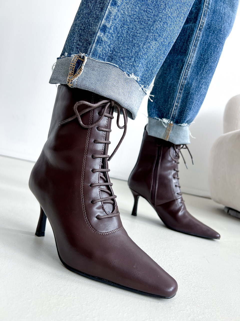 Vysoké čižmy na tenkom podpätku (cca 7,5 cm). Predná časť je na šnurovanie a z vnútornej bočnej strany je polovičný zips na zapínanie. Predná špička je mierne hranatého tvaru. Vnútorná časť je zateplená. Na zadnej časti je ozdobné putko.
