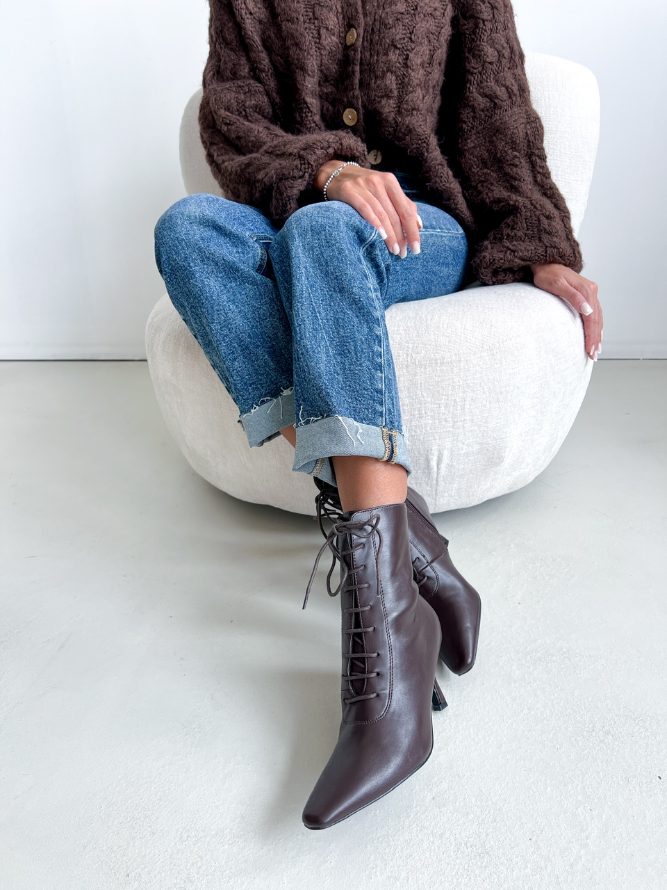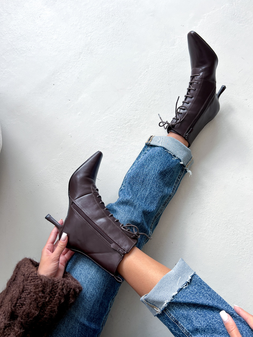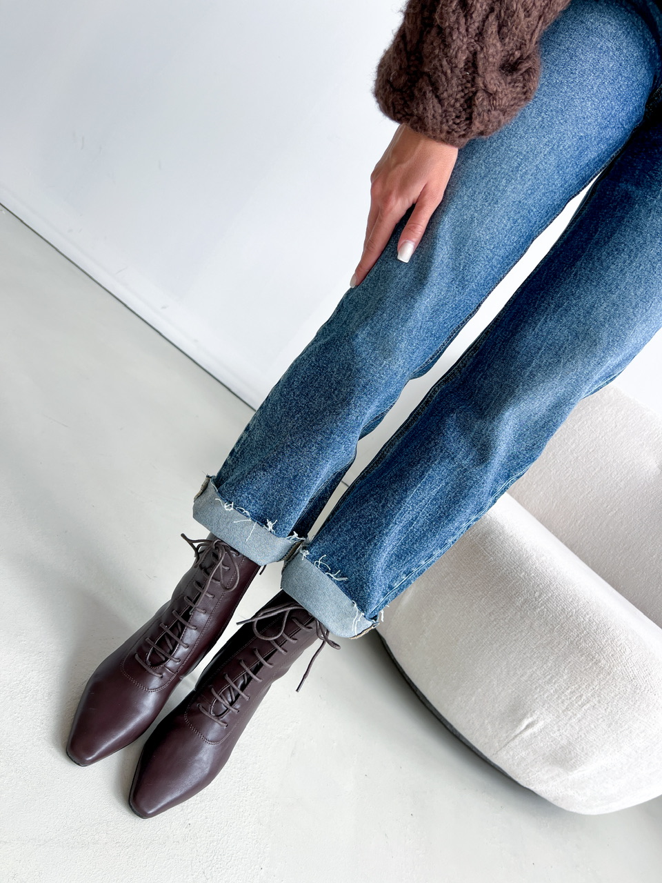 Vysoké čižmy na tenkom podpätku (cca 7,5 cm). Predná časť je na šnurovanie a z vnútornej bočnej strany je polovičný zips na zapínanie. Predná špička je mierne hranatého tvaru. Vnútorná časť je zateplená. Na zadnej časti je ozdobné putko.