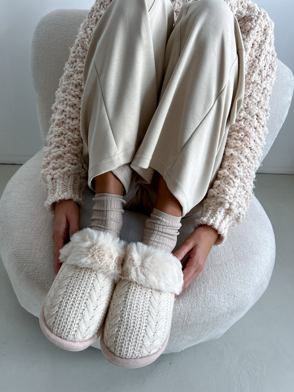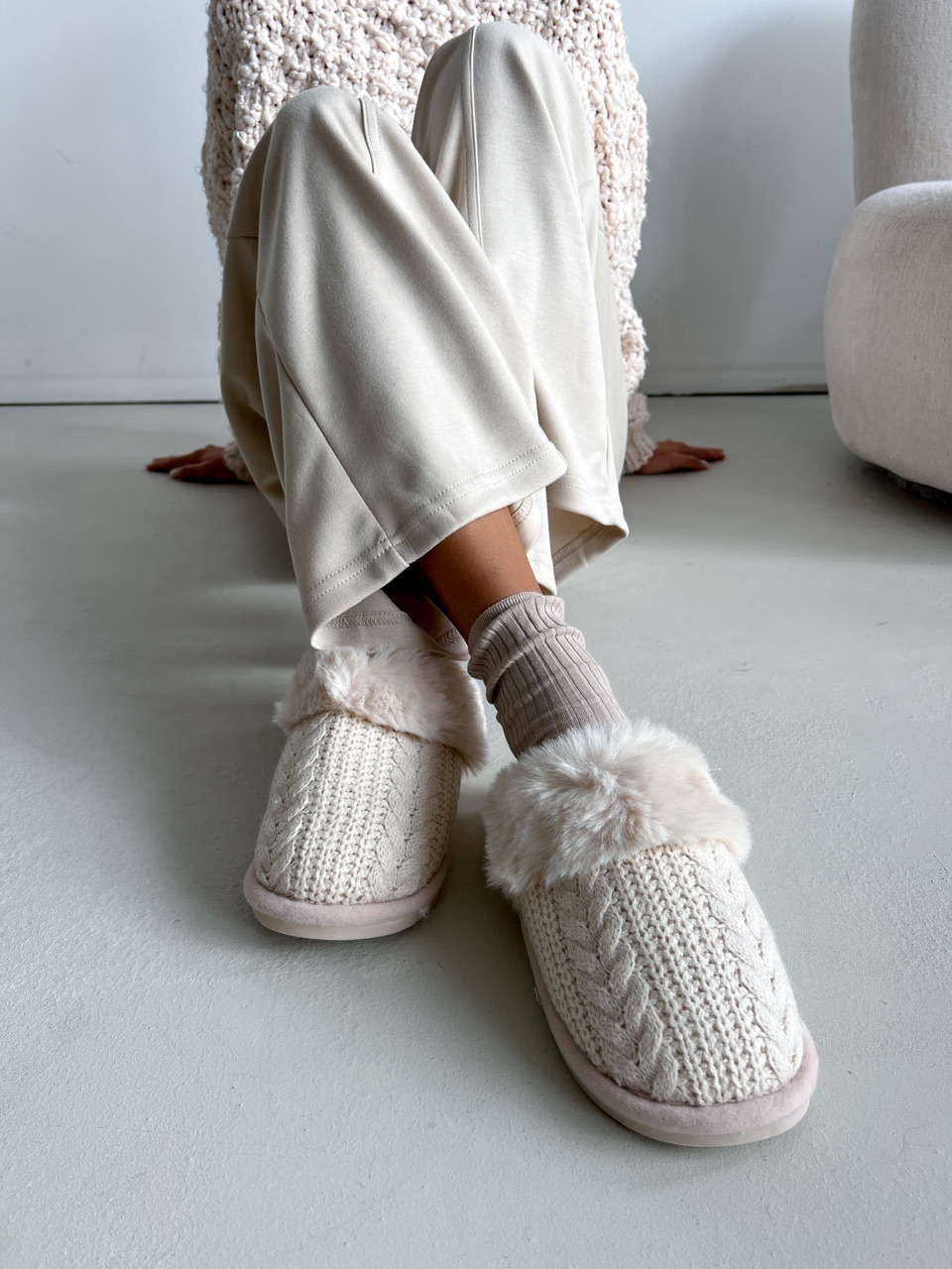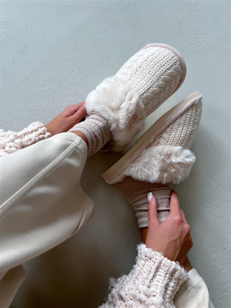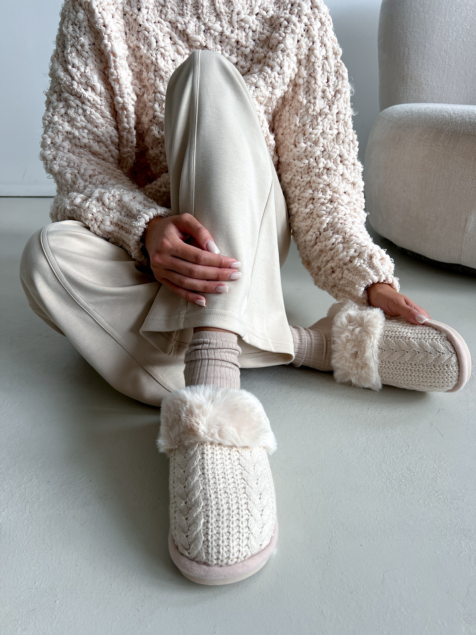 Vlnené papuče s otvorenou pätou. Vnútorná časť je zateplená jemnou kožušinou.
