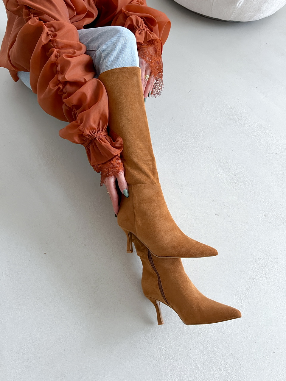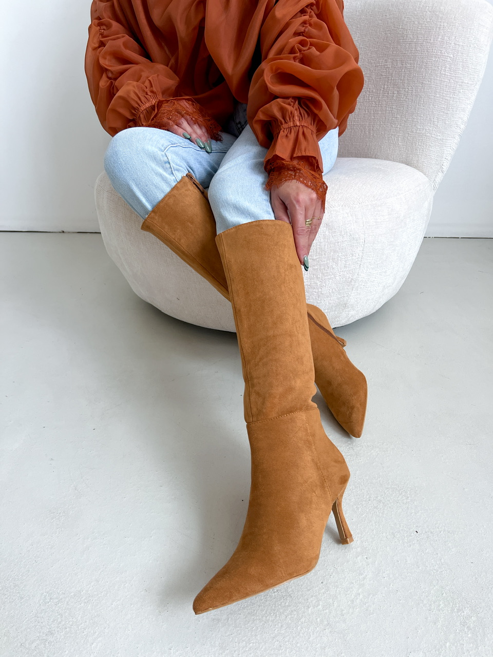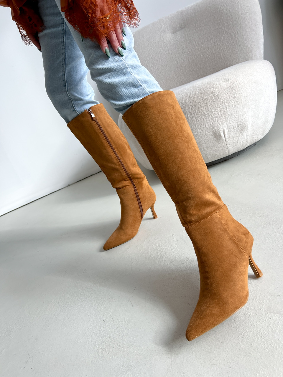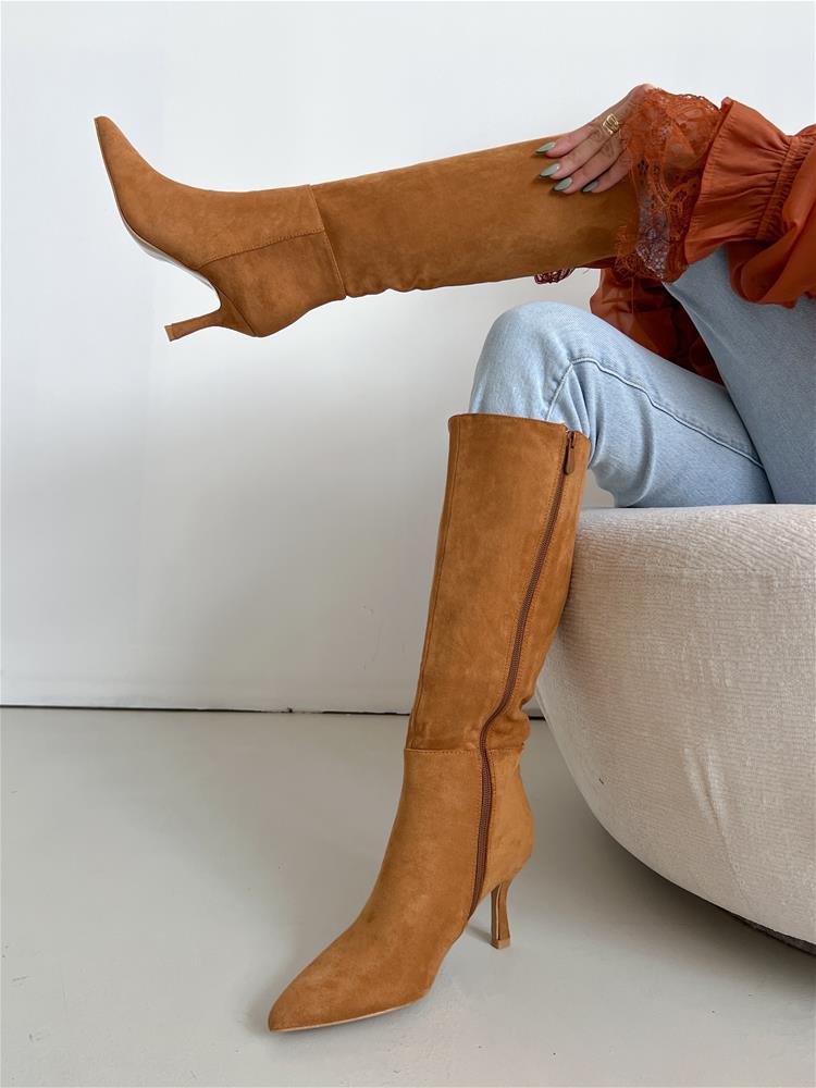 Semišové čižmy pod kolená na mierne vysokom tenkom podpätku (cca 7,5 cm). Z vnútornej bočnej strany je zips na zapínanie. Vnútorná časť je zateplená.