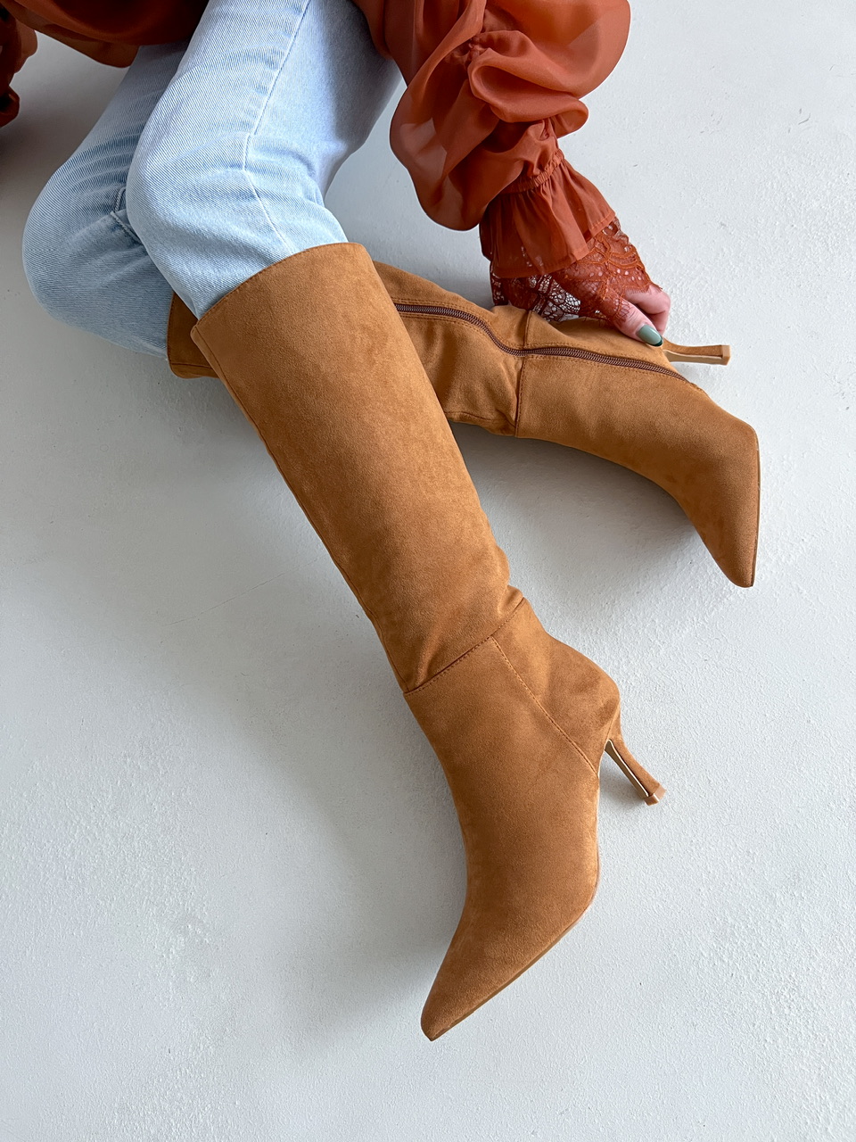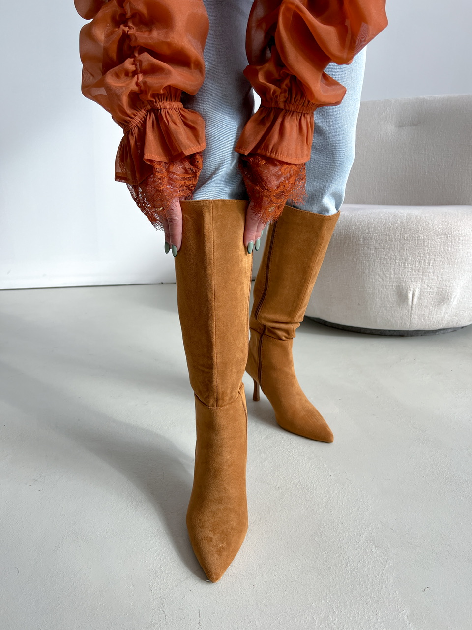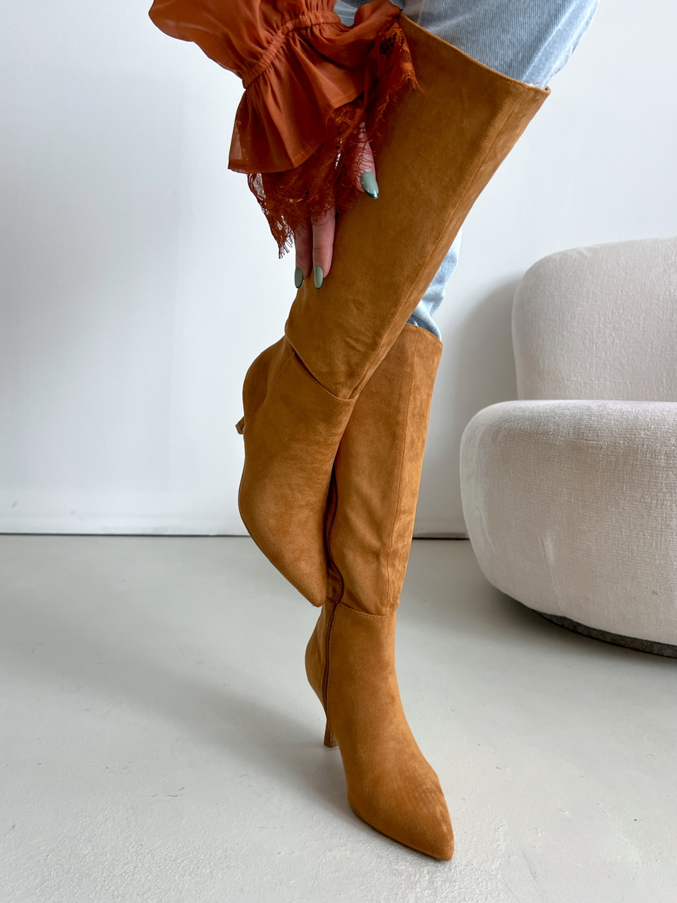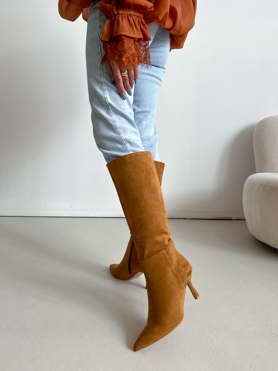Semišové čižmy pod kolená na mierne vysokom tenkom podpätku (cca 7,5 cm). Z vnútornej bočnej strany je zips na zapínanie. Vnútorná časť je zateplená.