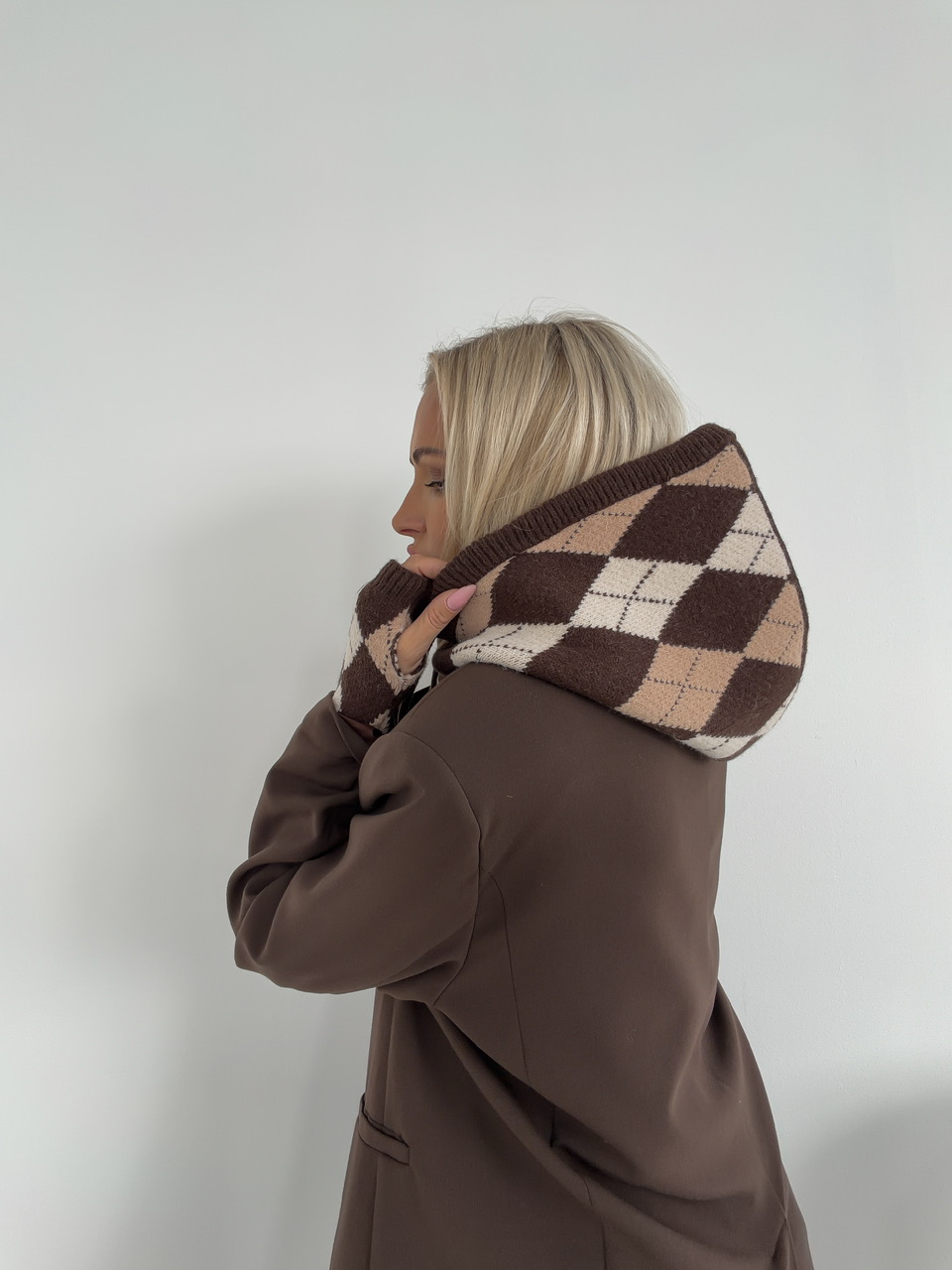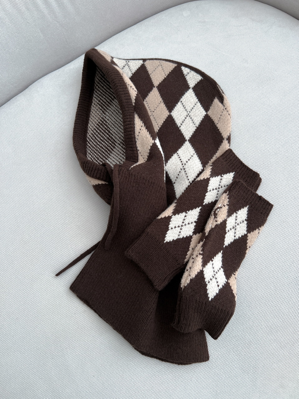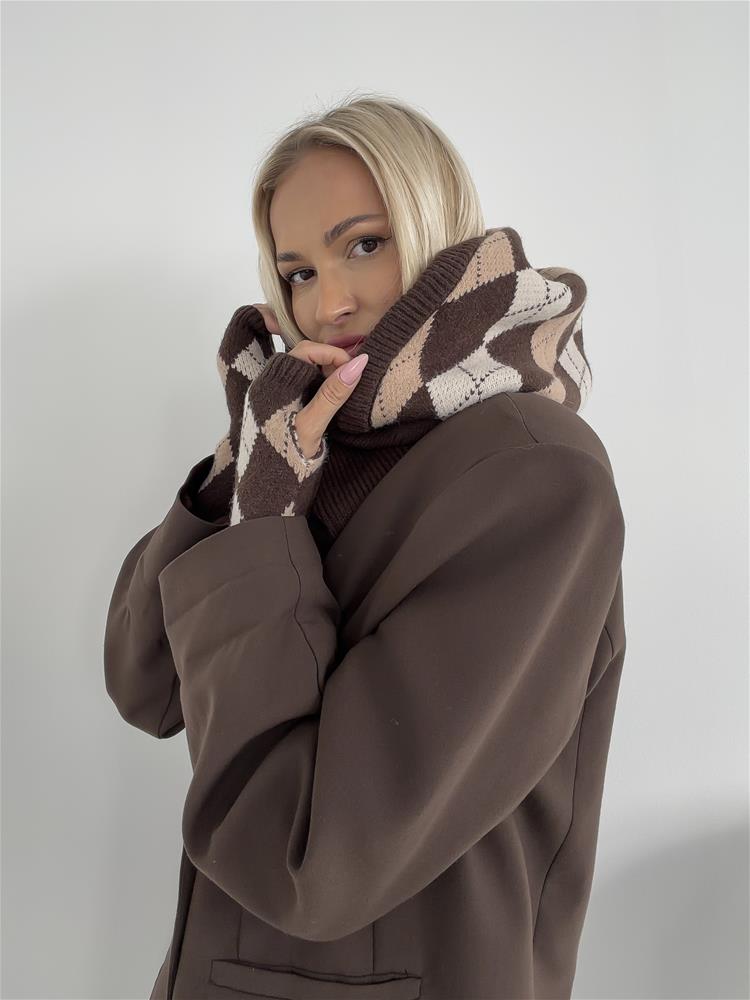 Zimný set, ktorý sa skladá z hrubšej úpletovej kapucne a z rukávnikov.