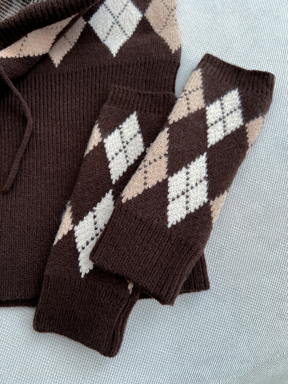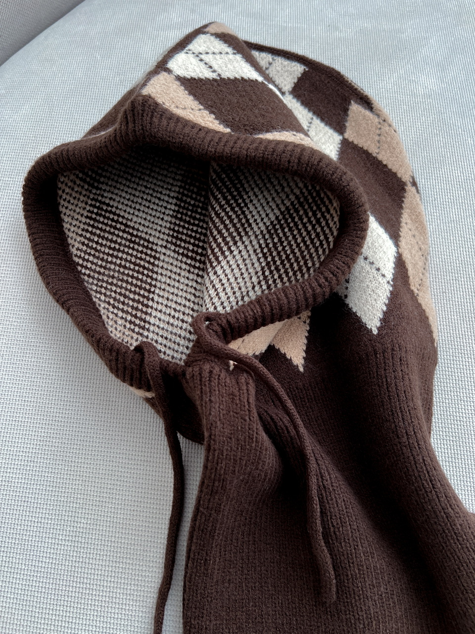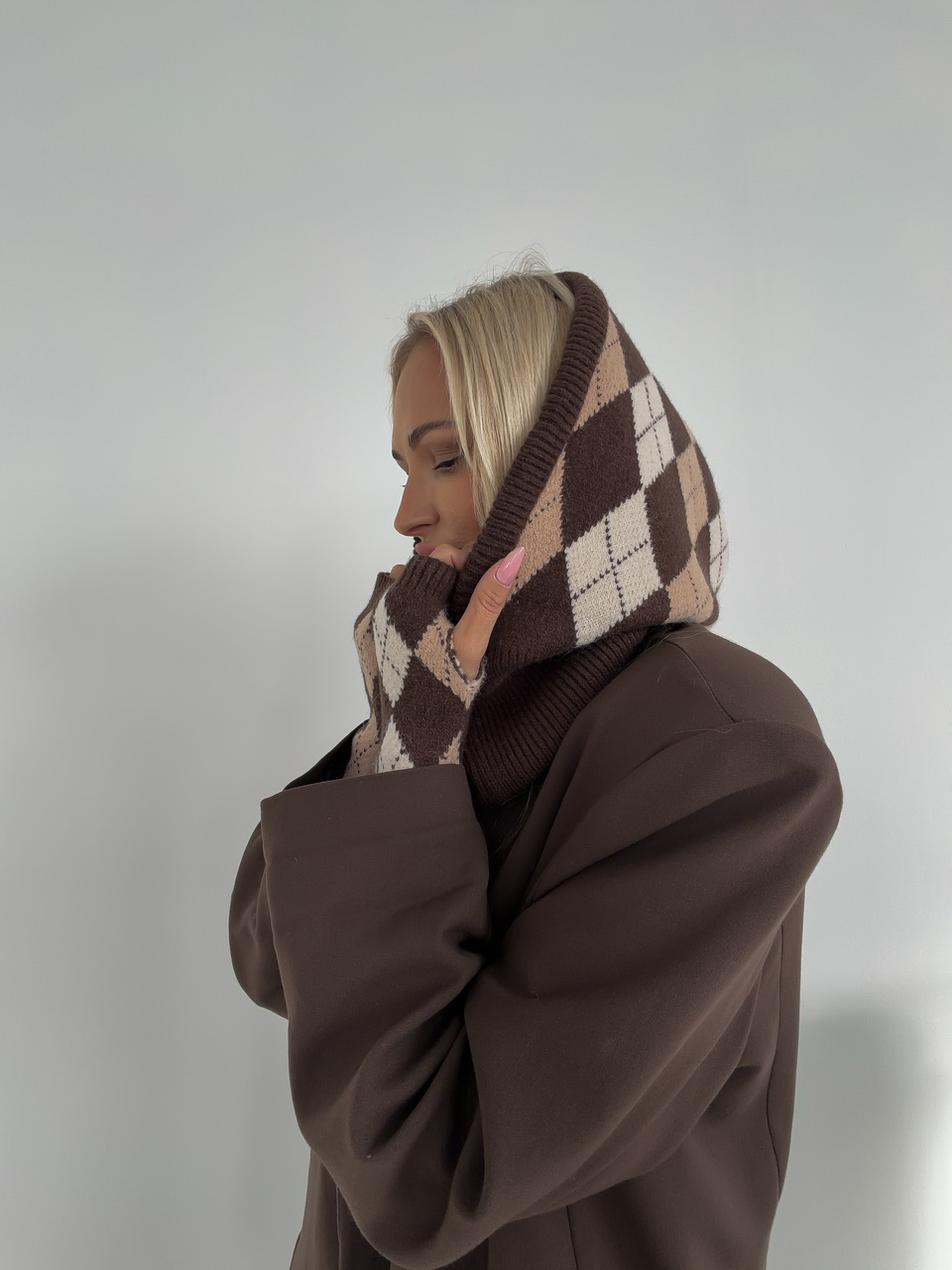 Zimný set, ktorý sa skladá z hrubšej úpletovej kapucne a z rukávnikov.