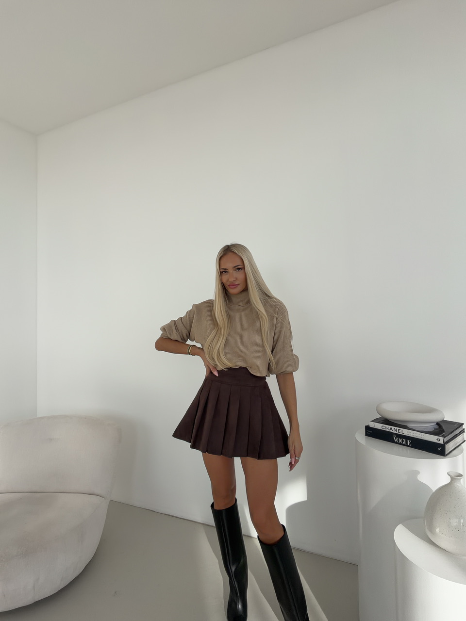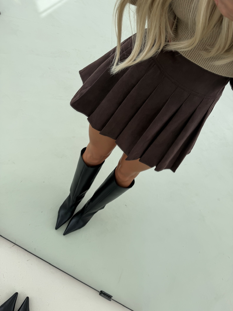 Štýlový a praktický skort (sukňa so skrytými šortkami) je ideálnym kúskom pre pohodlný, no ženský outfit. Semišový materiál pôsobí elegantne, zatiaľ čo plisovaný efekt dodáva modelu trendový a mladistvý vzhľad. Vďaka zapínaniu na skrytý zips perfektne sedí a pri nosení drží svoj tvar. Jemný, príjemný materiál na dotyk.