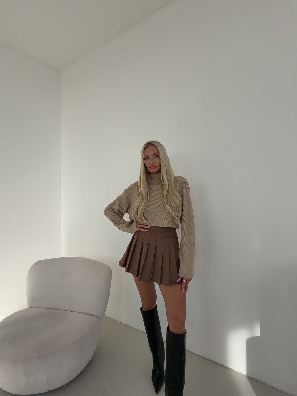 Štýlový a praktický skort (sukňa so skrytými šortkami) je ideálnym kúskom pre pohodlný, no ženský outfit. Semišový materiál pôsobí elegantne, zatiaľ čo plisovaný efekt dodáva modelu trendový a mladistvý vzhľad. Vďaka zapínaniu na skrytý zips perfektne sedí a pri nosení drží svoj tvar. Jemný, príjemný materiál na dotyk.