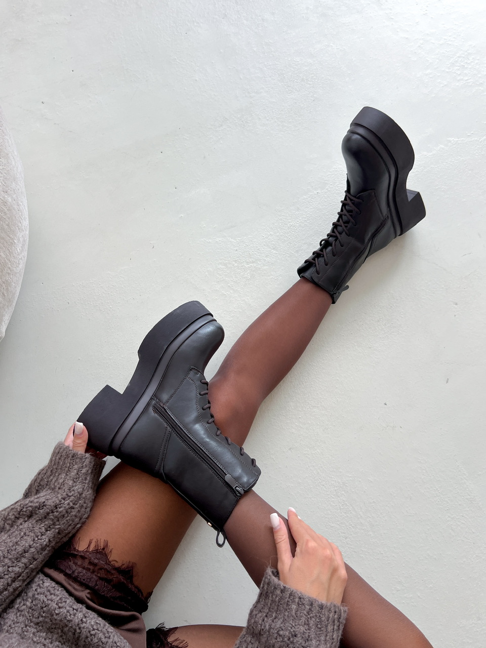 Kotníkove topánky na výraznej podrážke na platforme (cca 3,5 cm a 5,5 cm). Predná časť je na šnurovanie. Z vnútornej bočnej strany je zapínanie na zips. Vnútorná časť je zateplená. Na zadnej časti je ozdobné putko.