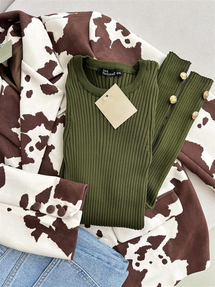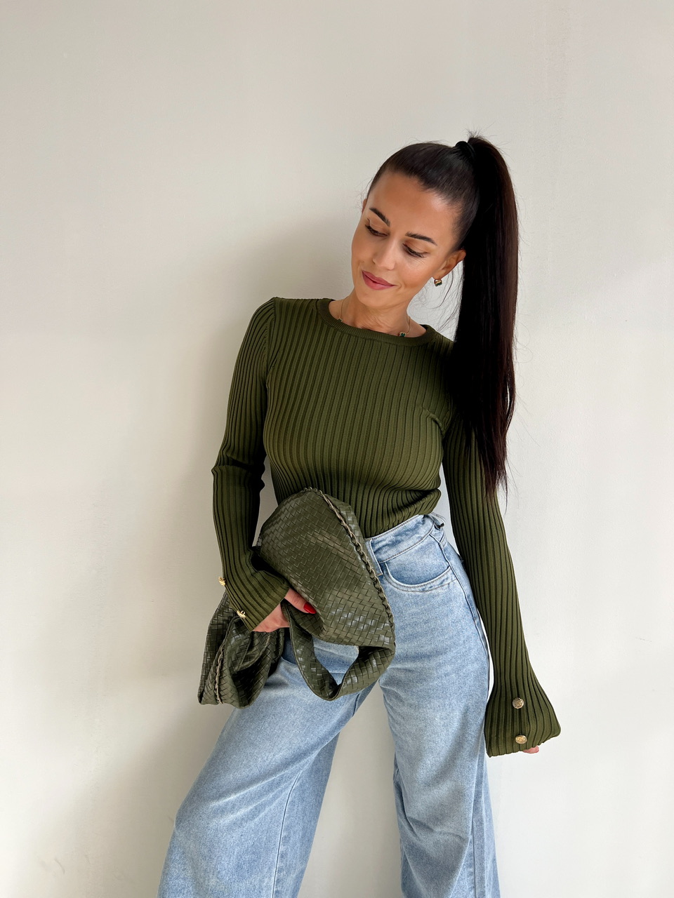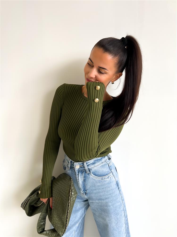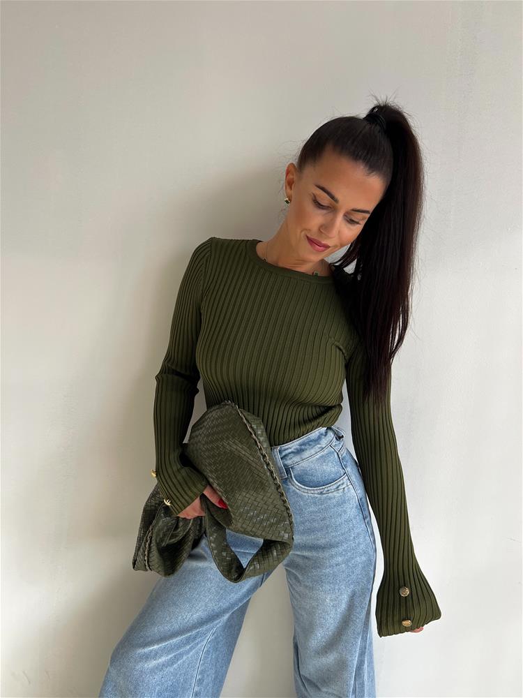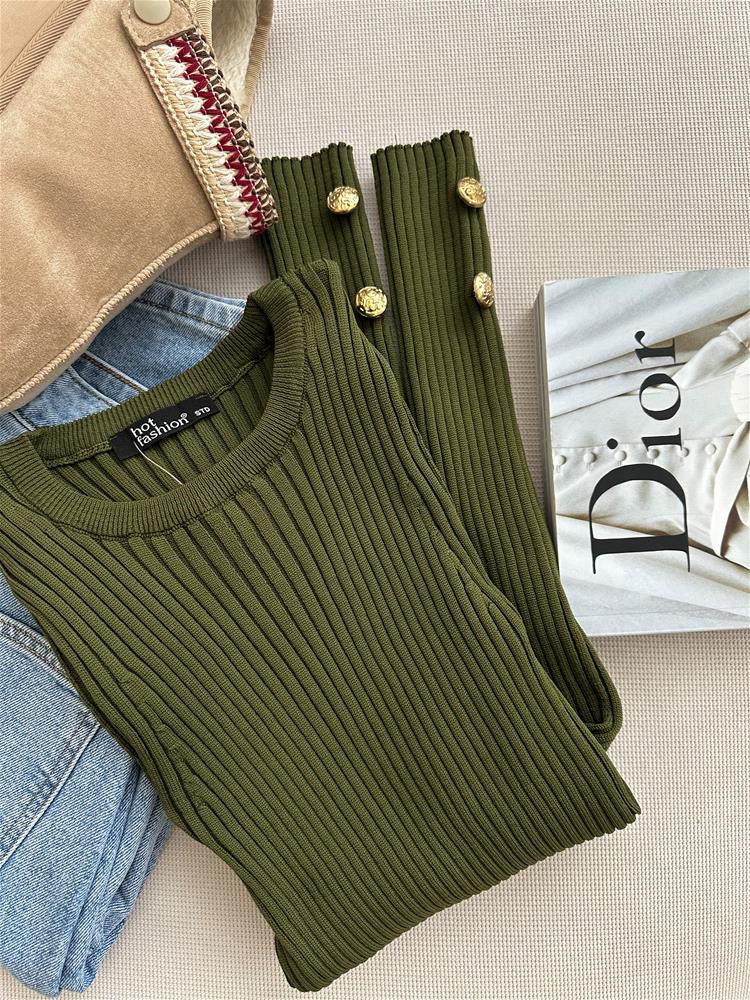 Pulóver s dlhými rukávmi je vyrobený z mäkkej a hrejivej pleteniny, ktorá vás zahalí do komfortu počas celého dňa. Okrúhly výstrih mu dodáva klasický vzhľad, zatiaľ čo jedinečné bočné gombíky na rukávoch pridávajú štýlový detail.
