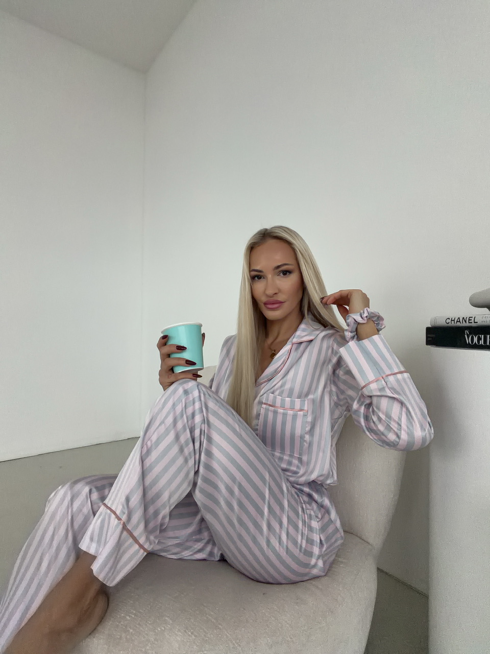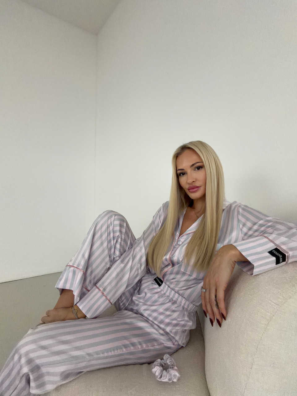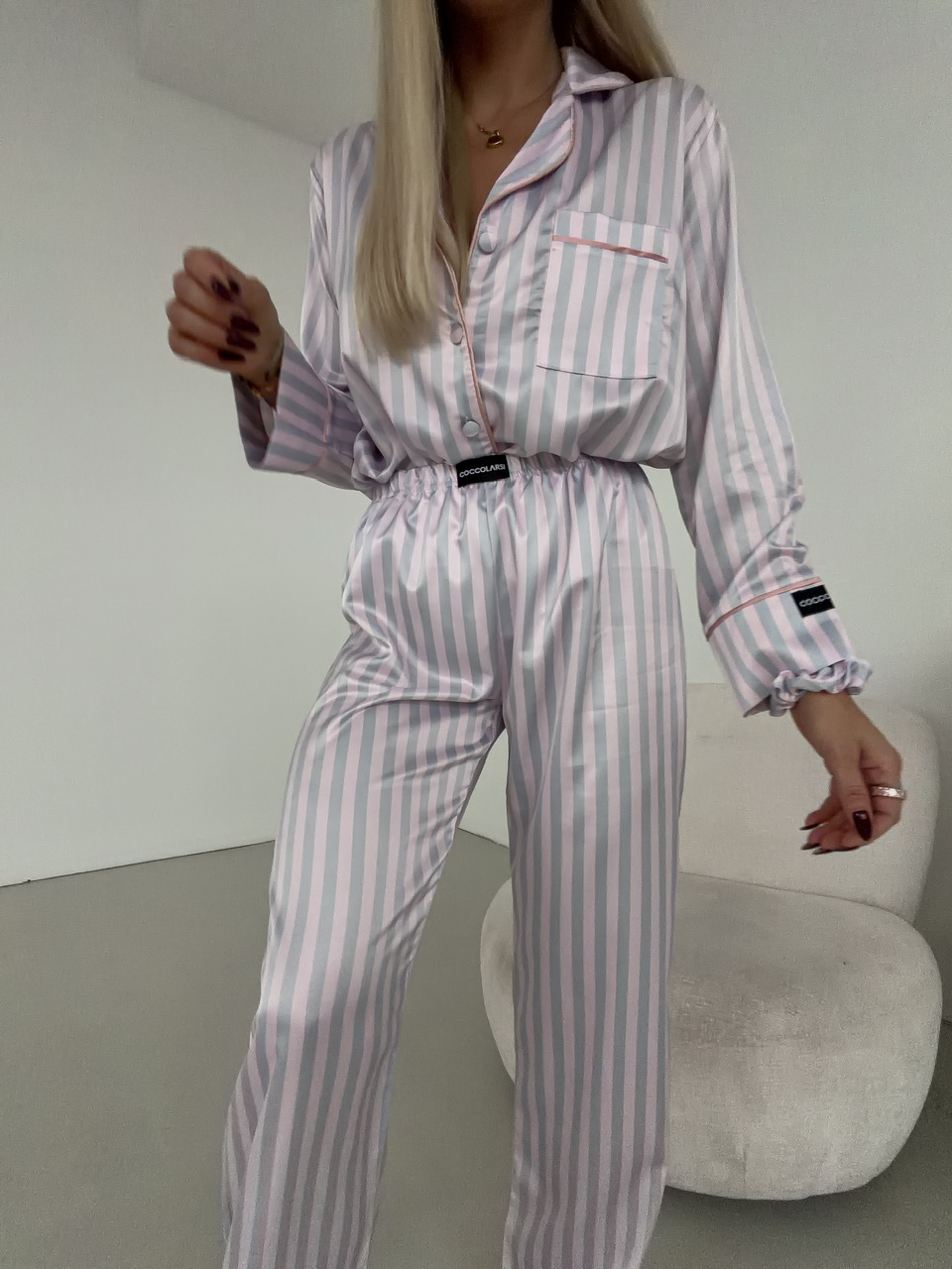 Pohodlný pyžamový komplet pozostáva z košele s jednoradovým zapínaním na gombíky a nohavíc s pohodlným pásom na gumu. Košeľa je navrhnutá tak, aby poskytovala voľnosť pohybu a príjemný pocit pri spánku, zatiaľ čo nohavice s elastickým pásom zaručujú komfort počas celej noci. Súčasťou setu je aj gumička rovnakej farby, ktorá dopĺňa komplet a umožňuje štýlové účesy alebo doplnkové využitie. Tento pyžamový set je ideálny pre pohodlné a zároveň elegantné domáce nosenie.