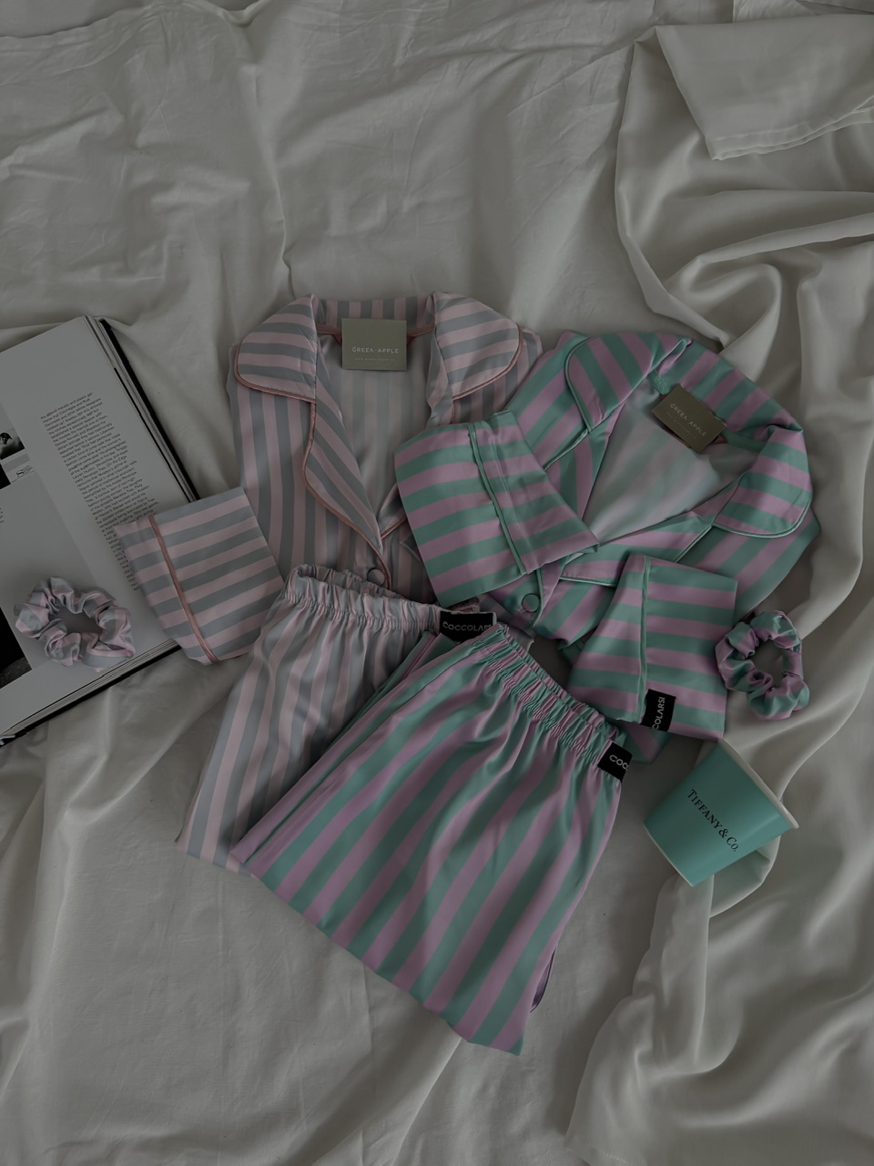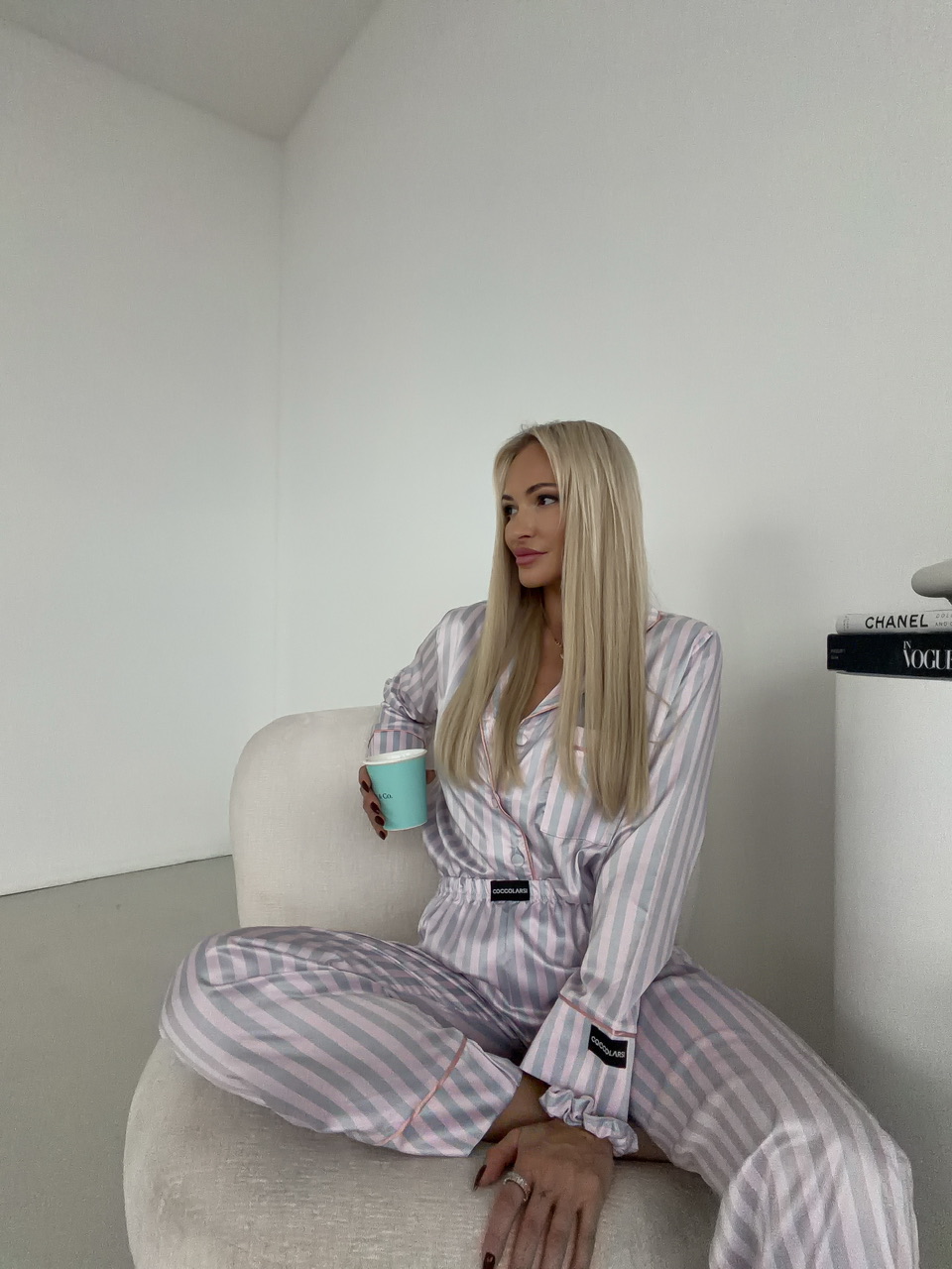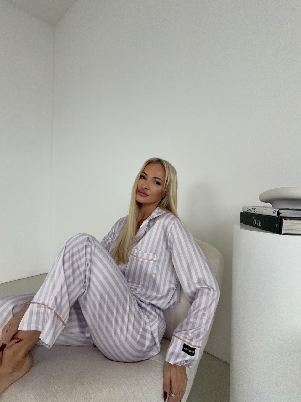 Pohodlný pyžamový komplet pozostáva z košele s jednoradovým zapínaním na gombíky a nohavíc s pohodlným pásom na gumu. Košeľa je navrhnutá tak, aby poskytovala voľnosť pohybu a príjemný pocit pri spánku, zatiaľ čo nohavice s elastickým pásom zaručujú komfort počas celej noci. Súčasťou setu je aj gumička rovnakej farby, ktorá dopĺňa komplet a umožňuje štýlové účesy alebo doplnkové využitie. Tento pyžamový set je ideálny pre pohodlné a zároveň elegantné domáce nosenie.