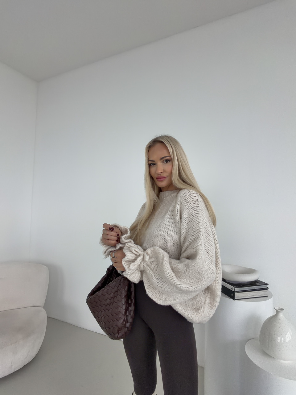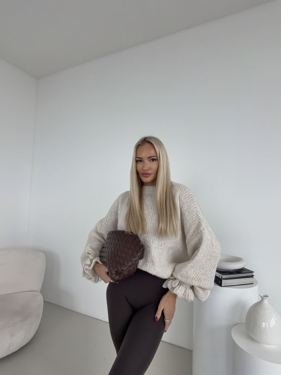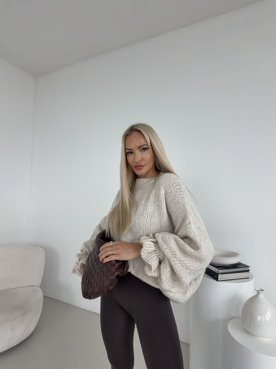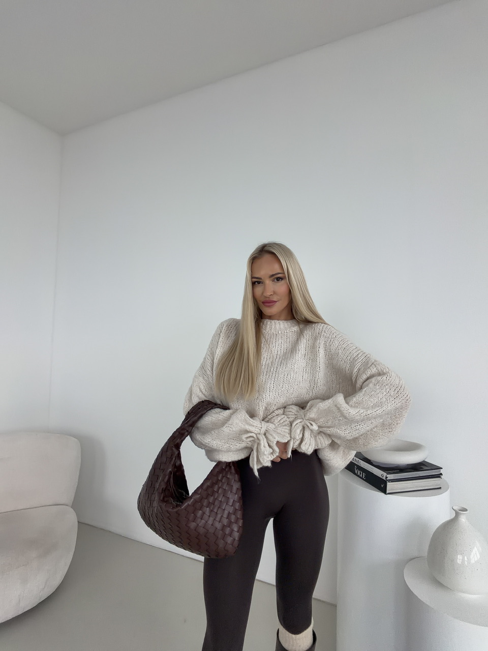 Elegantný, hrejivý a ženský – tento pletený pulover je dokonalým kúskom na jesenné a zimné dni. Vďaka mäkkému úpletu poskytuje maximálne pohodlie, zatiaľ čo originálne pletené mašle na rukávoch dodávajú modelu jedinečný a romantický nádych. Voľný strih bez zapínania umožňuje ľahké vrstvenie a vytvára ležérny, no zároveň štýlový look.