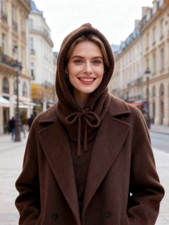 Pletená kapucňa so šnúrkou. Ideálny kúsok ku kabátu, alebo bunde, ktoré nemajú kapucňu.