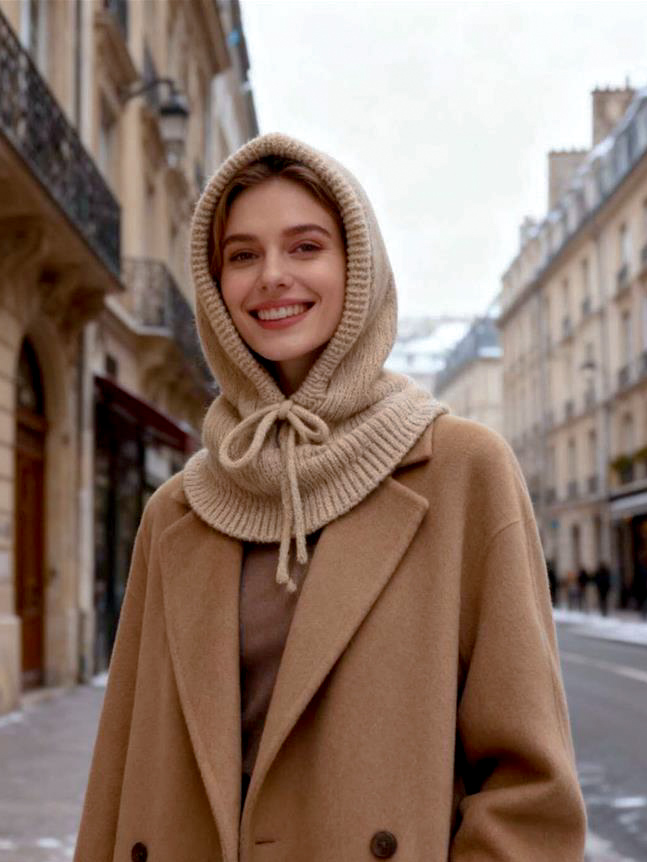 Pletená kapucňa so šnúrkou. Ideálny kúsok ku kabátu, alebo bunde, ktoré nemajú kapucňu.