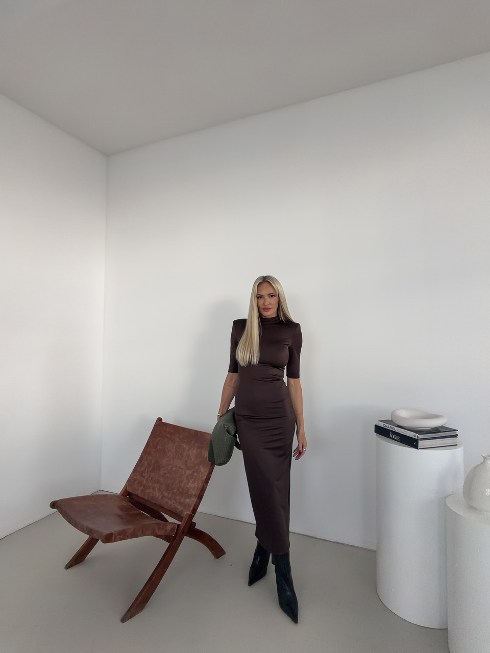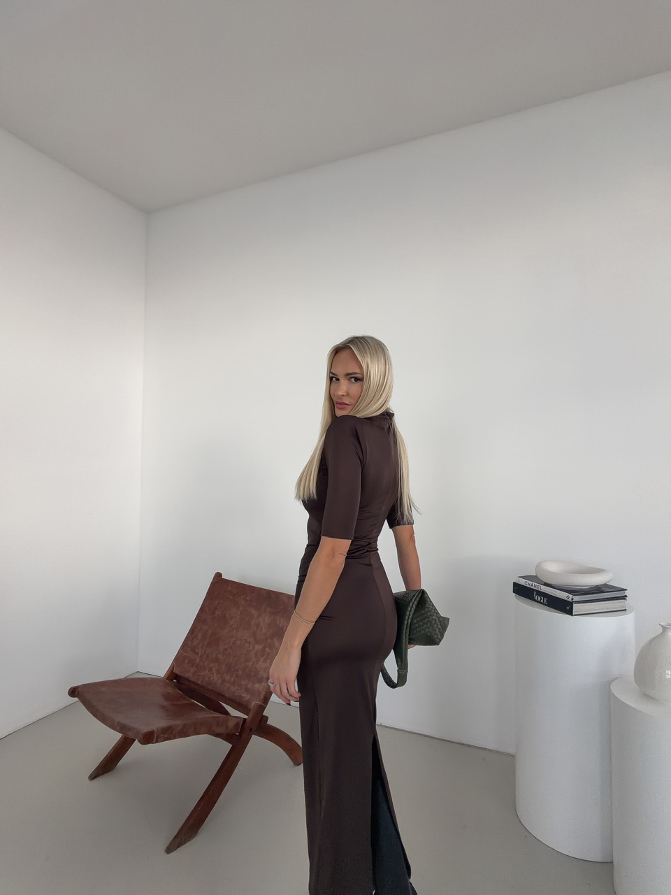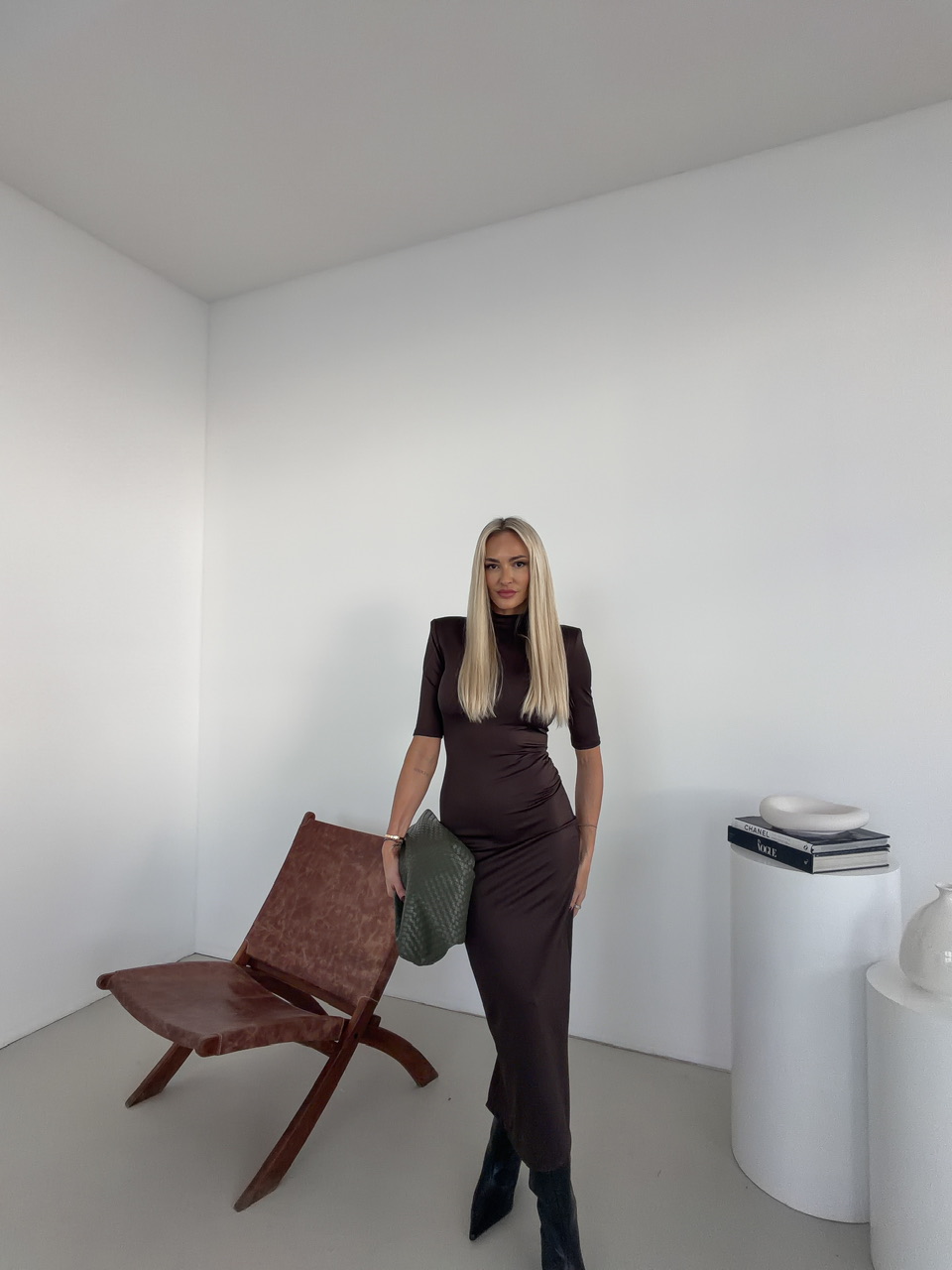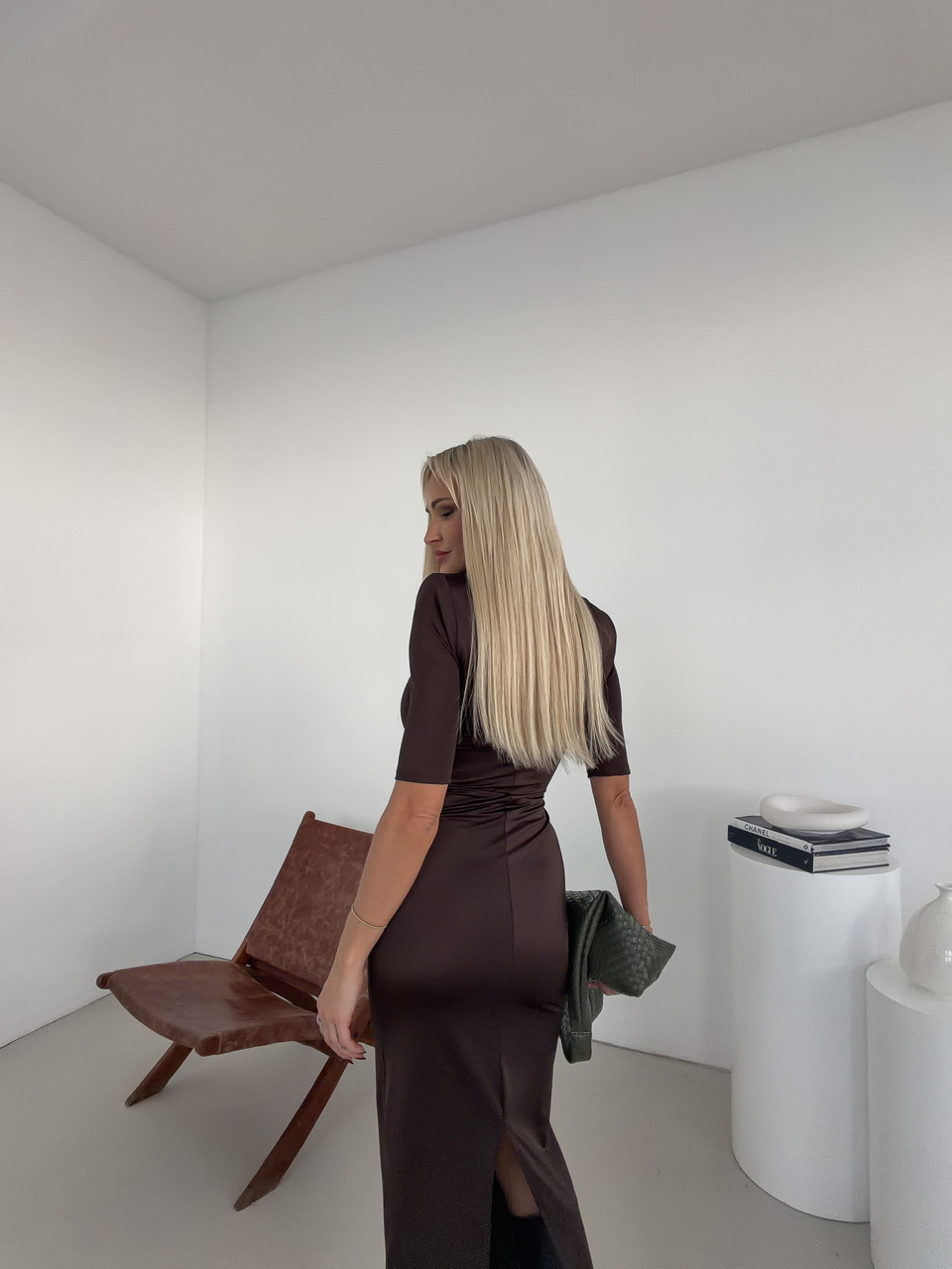 Elegantné šaty, ktoré dokonale zvýraznia postavu a dodajú outfitu upravený, moderný vzhľad. Vypchávky na pleciach krásne tvarujú ramená a vytvárajú efekt vyváženej siluety. Šaty majú trojštvrťové rukávy, vďaka ktorým pôsobia štýlovo a sú vhodné na rôzne príležitosti. Vyrobené sú z príjemného elastického materiálu, ktorý sa dokonale prispôsobí telu, poskytuje pohodlie a zvýrazňuje ženské krivky. Na zadnej strane sa nachádza výrazný véčkový rozparok, ktorý uľahčuje pohyb a zároveň dodáva modelu jemný, elegantný detail.