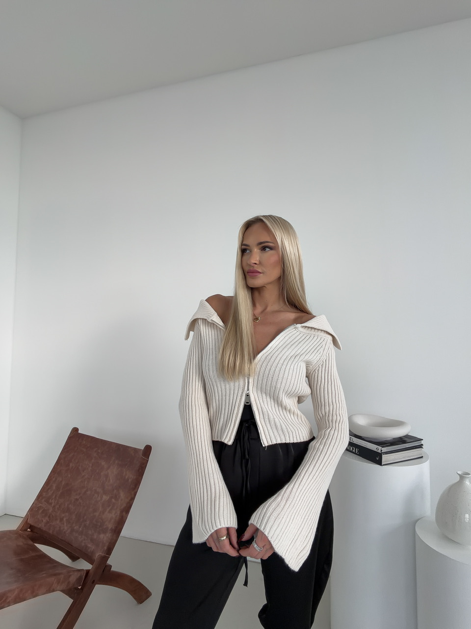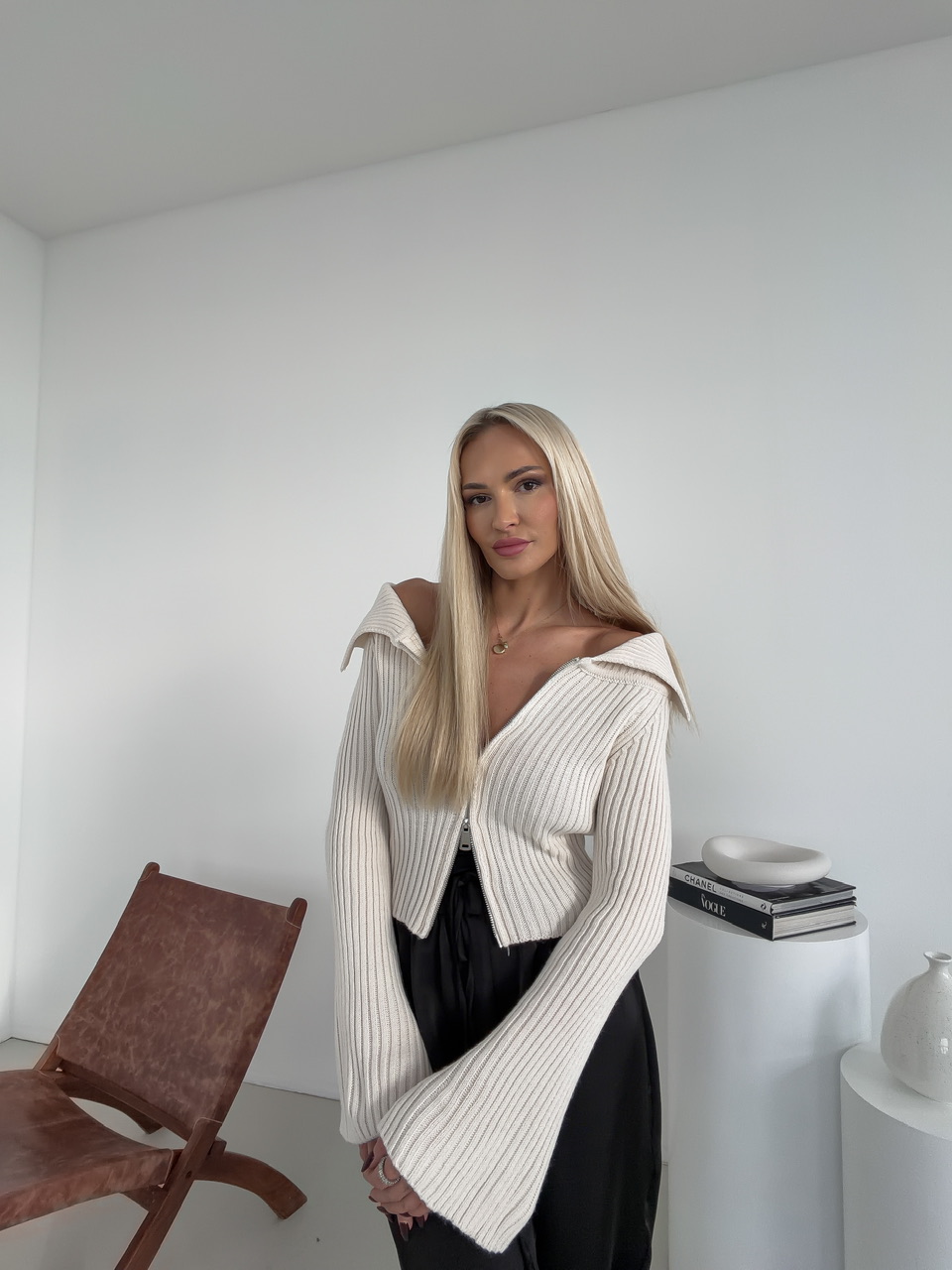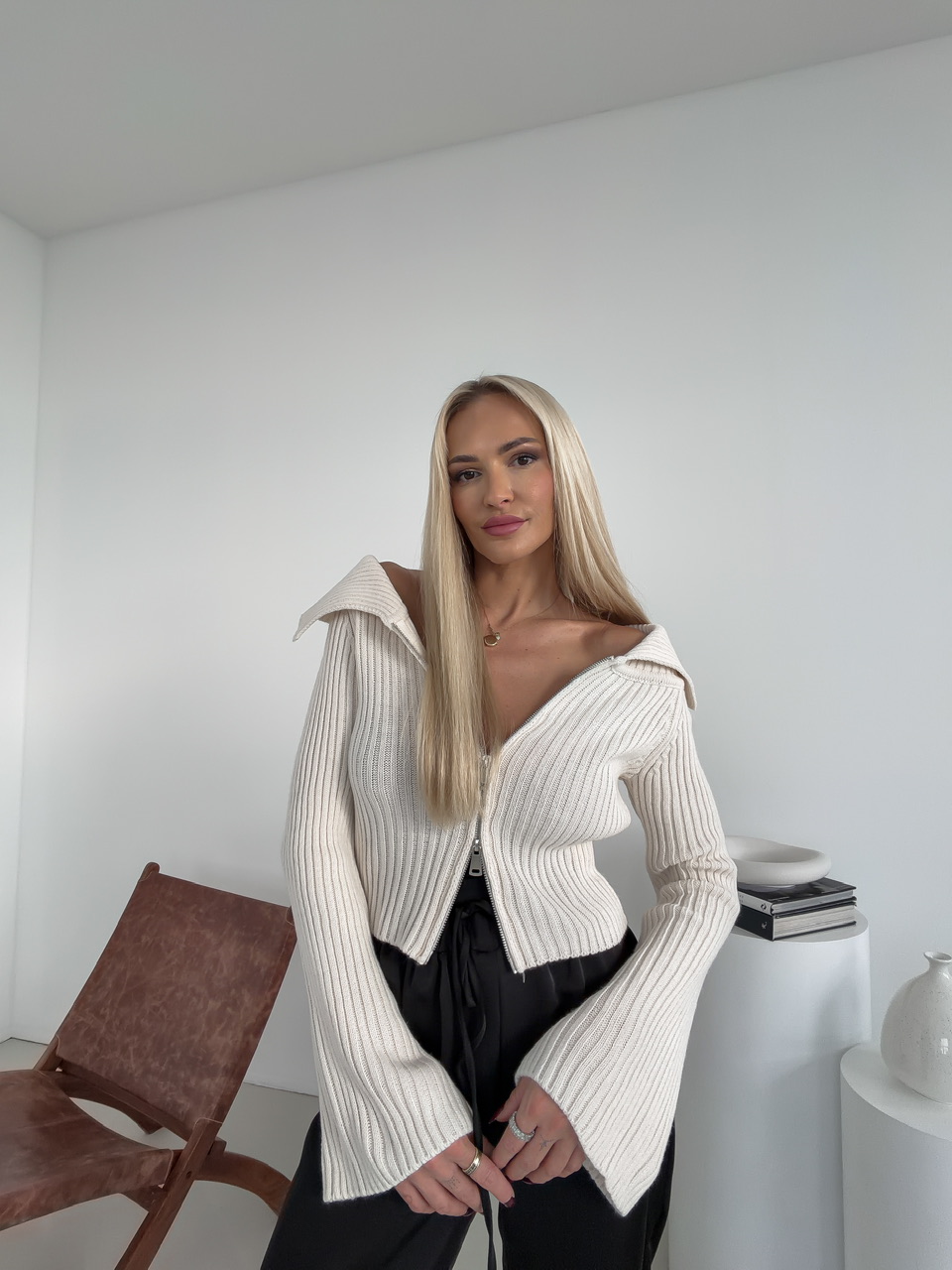Štýlový a pohodlný dámsky sveter, ktorý zaujme moderným dizajnom a prepracovanými detailmi. Predná časť je doplnená o praktické zapínanie na zips, vďaka ktorému si môžeš ľahko prispôsobiť mieru otvorenia. Sveter má rozšírené rukávy, ktoré dodávajú celému kúsku jemne boho nádych a pôsobia ženskejšie a originálne. Vyrobený je z príjemného, elastického materiálu, ktorý sa krásne prispôsobí postave a poskytuje maximálne pohodlie pri nosení.