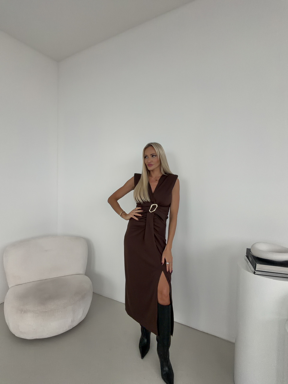 Elegantné šaty pôsobia luxusne a nadčasovo. Hlboký výstrih do „V“, jemné riasenie v páse a ozdobná spona so zlatým detailom krásne zvýraznia postavu a dodajú outfitu ženský šarm. Perfektná voľba výnimočné príležitosti, kde chceš zažiariť. Dopraj si šaty, ktoré zaujmú svojou jednoduchosťou a elegantným prevedením.