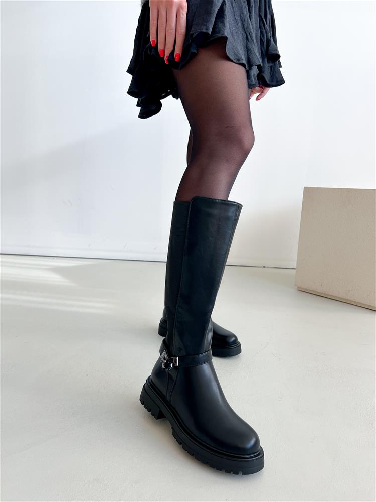 Čierne čižmy pod kolená na nízkej traktorovej podrážke. Okolo kotníku je remienok s tmavou kovovou prackou. Na zadnej časti sáry sú elastické panely. Z vnútornej bočnej strany je zips na zapínanie. Vnútorná časť je zateplená.