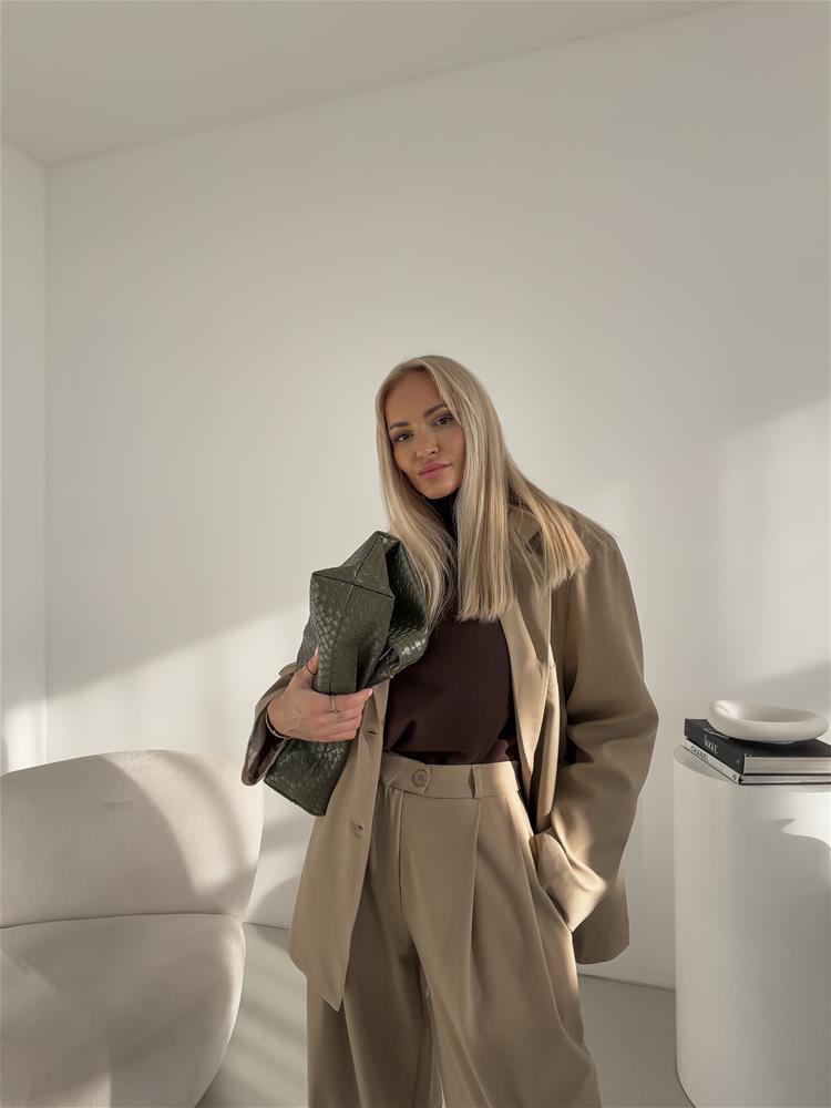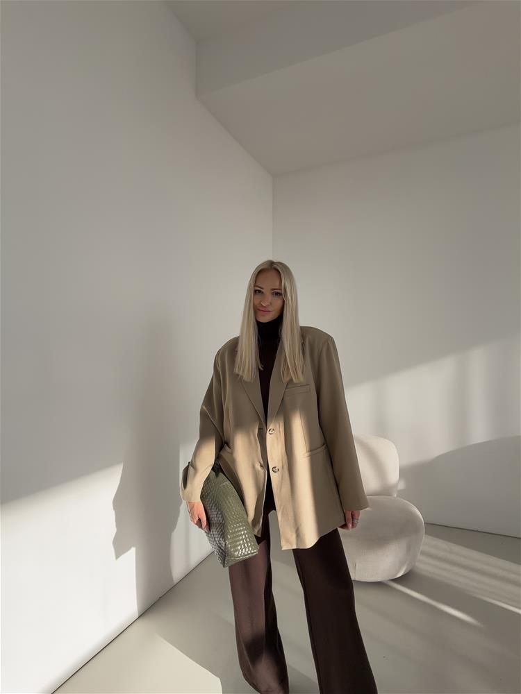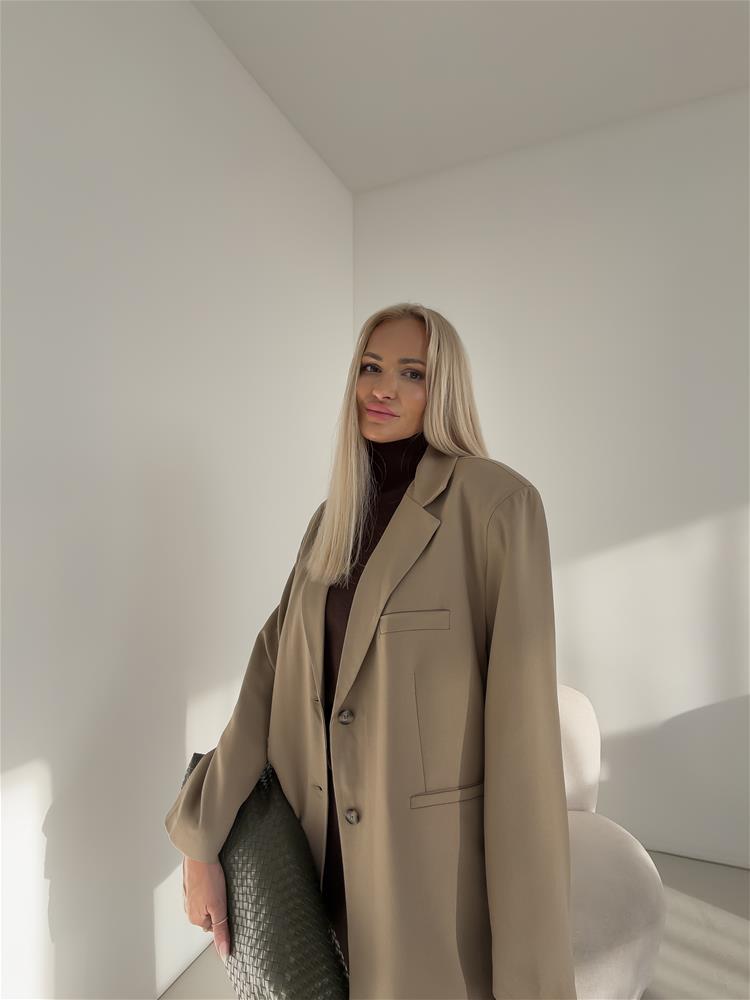 Oversize sako, ktoré má zapínanie na dva gombíky. S vypchávkami na pleciach a falošnými vreckami vpredu. Sako je podšité.