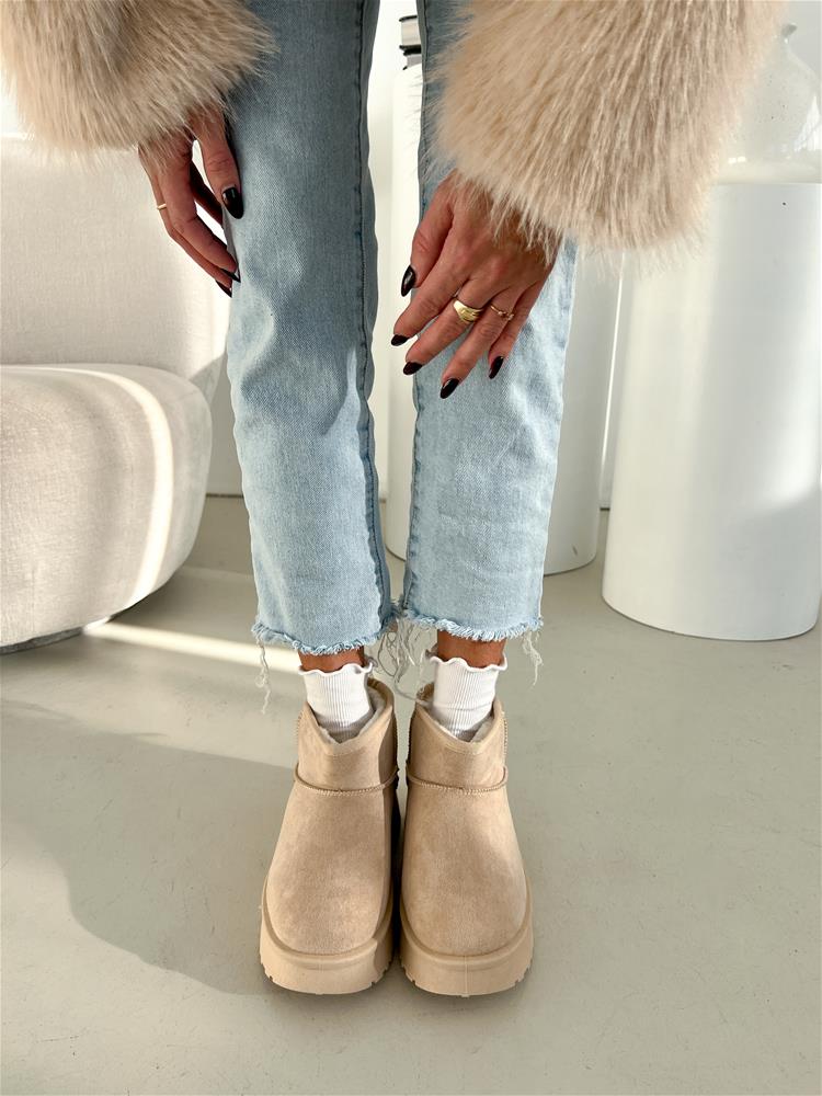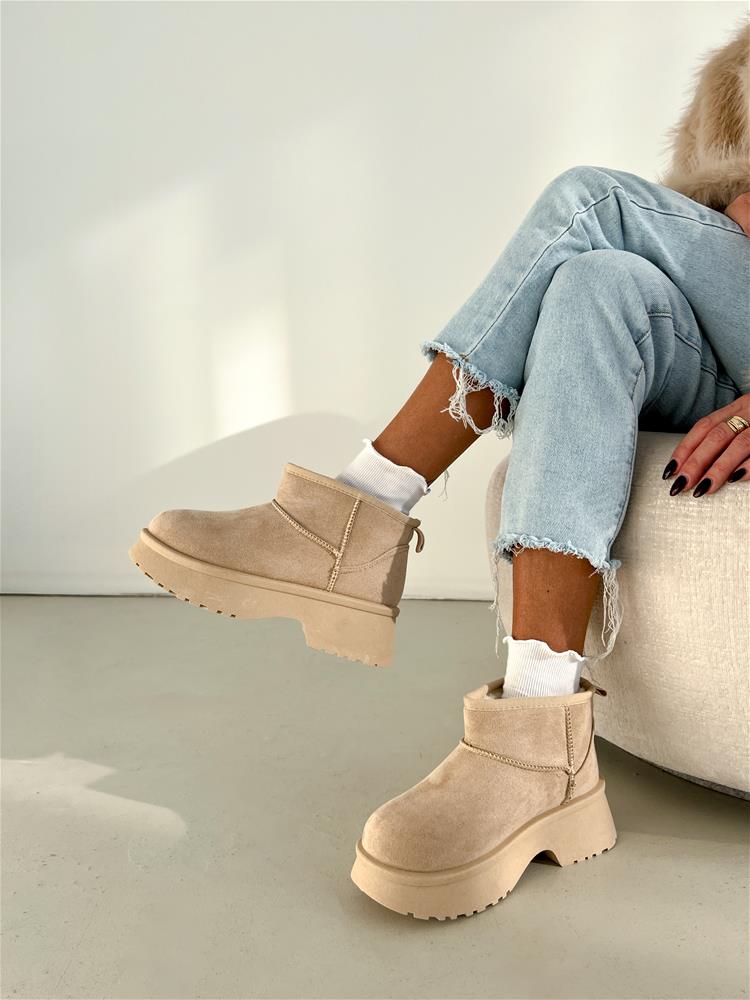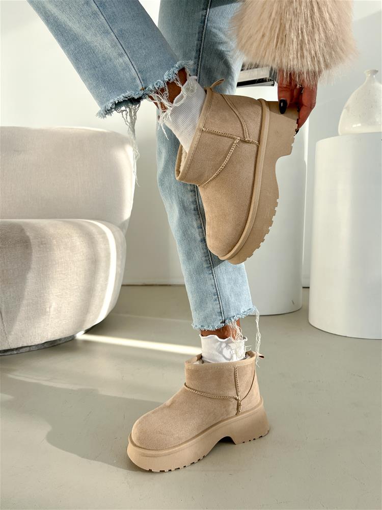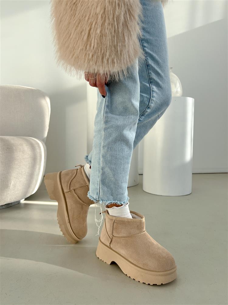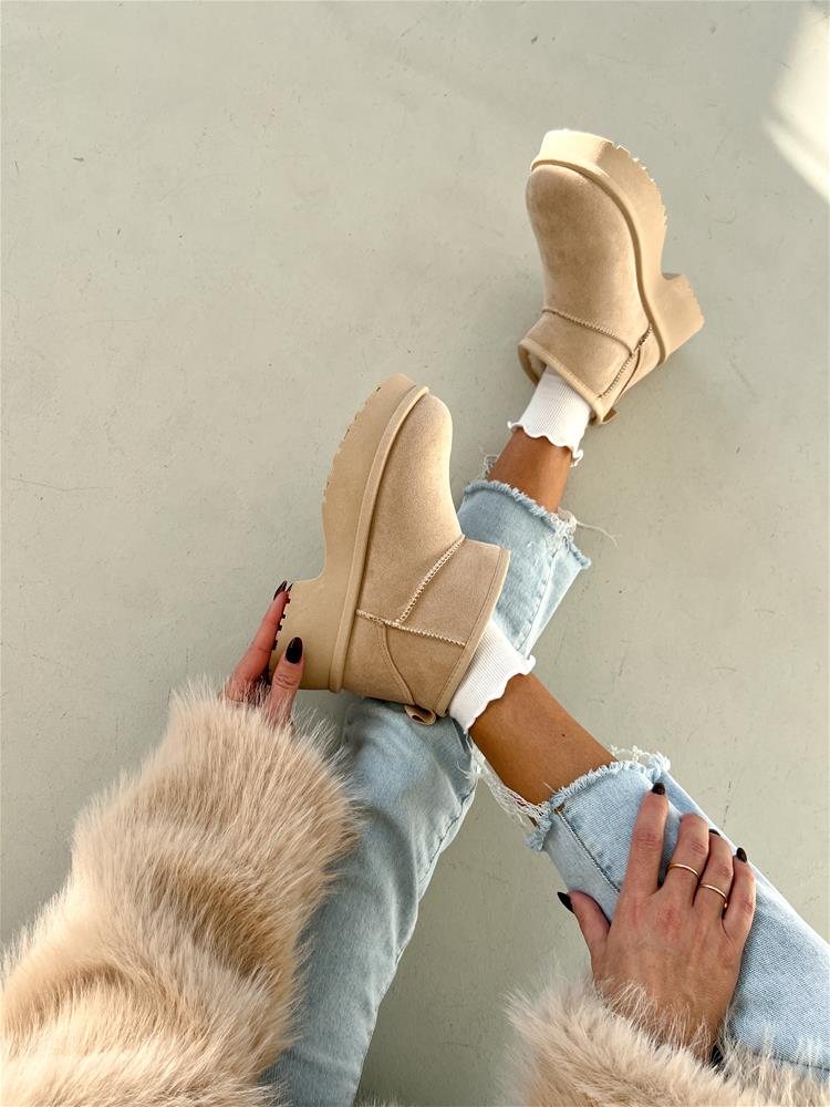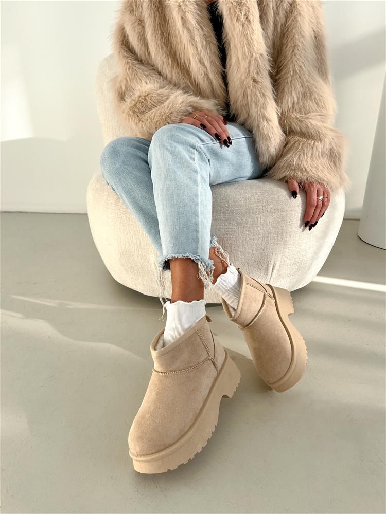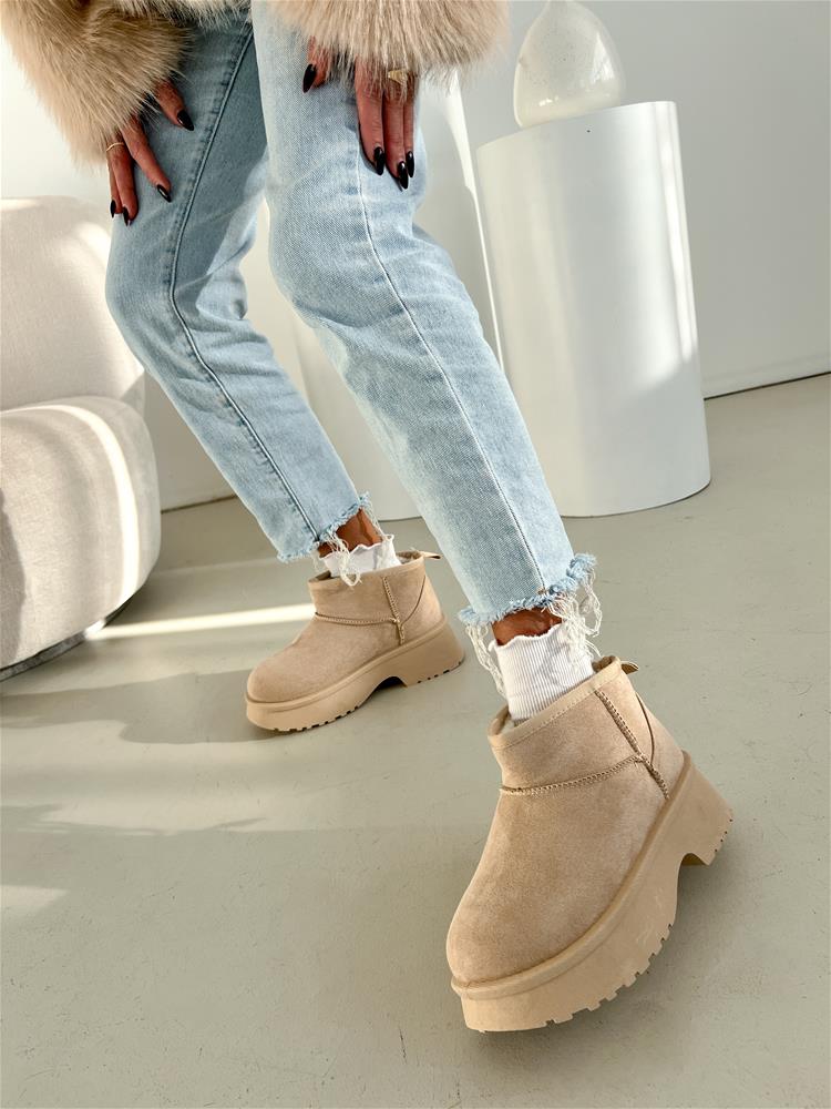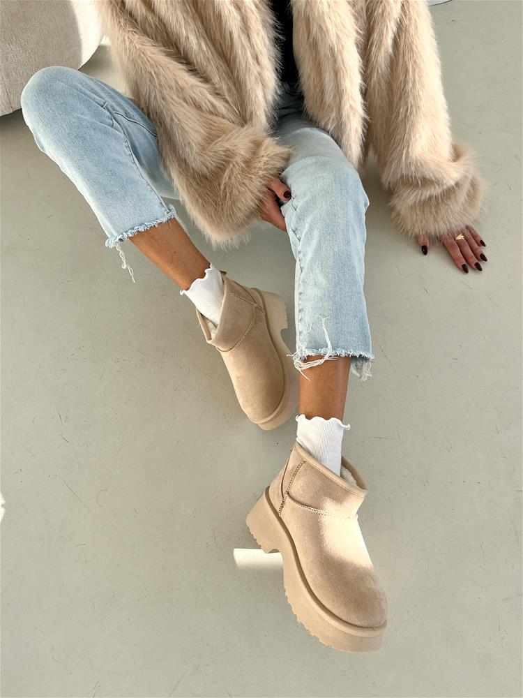 Členkové čižmy na výraznej platformovej podrážke (cca 3 cm a 5,5 cm). Zvršok je semišového materiálu. Vnútorná časť je zateplená umelou kožušinou. Na zadnej strane je ozdobné putko.