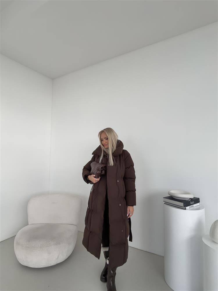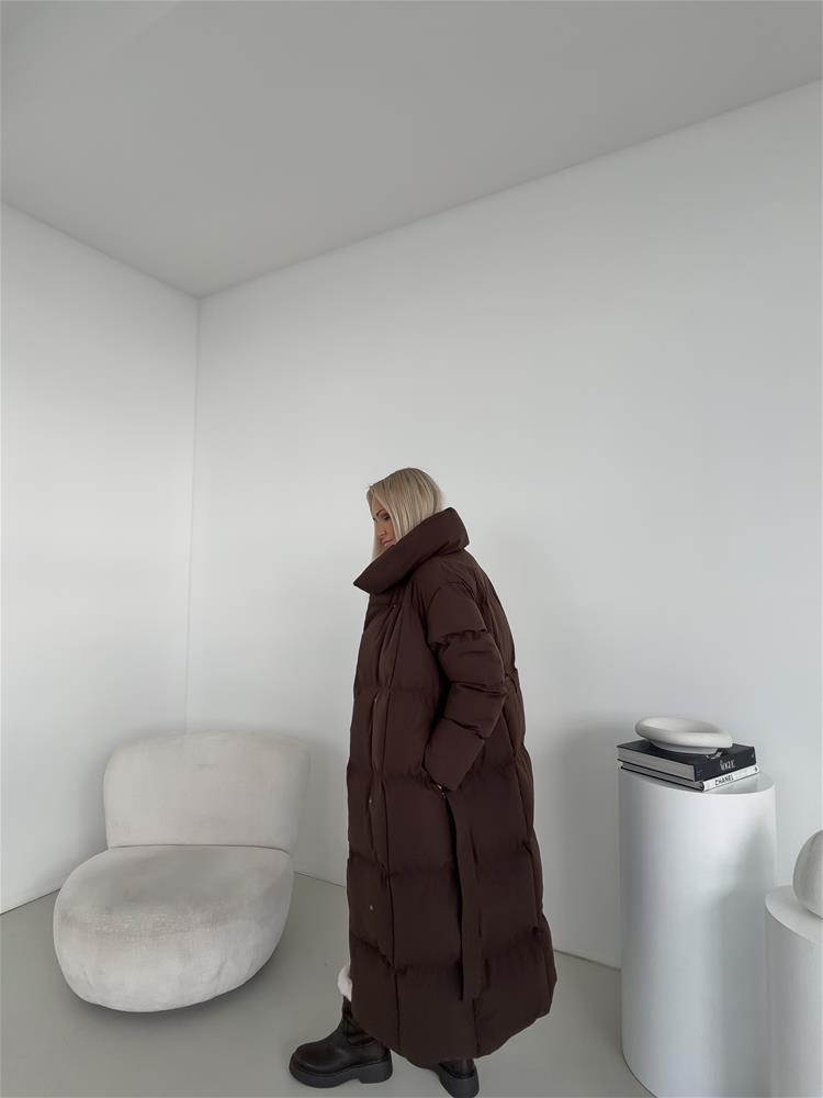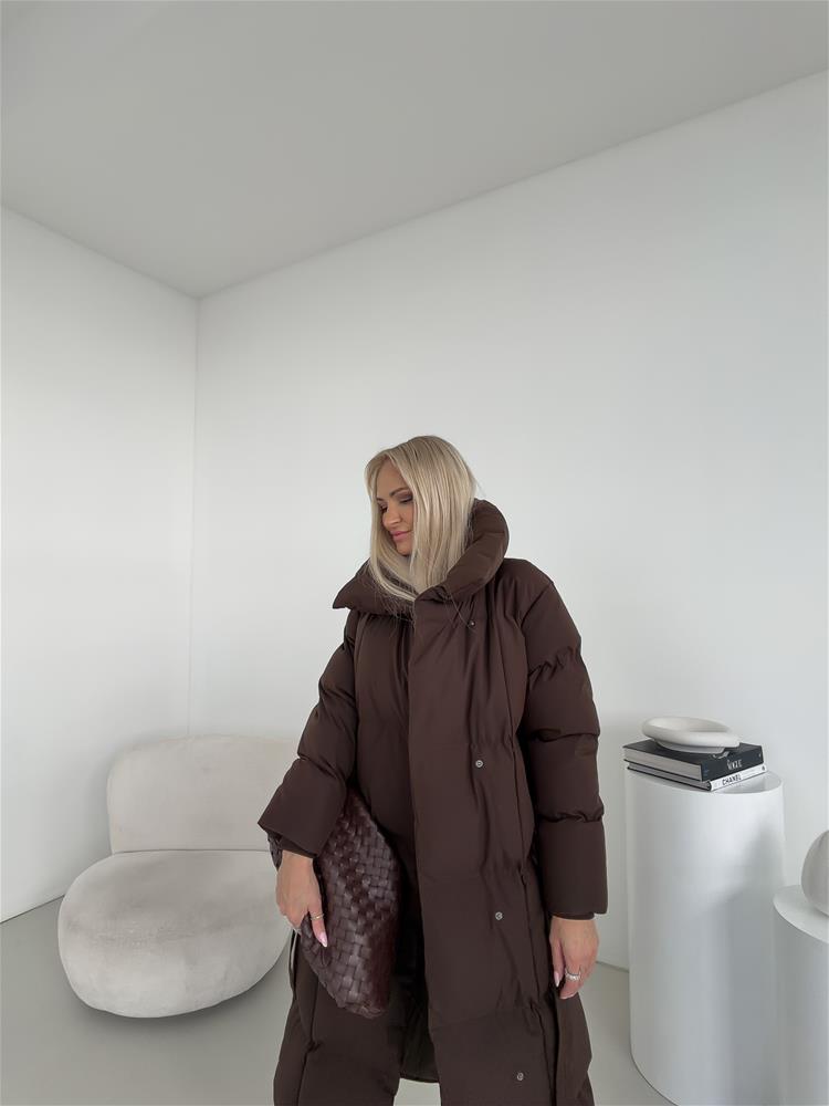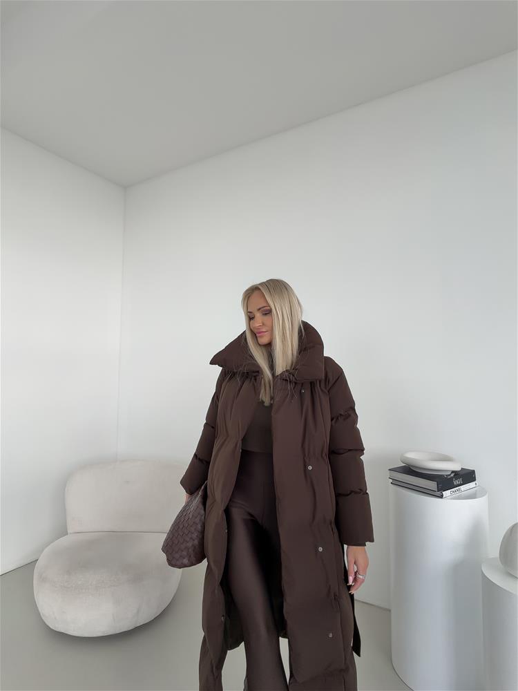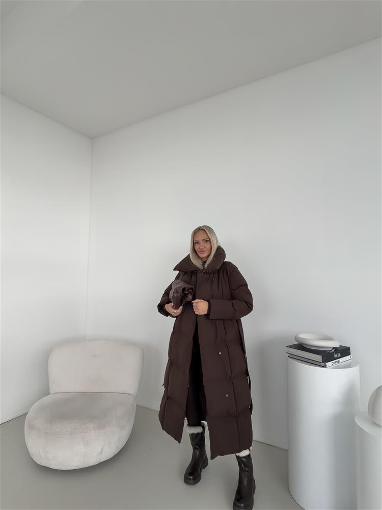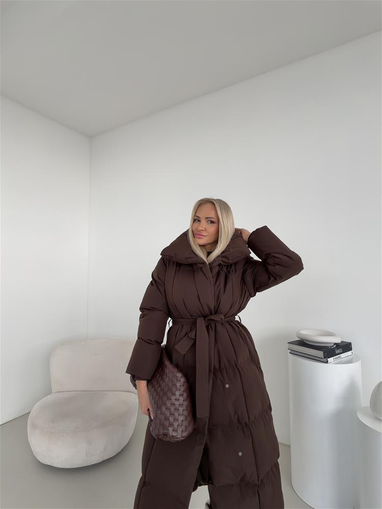 Elegantná dlhá hnedá zimná bunda je ideálnou voľbou do chladných dní. Je vyrobená z kvalitného, hrejivého materiálu, ktorý zabezpečuje komfort a ochranu pred zimou. Bunda má zapínanie na gombíky a je doplnená o zaväzovanie v páse, vďaka ktorému si môžete prispôsobiť siluetu a zvýrazniť tvar postavy. Praktické bočné vrecká so zipsom poskytujú dostatok priestoru na drobnosti a zároveň chránia obsah pred vypadnutím. Golier dodáva bunde elegantný vzhľad a pomáha chrániť krk pred chladom.