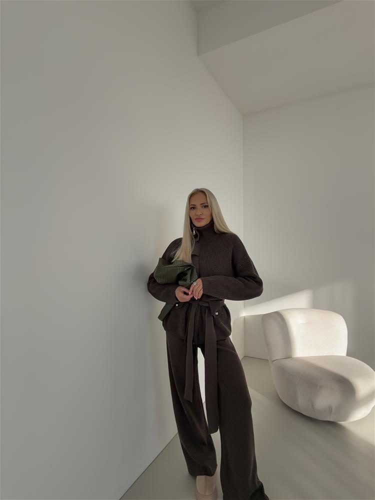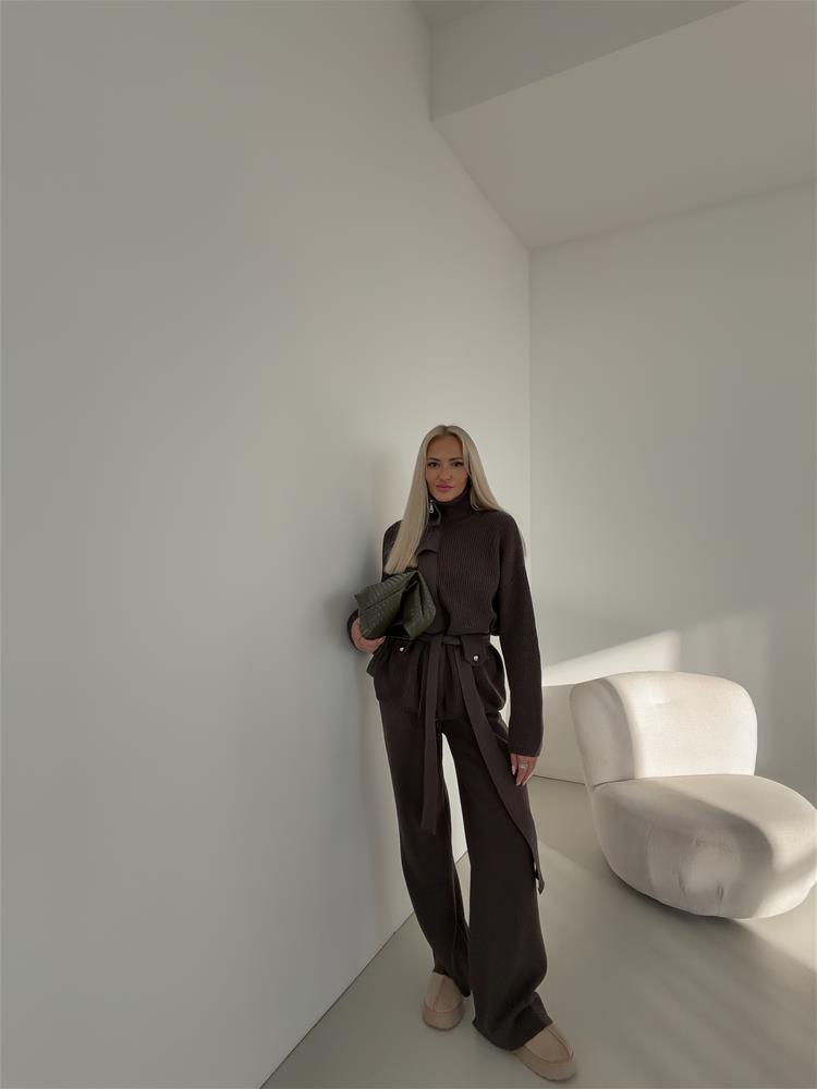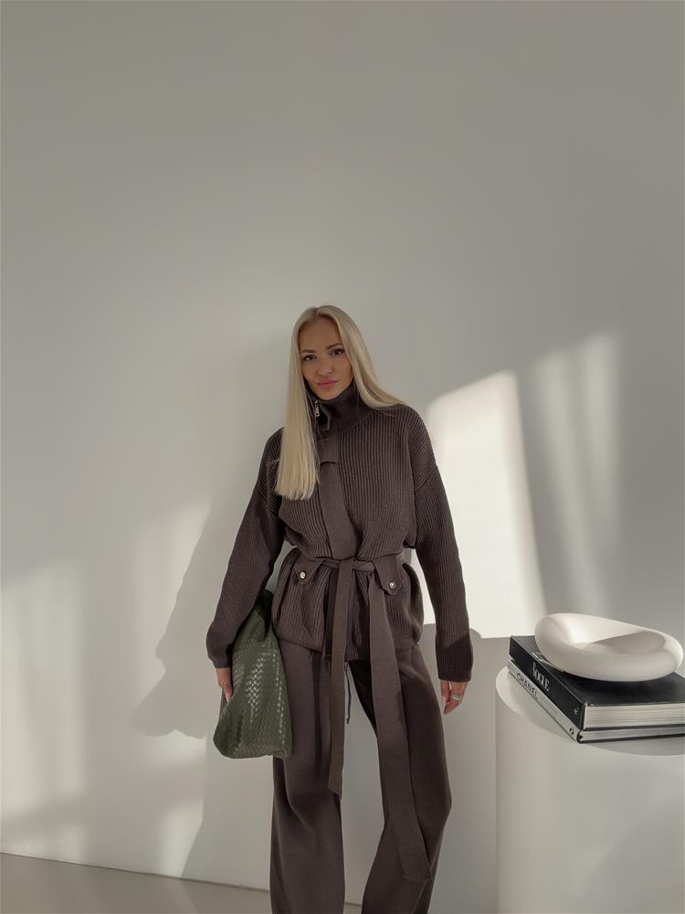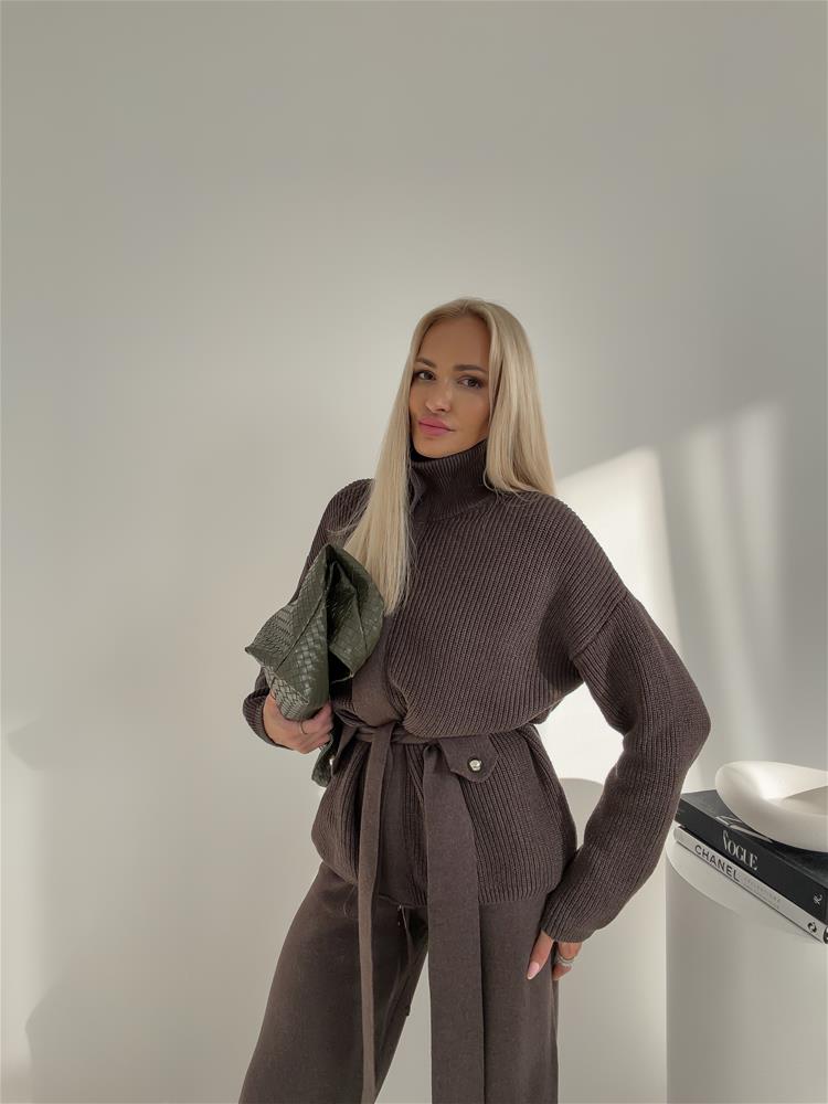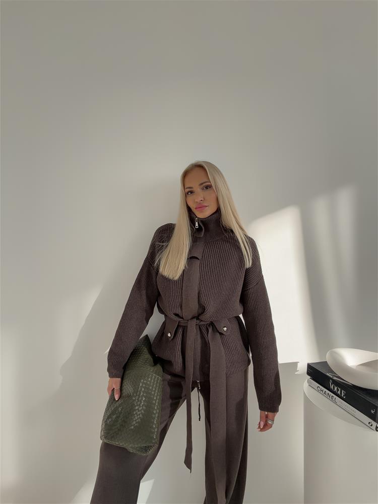 Sveter so zapínaním na zips a gombík v zaujímavom strihu pridáva moderný a dynamický prvok, ktorý zaujme na prvý pohľad. Sveter je doplnený o opasok v rovnakej farbe, ktorý umožňuje prispôsobenie strihu postave a vytvorenie dokonalej siluety. Tento kúsok je ideálny na každodenné nosenie, stretnutia s priateľmi aj štýlové voľnočasové outfity.