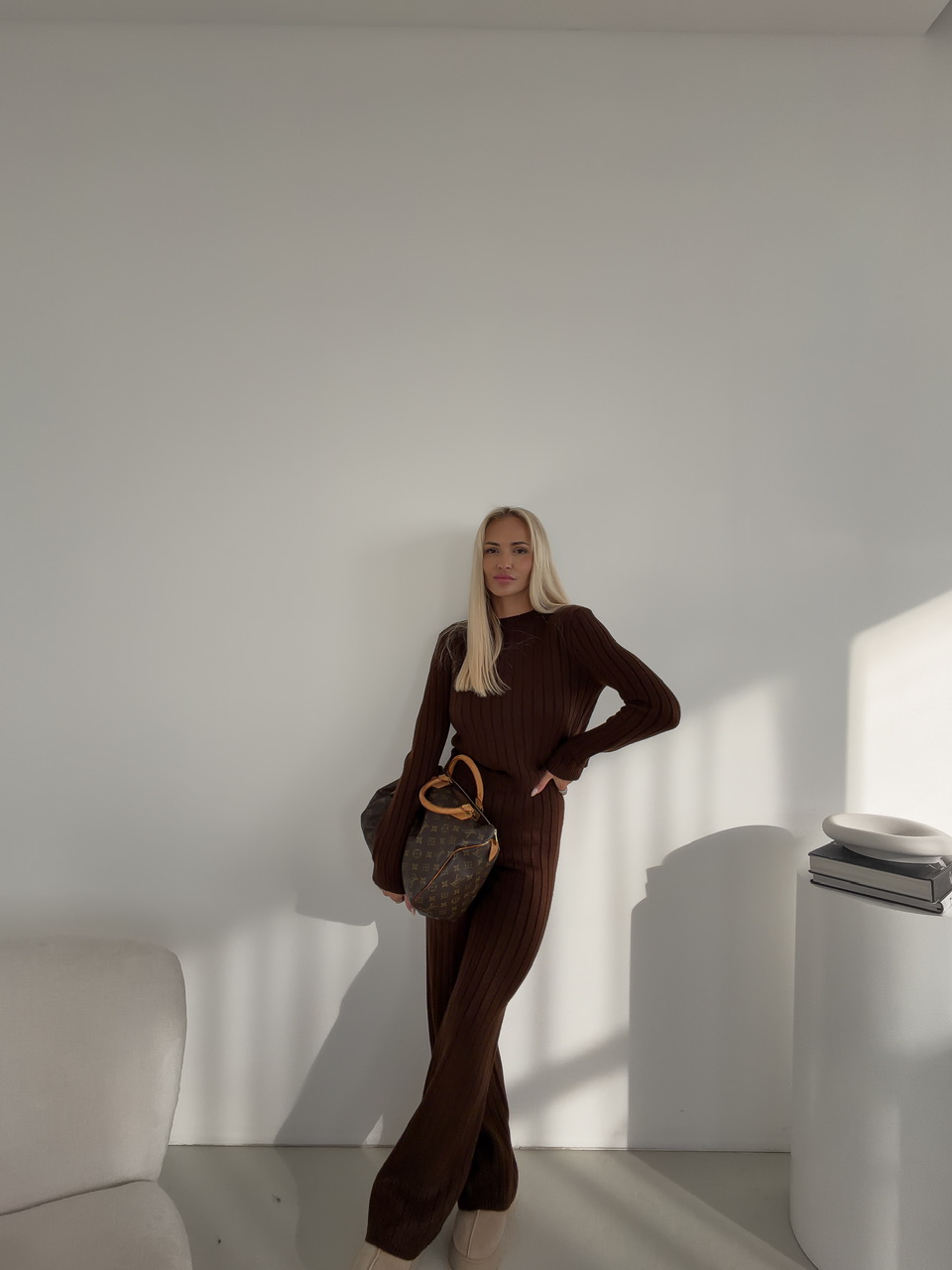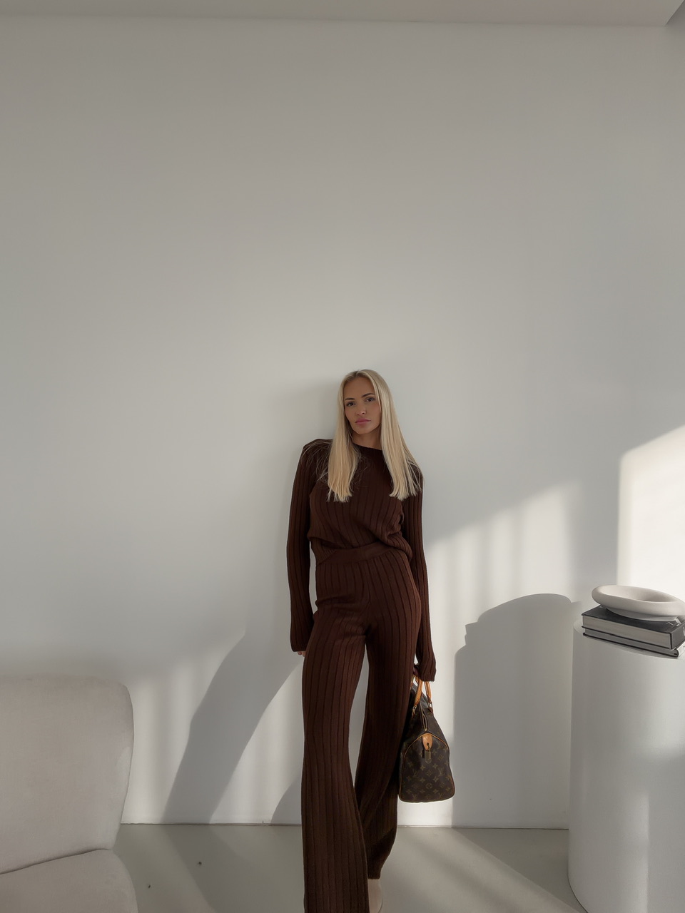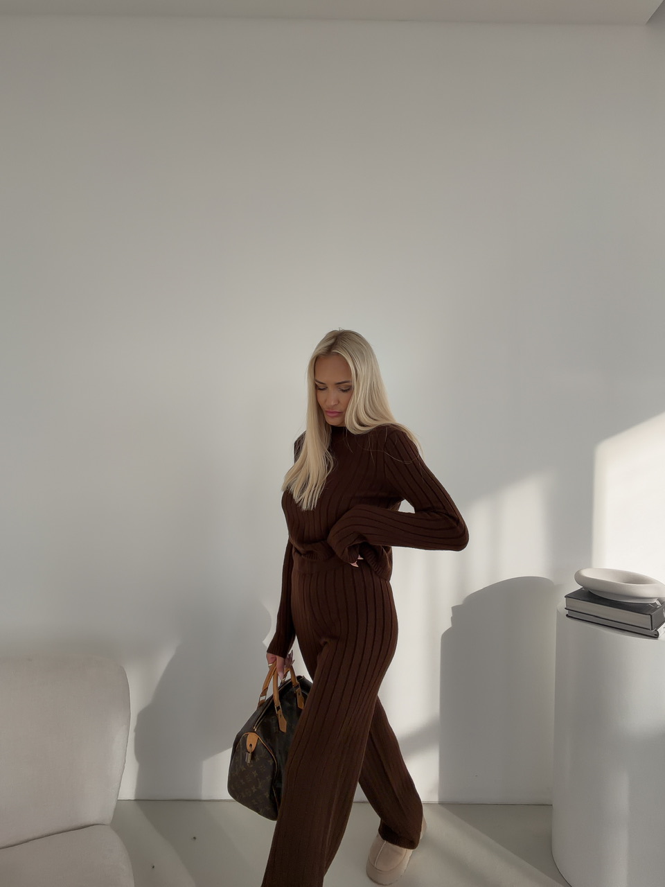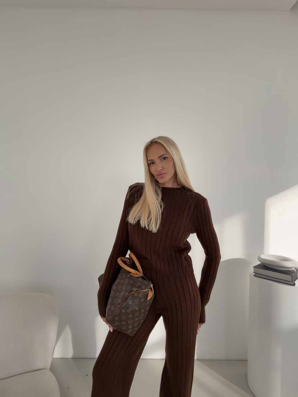 Štýlový komplet spája pohodlie s moderným dizajnom. Nohavice s elastickým pásom na gumu sú dlhšieho strihu a poskytujú voľnosť pohybu a maximálne pohodlie počas celého dňa. Sveter s okrúhlym výstrihom dodáva outfitu nadčasový vzhľad a ľahko sa kombinuje s ďalšími kúskami. Celý komplet je ideálny na každodenné nosenie, či už doma, v práci alebo na voľný čas, a ponúka praktický a zároveň elegantný look.