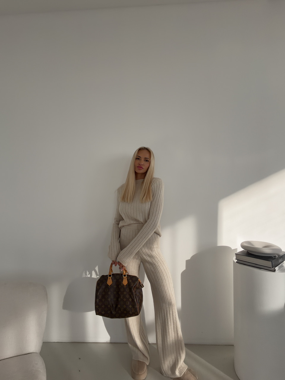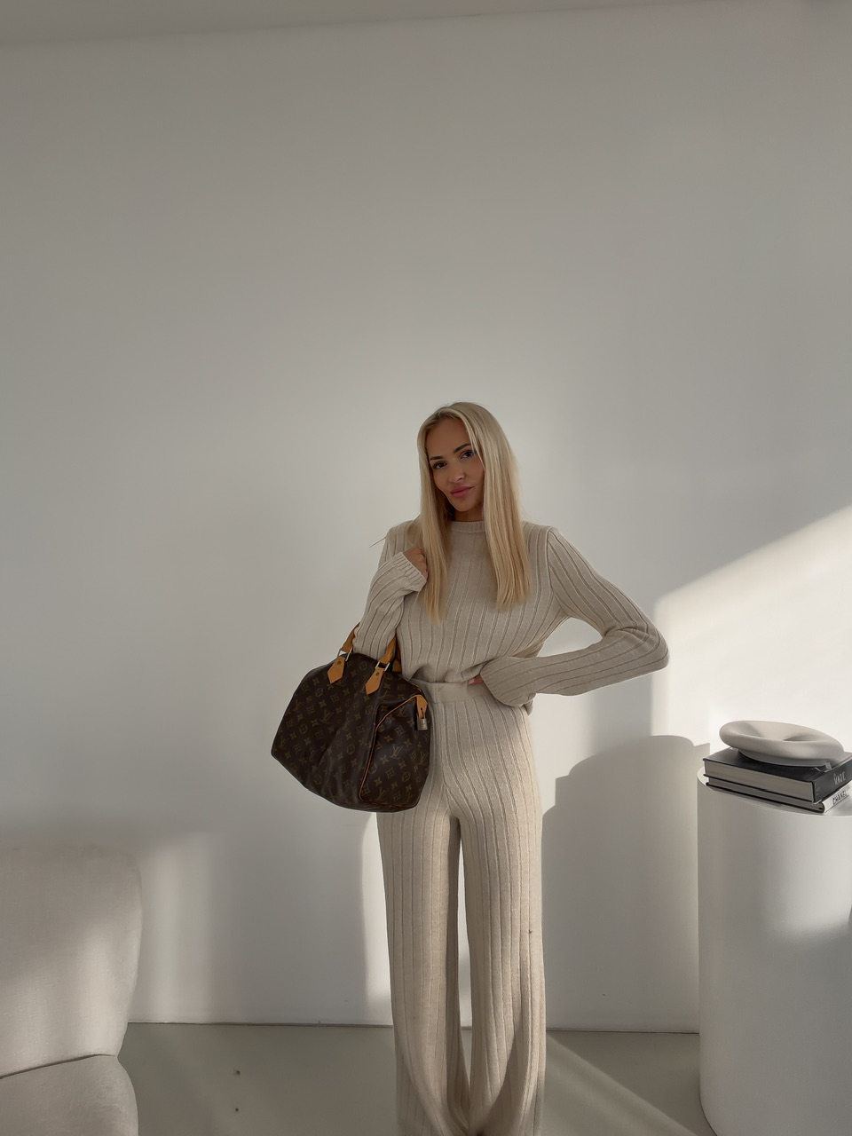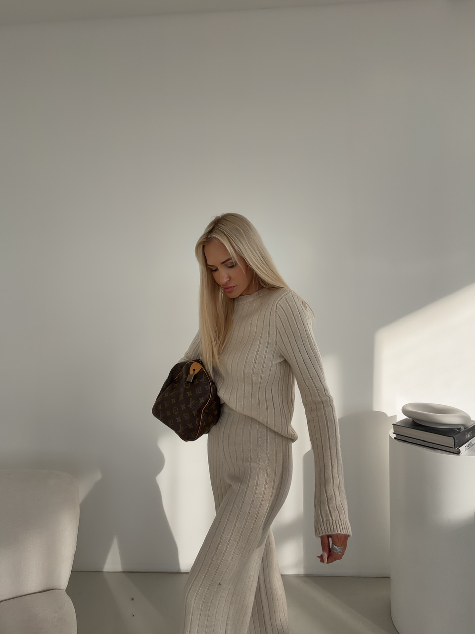 Štýlový komplet spája pohodlie s moderným dizajnom. Nohavice s elastickým pásom na gumu sú dlhšieho strihu a poskytujú voľnosť pohybu a maximálne pohodlie počas celého dňa. Sveter s okrúhlym výstrihom dodáva outfitu nadčasový vzhľad a ľahko sa kombinuje s ďalšími kúskami. Celý komplet je ideálny na každodenné nosenie, či už doma, v práci alebo na voľný čas, a ponúka praktický a zároveň elegantný look.